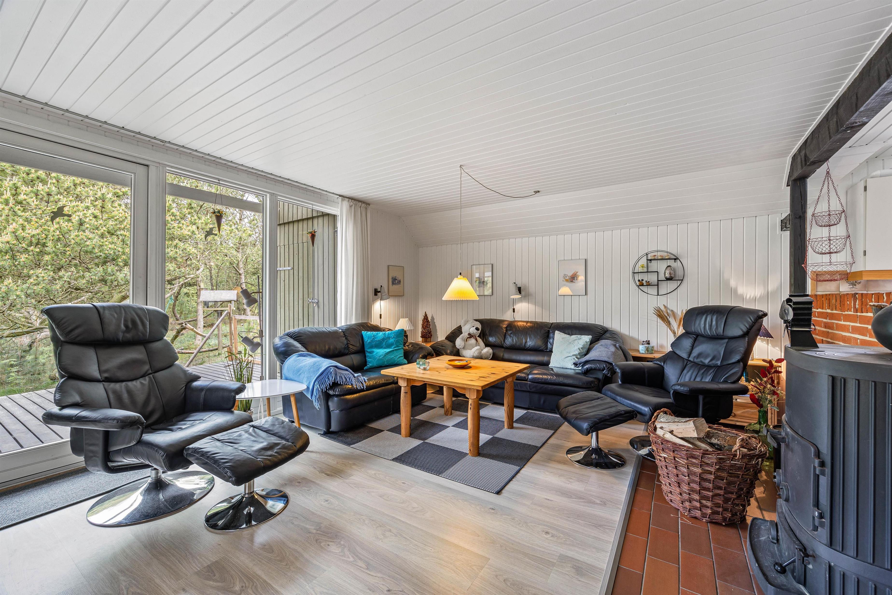 Sommerhuset er rigtig hyggeligt indrettet og emmer af charme og personlighed. De klassiske trævægge og trælofter sørger for en helt speciel feriestemning. Efter en lang dag ude i den friske luft, kan I trække tilbage til stuen, mens knitrende træ fra brændeovnen spreder varme i hele huset.