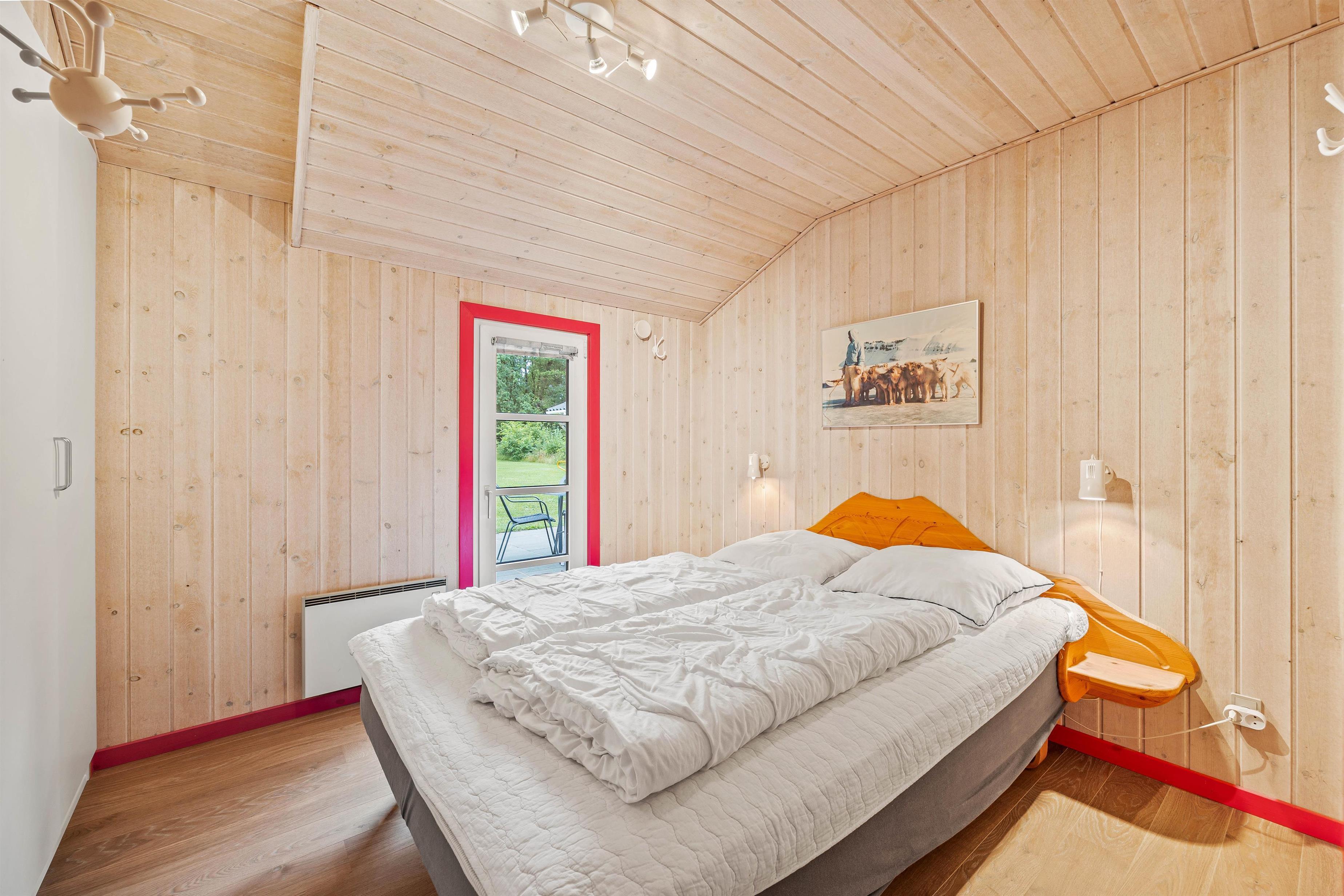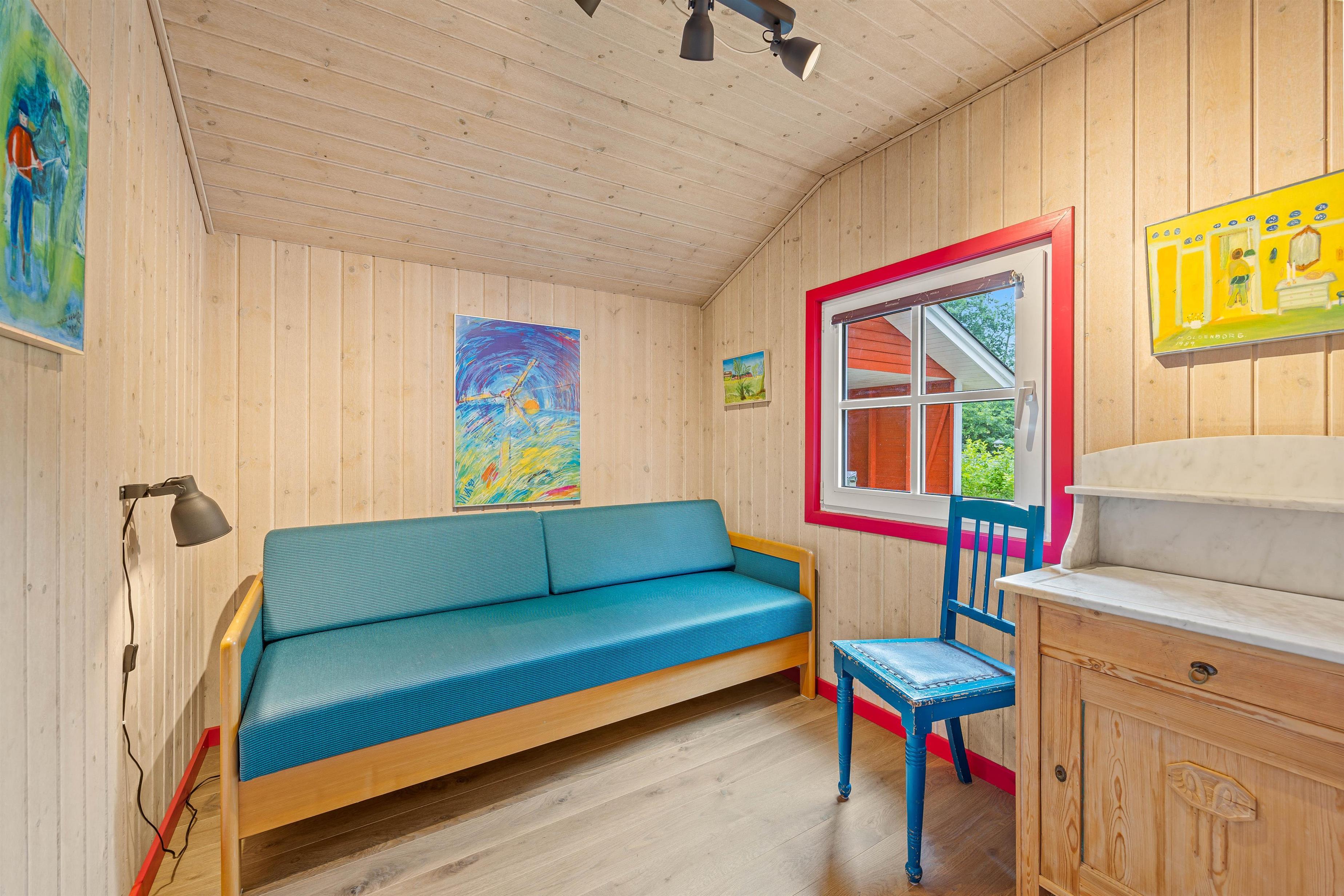 Som et maleri står det røde træhus i smukke grønne omgivelser, hvor træerne rækker op mod den lyseblå himmel. Her får I et lyst og lunt indrettet sommerhus med plads til hele familien, med masser af nye ferieminder i vente.