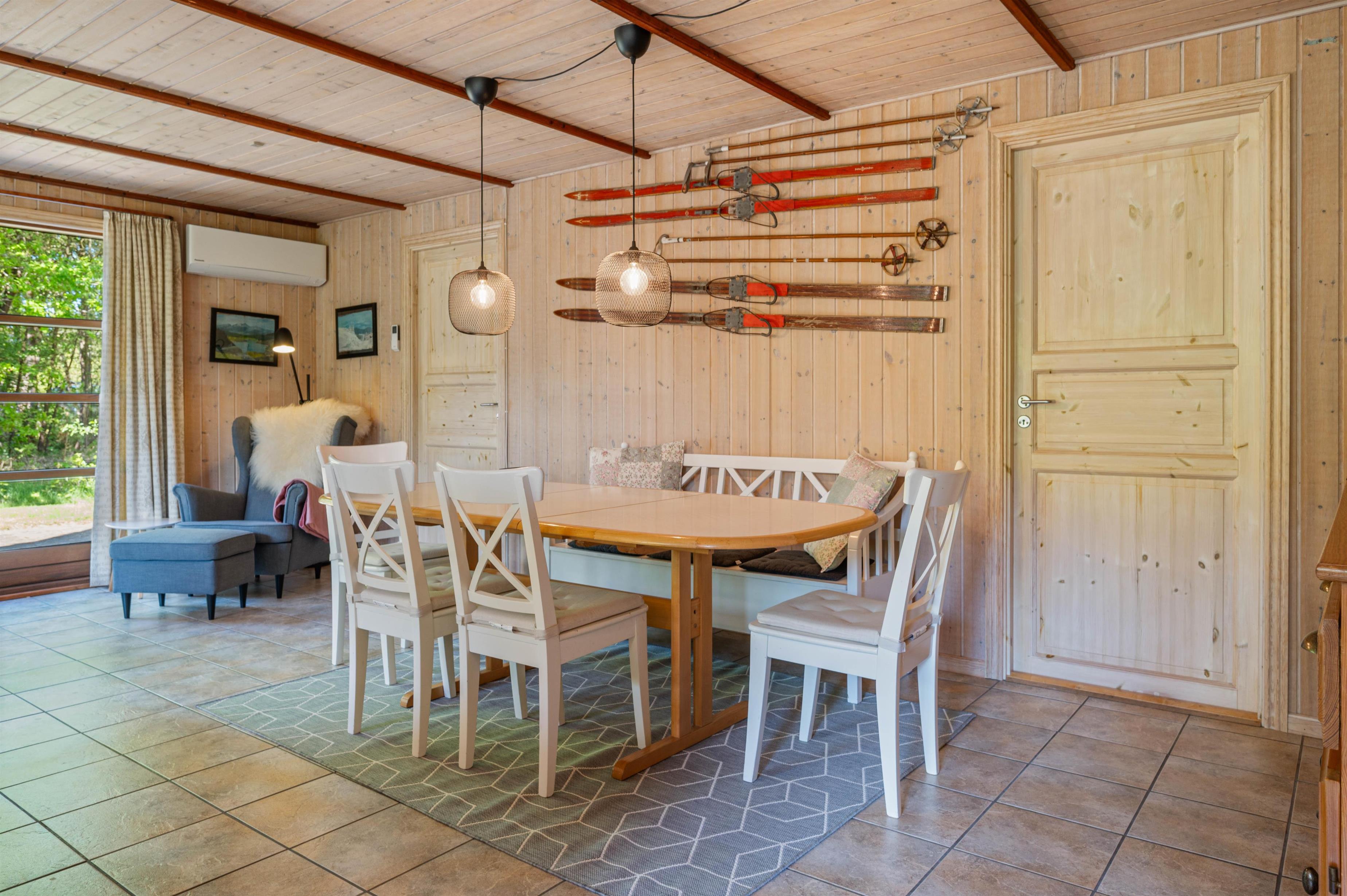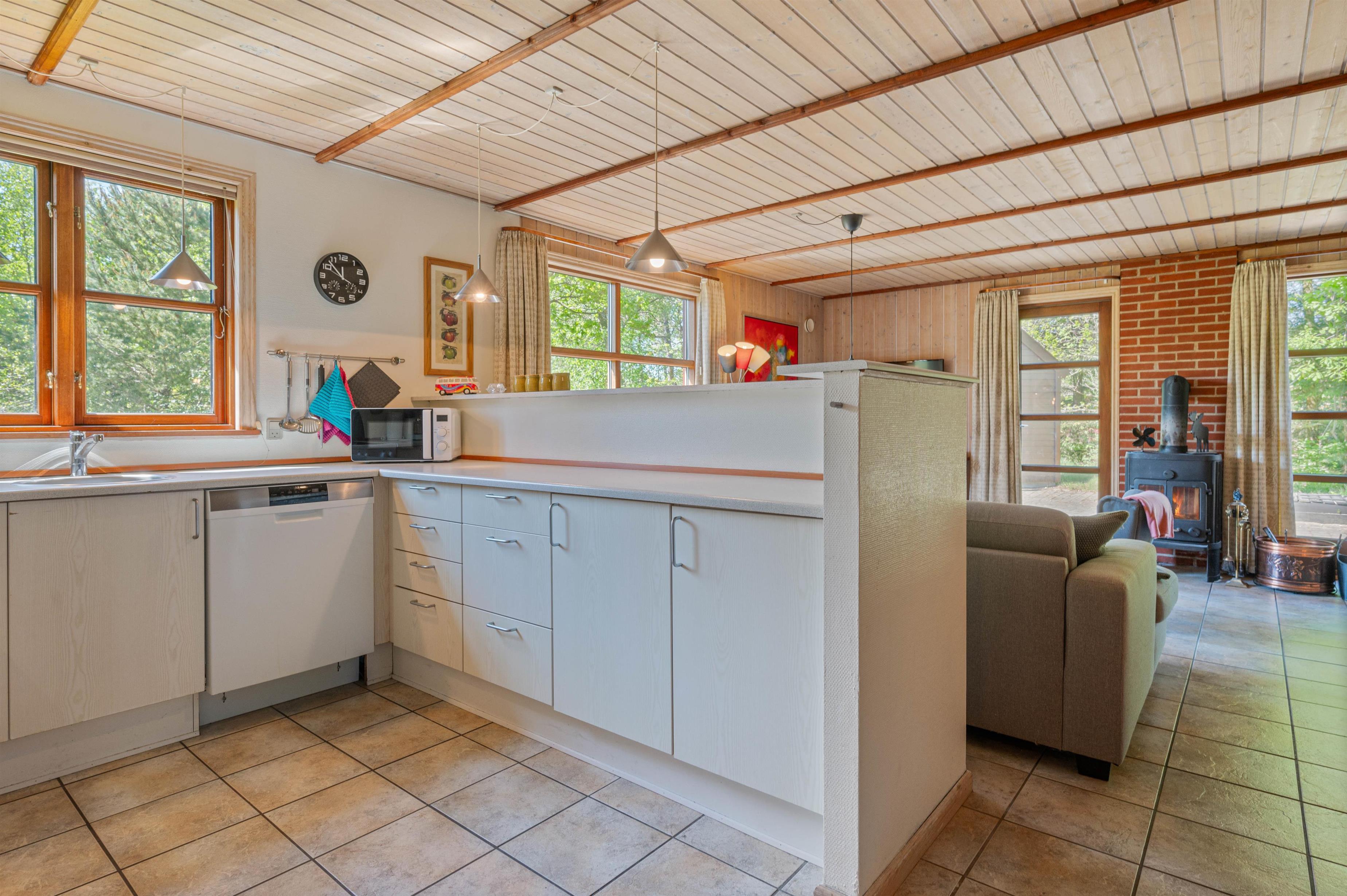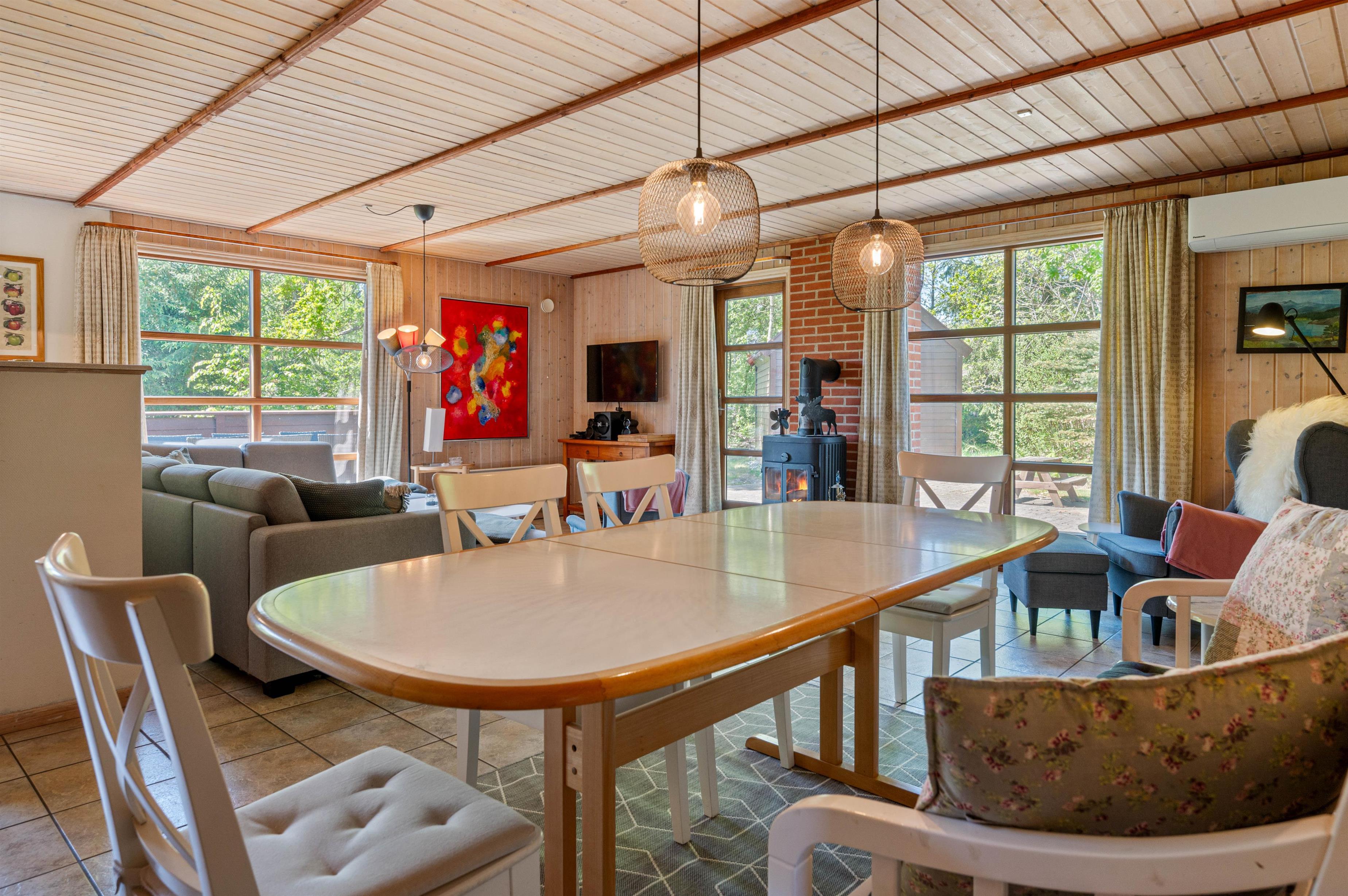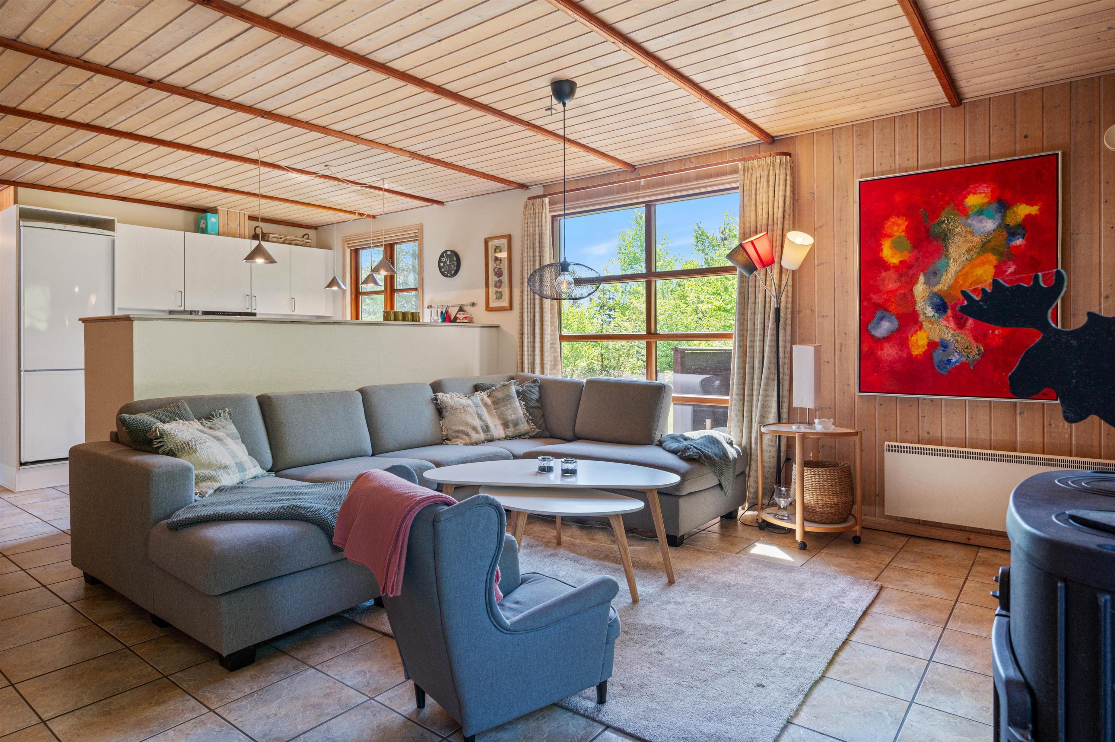 I opholdsrummet, hvor køkken og stue forenes i ét, er der lagt op til mange hyggelige stunder sammen som familie. Her kan I samles i køkkenet til hyggelig madlavning, i sofaen foran fjernsynet til en god film eller omkring spisebordet til et sjovt spil. For ekstra hygge kan I tænde op i brændeovnen, hvis knitren sætter prikken over i’et i feriestemningen.
