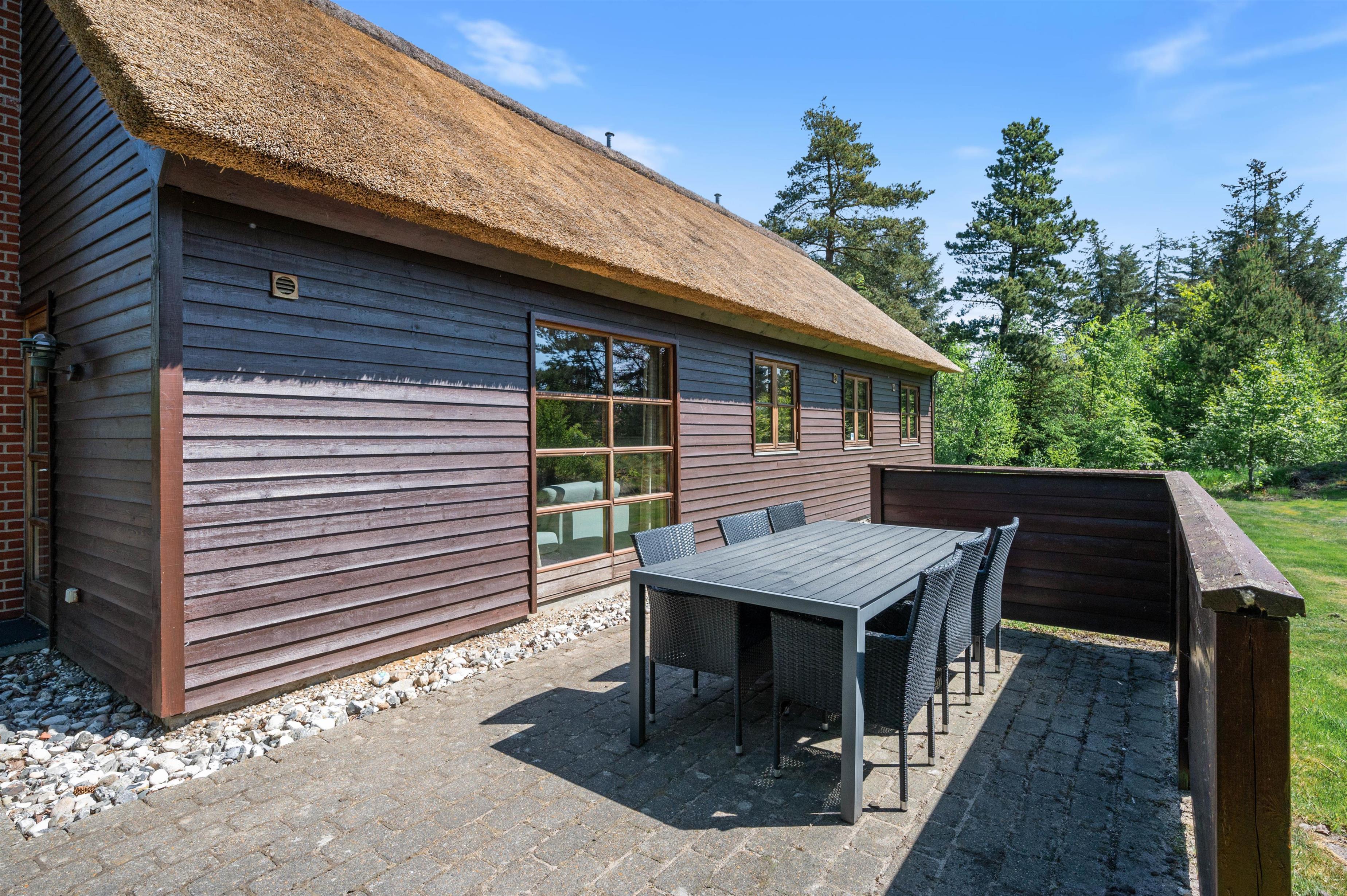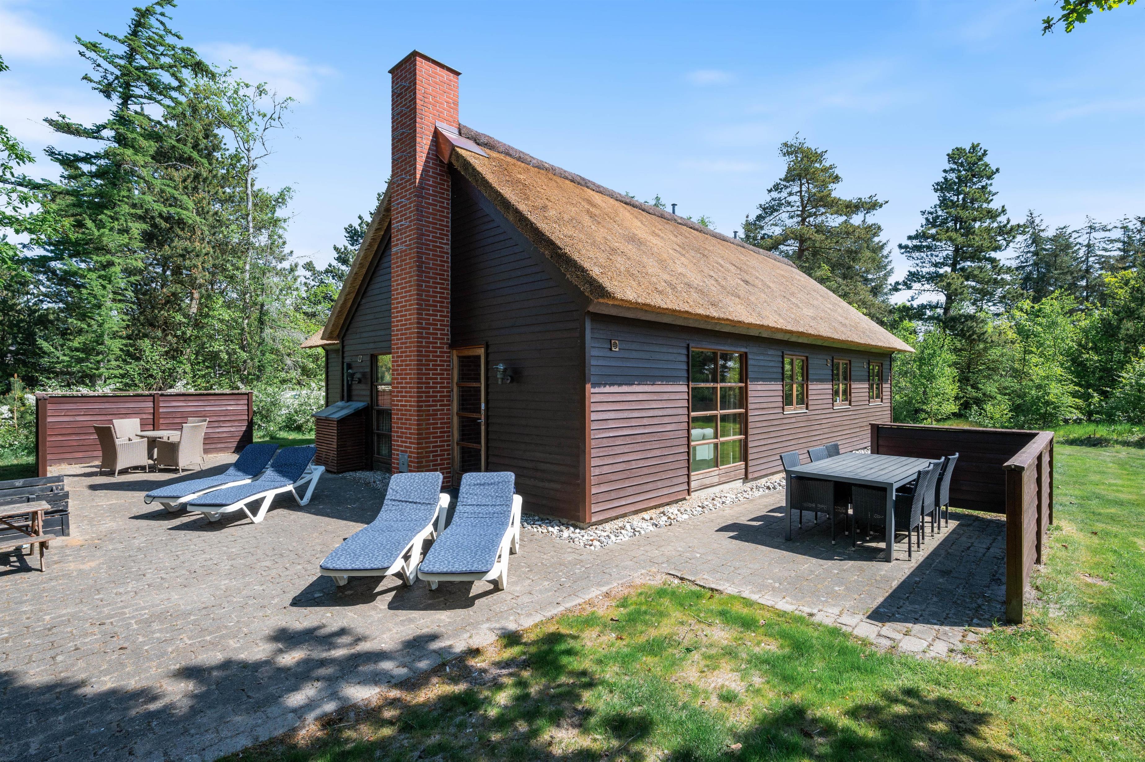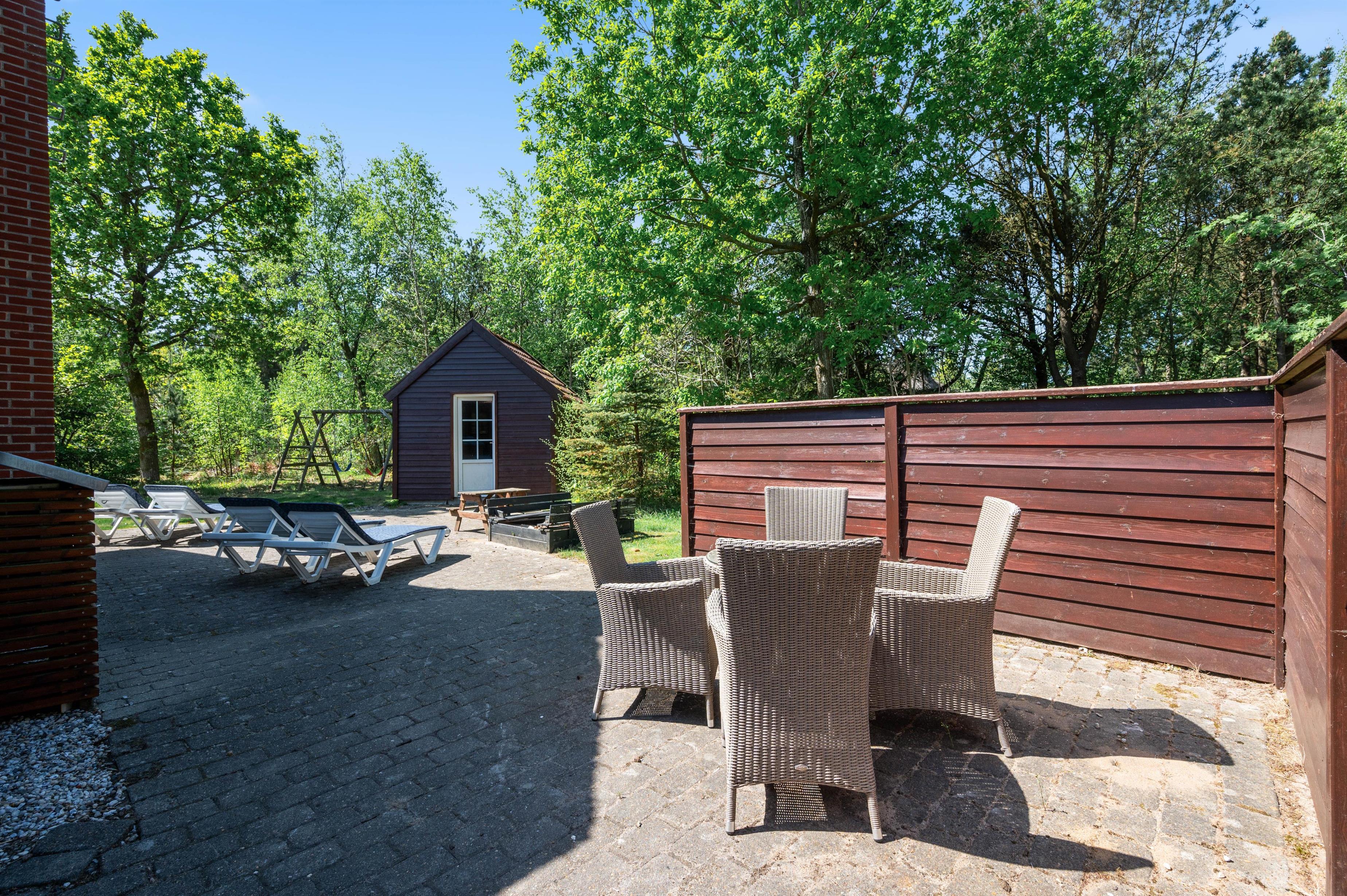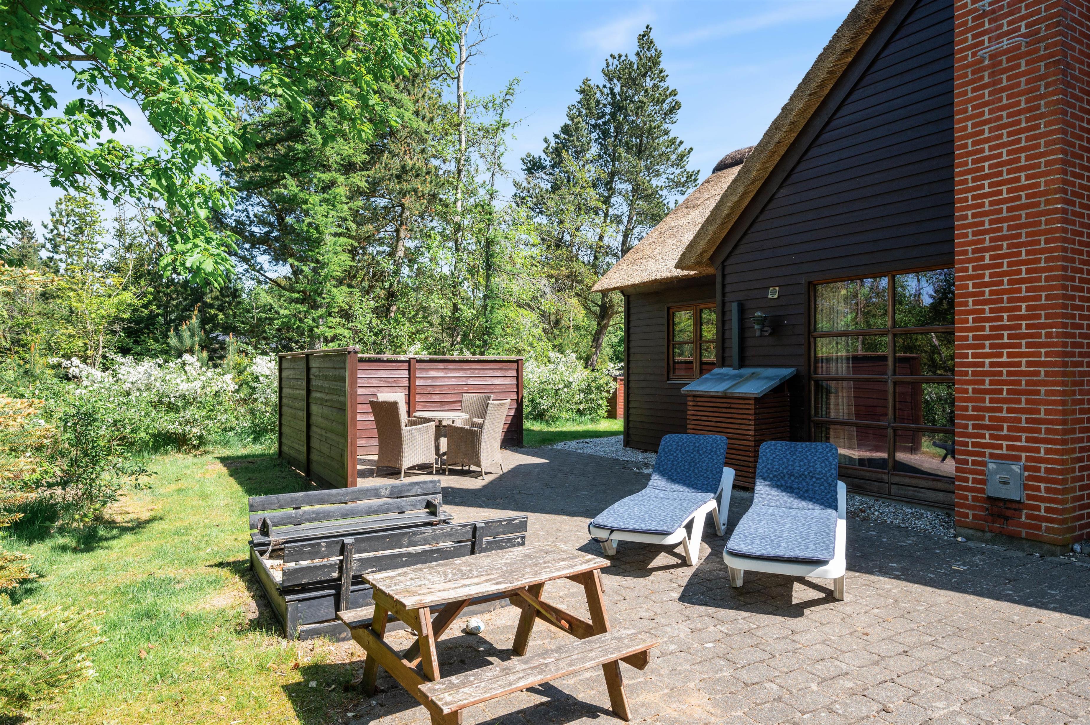 Omkring sommerhuset løber en stor, delvist afskærmet terrasse, hvor I har god plads at tilbringe ferien udendørs på. Med liggestole, havemøbler og grill til rådighed kan I tilbringe ferien på terrassen fra morgenstund til sen aften. Sommerhusets grund er omgivet af træer, så I har masser af privatliv under ferien.
