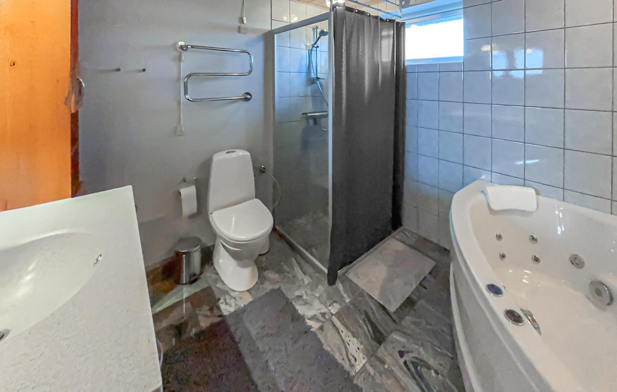 Træd ind i den lyse opholdsstue med store vinduer, en hyggelig sofa og en brændeovn. Nyd filmaftener sammen eller læn jer tilbage med en god bog. Brug det åbne køkken med rigelig arbejdsplads, moderne apparater og direkte adgang til spiseområdet til at lave mad sammen og nyde lange måltider. Læn jer tilbage i spabadet eller forkæl jer selv med behagelig varme i saunaen. Find en skøn oase i udestuen med de behagelige lænestole og nyd udsigten.