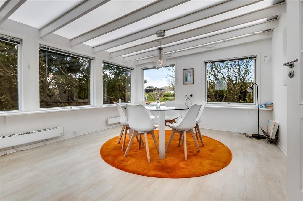Inden døre i det klassiske træsommerhus har I 113 m2 at brede jer på, så med andre ord har I god plads til otte personer. Fire soveværelser er ligeligt fordelt i begge ender af huset, og helt centralt ligger en dejlig stue med brændeovn, fladskærms-tv og komfortabelt møblement. Et moderne køkken er integreret i rummet, så I har ikke langt hen til kaffemaskinen, hvis I skal have endnu en kop, mens I hygger jer i sofaen. De sociale stunder kan også udspille sig i den helårsanvendelige udestue, og får I lyst til wellness og afslapning, er det perfekt, at det store badeværelse er udstyret med både spabad og sauna. Sommerhuset byder også på et gæstetoilet, så alt i alt egner planløsningen sig glimrende til to børnefamilier eller en parferie med gode venner.