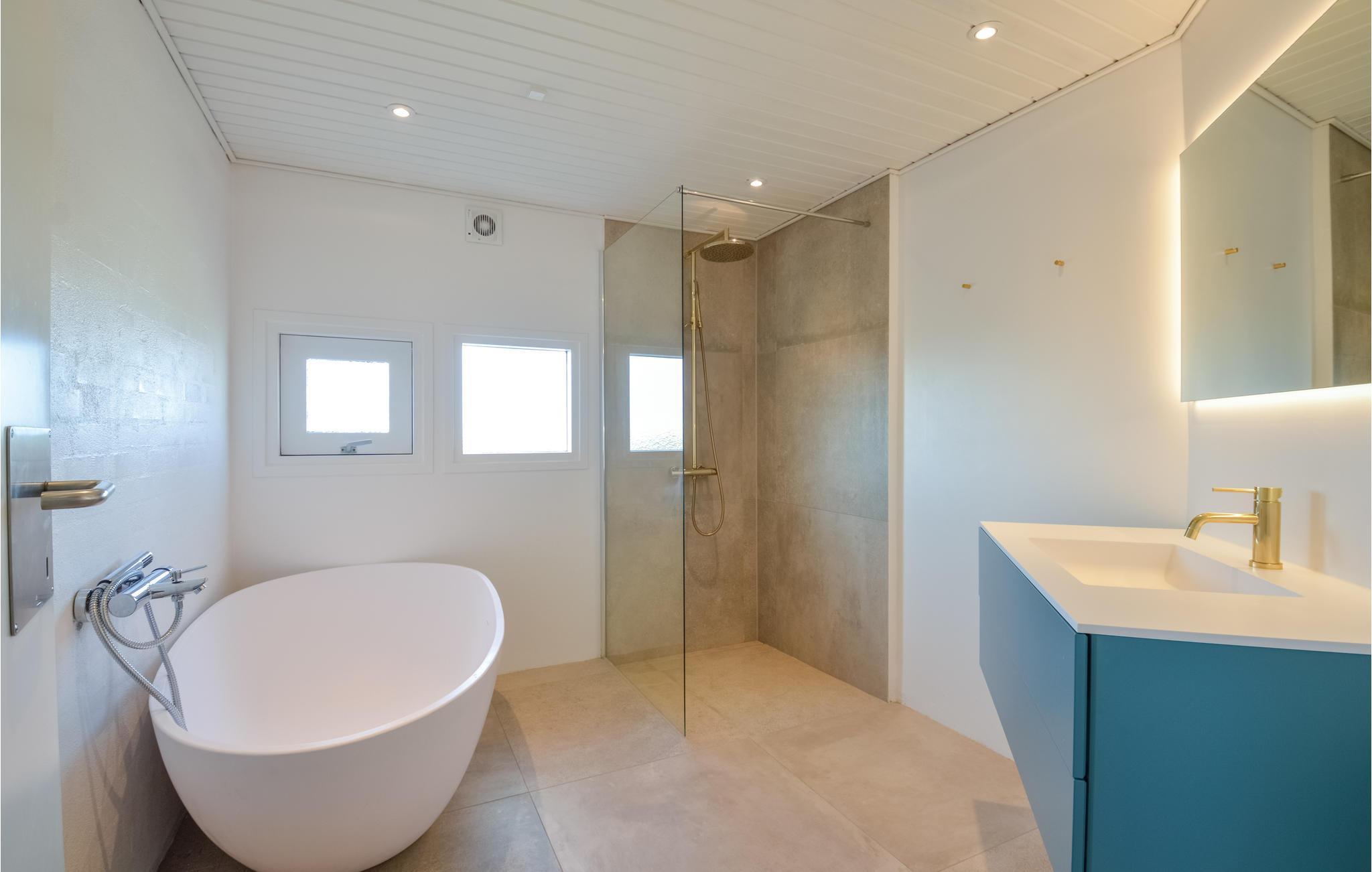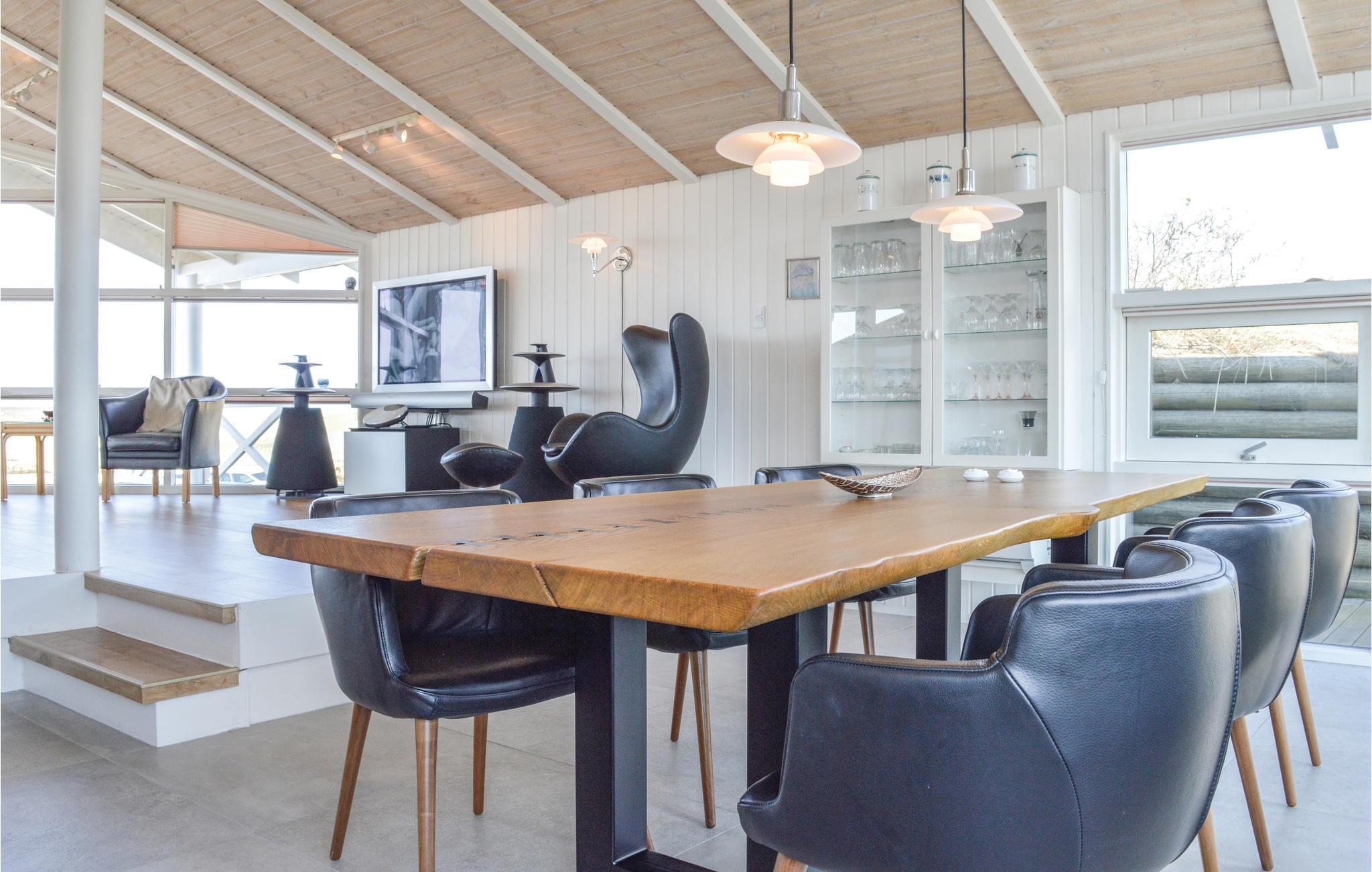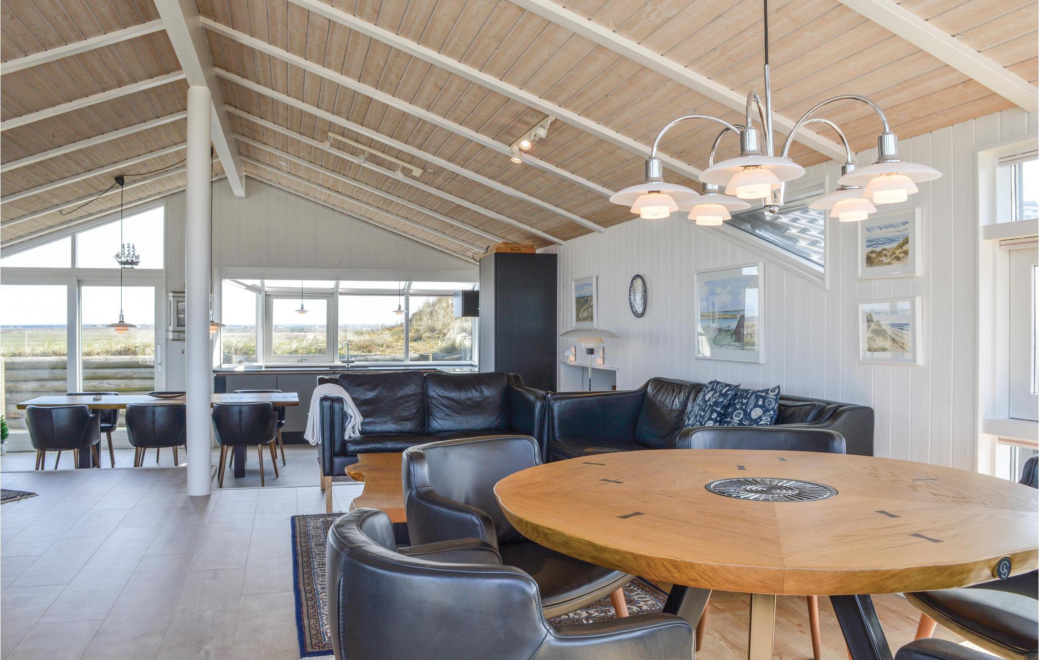 I dette luksuriøse, rigtig godt beliggende feriehus finder I alt til den perfekte ferie. Huset er omgivet af terrasser i forskellige niveauer, alle med en fantastisk udsigt over landskab, klitter, sommerhusområdet og til Vesterhavet. På den ene terrasse findes en standvandsspa og en udesauna, ligeledes med en fantastisk udsigt, så her er lagt op til mange timers udendørs wellness efter en lang gåtur ved det brusende Vesterhav. Når I træder ind i huset, er det første I møder en flot gaspejs, der styres via en fjernbetjening. I den ene ende af huset ligger soveværelserne. Et af de fire soveværelser er et master bedroom med tilhørende badeværelse, dertil kommer endnu et badeværelse med både bruser og et eksklusivt badekar.