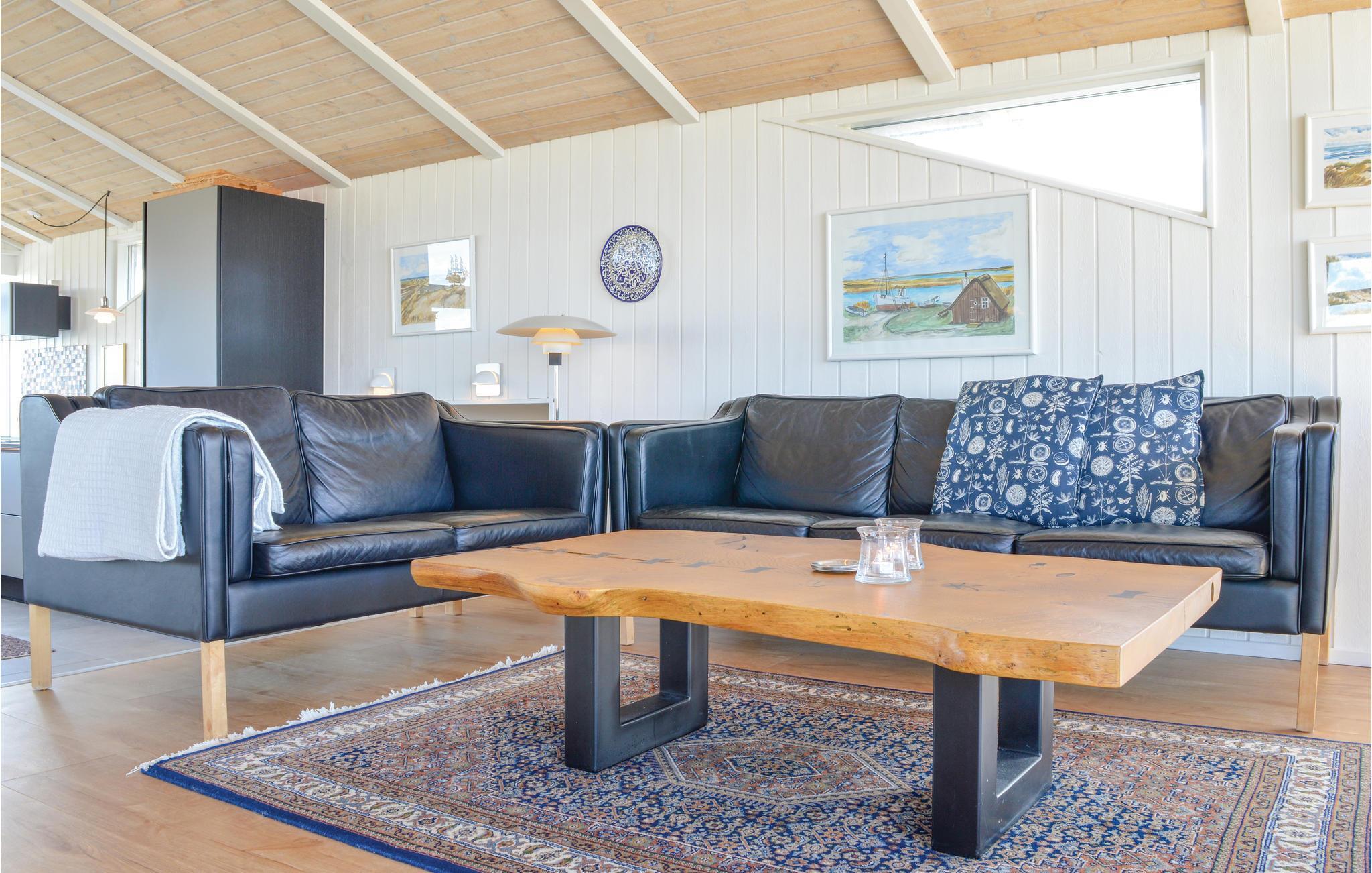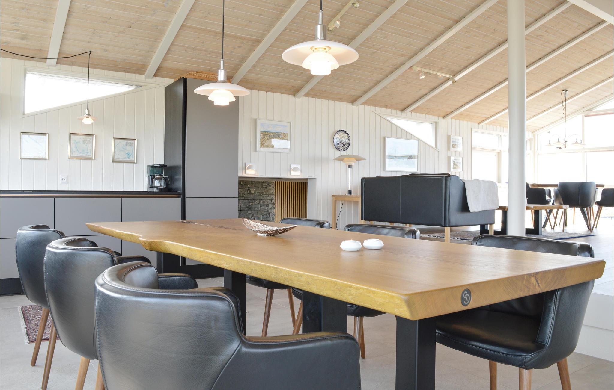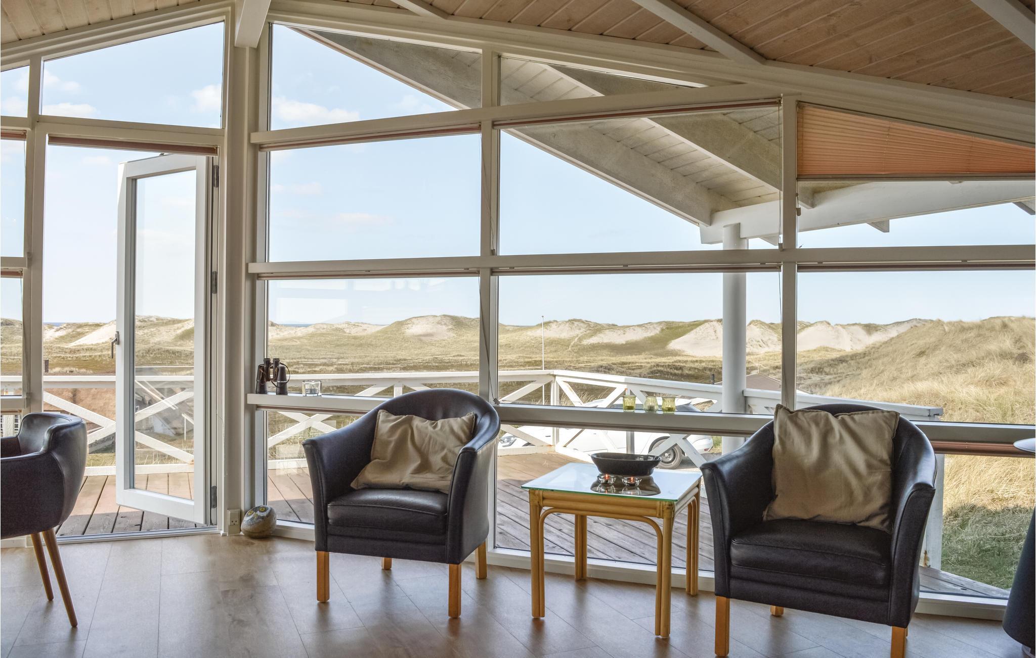 I den anden ende af huset, i forskudte plan ligger det store, flotte køkken med mange fine detaljer, bl.a. er der indbygget lys over de skjulte håndtag i køkkenlågerne. Opvasken behøver ikke længere være en sur pligt, når I samtidig kan stå og kigge ud over det flotte landskab. Husets stue ligger lige et par trin højere end køkken og spiseområde, og herfra er der ligeledes en fantastisk udsigt over klitter og helt til havet. I stuen er der tænkt på alle detaljer med designermøbler, stort tv og musikanlæg der har en vidunderlig lyd. Feriehuset ligger kun få kilometers afstand fra badebyen Søndervig.