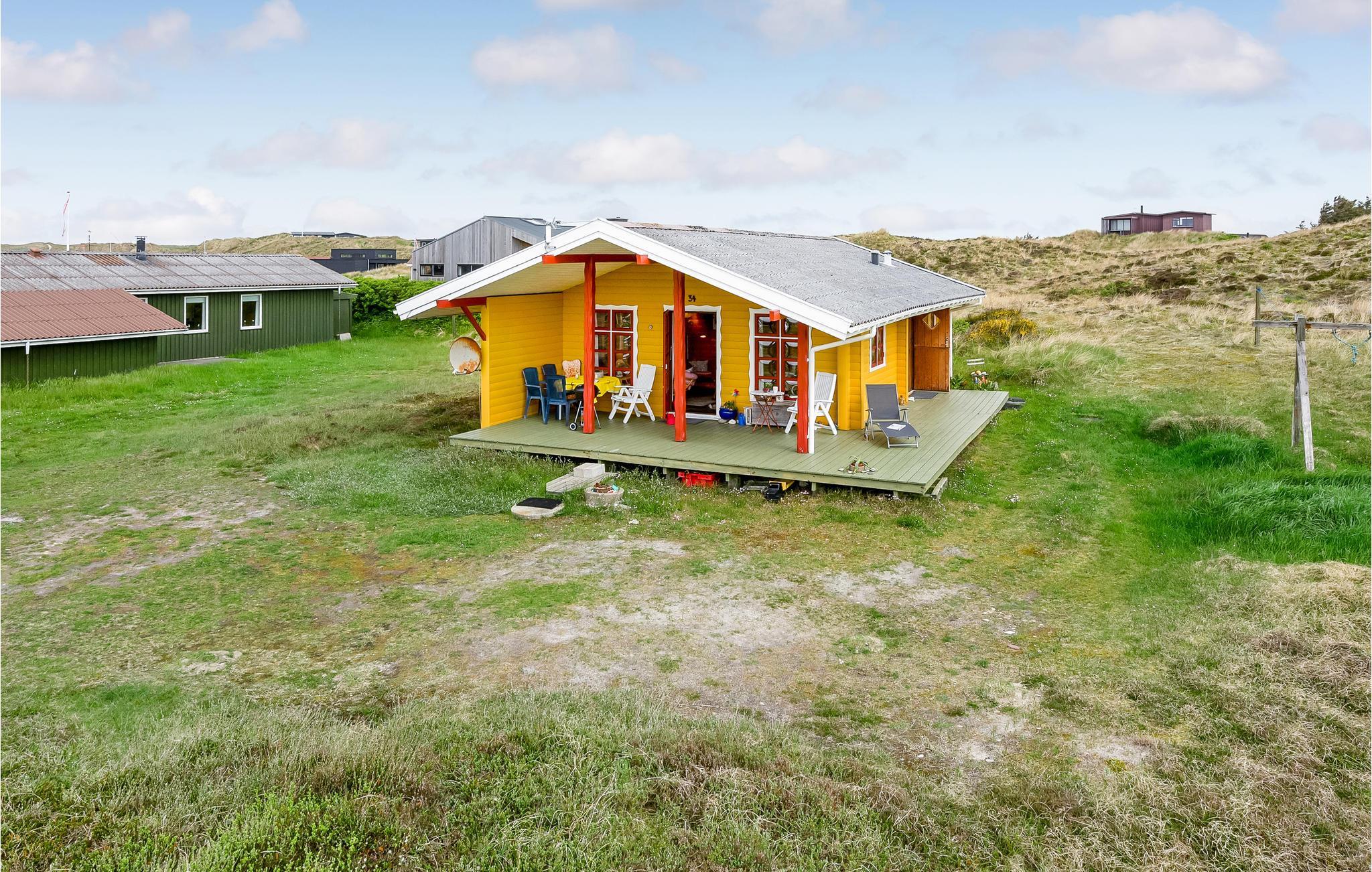 Hyggeligt træsommerhus med overdækket terrasse nær havet i Houvig, perfekt til en klassisk dansk ferie ved Vesterhavet.