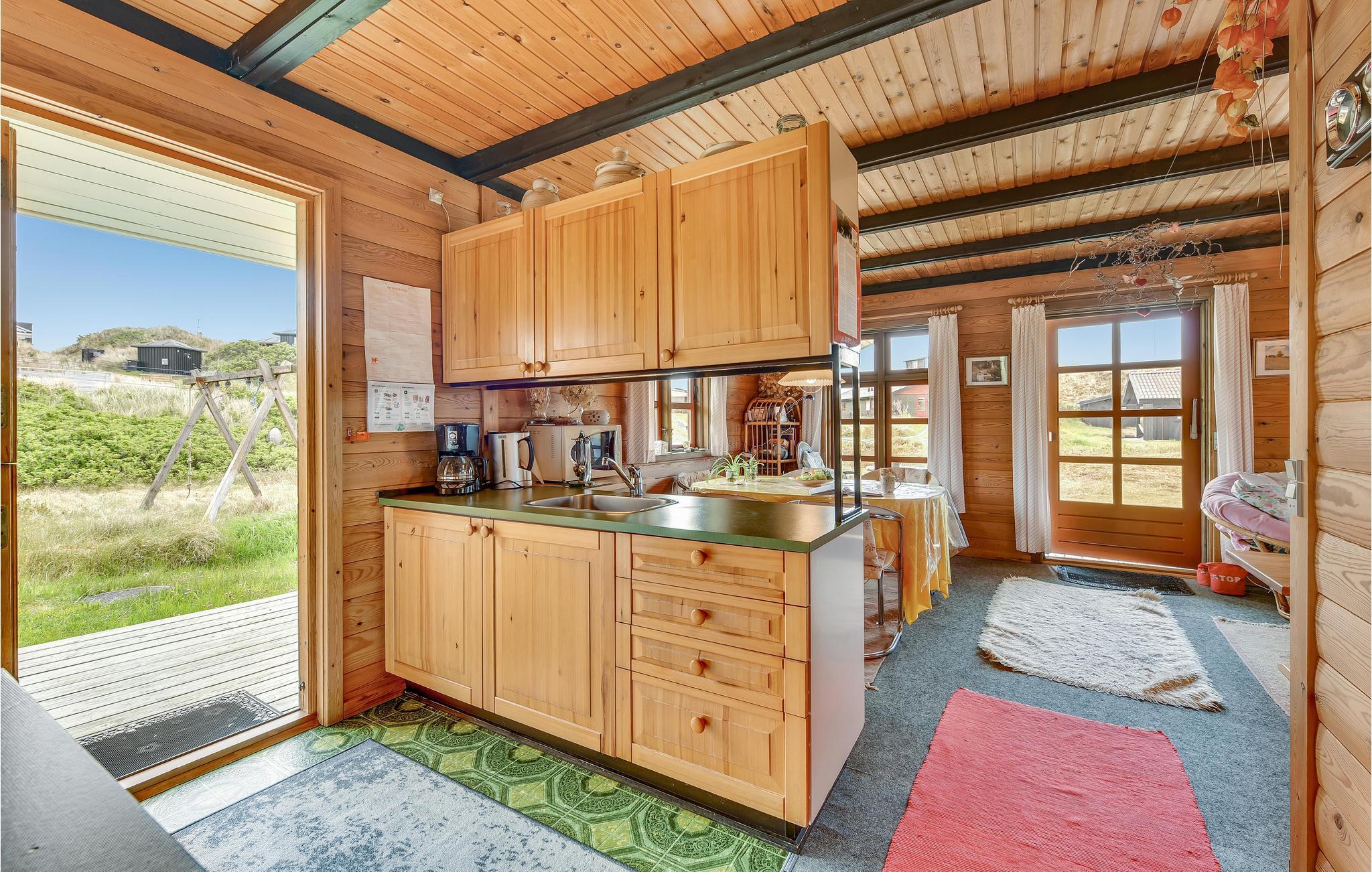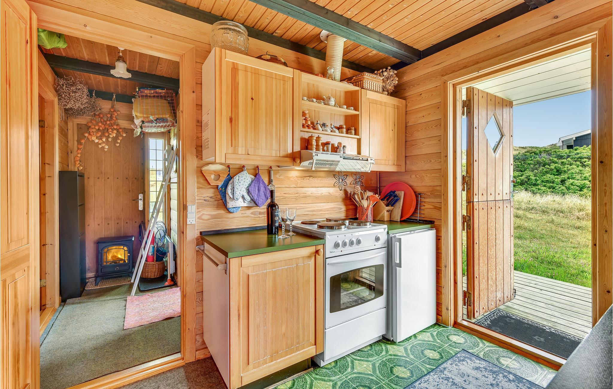 Med sine træbeklædte vægge og hyggelige indretning kan I glæde jer til en klassisk dansk sommerhusferie. Den åbne indretning lader jer tilbringe mange gode timer sammen mens nogle tilbereder feriens måltider i køkkenet og andre slapper af i opholdsstuen. Huset har desuden to soveværelser, hvoraf det ene er udstyret med en dobbeltseng med elevation, og det andet med køjesenge, som familiens yngste helt sikkert vil elske.