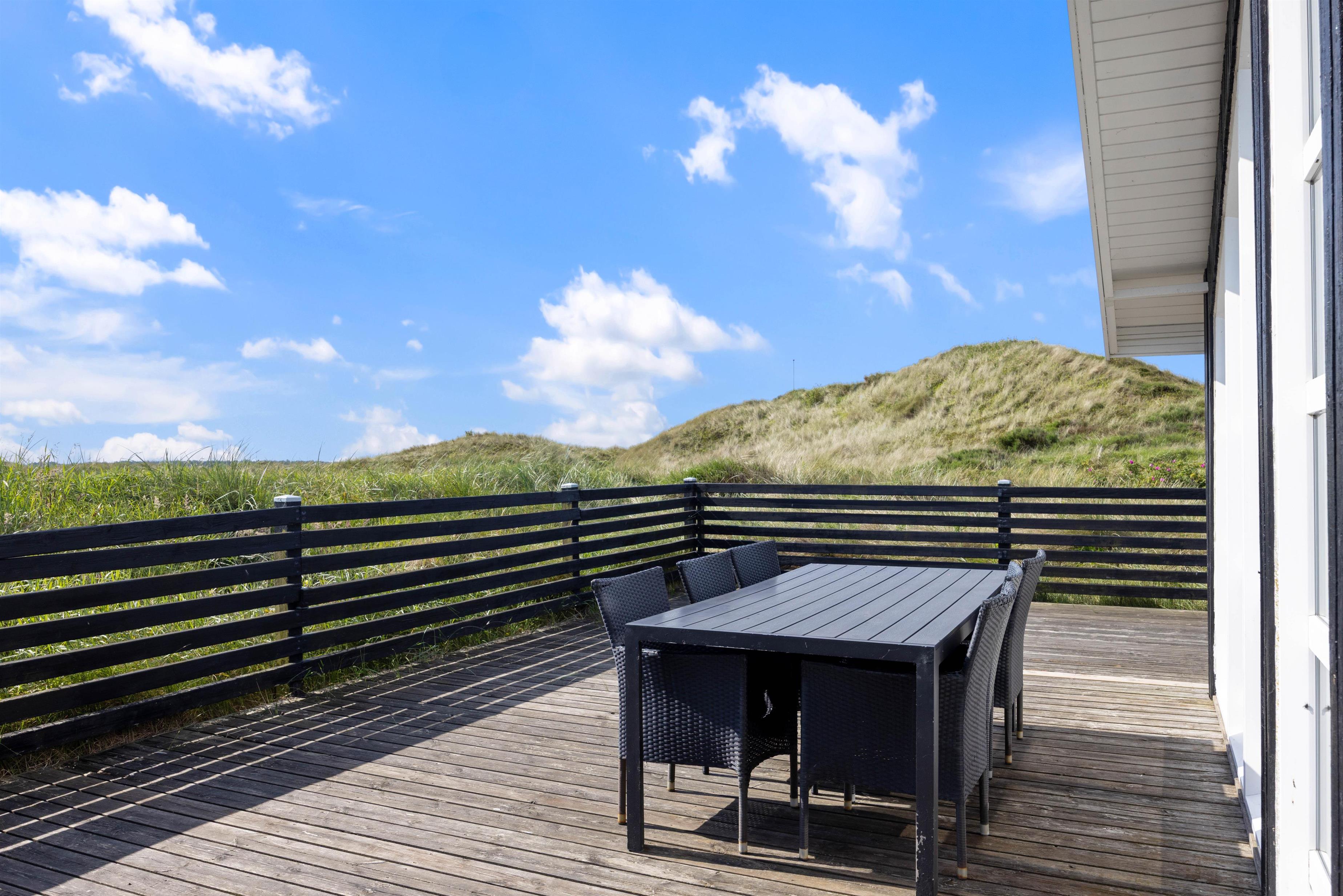 Omkring feriehuset er der gode terrasser, så I stortset altid kan finde en plads med læ. En stor del af terrassen er lukket helt af, så I sagtens kan lade børn og hunde gå rundt på egen hånd. Derudover er der også gynger og sandkasse på grunden, hvor børnene kan lege og bruge timevis af sjov.