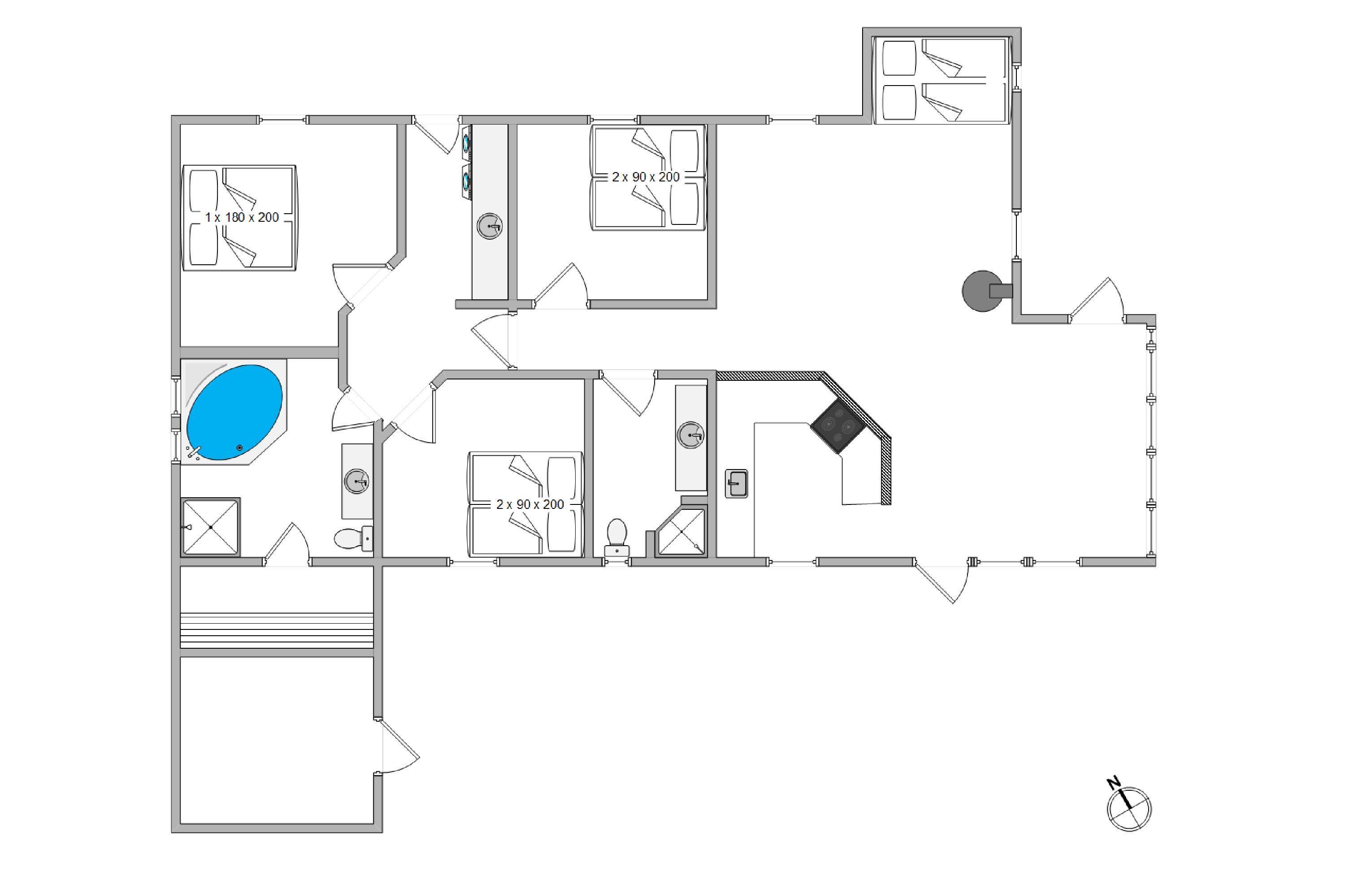 Feriehuset har 3 værelser, der alle er med dobbeltseng. På det ene af de 2 badeværelser er der desuden både spabad og sauna, hvor I rigtig kan forkæle både krop og sjæl efter en lang dag i den friske vestenvind. Sommerhuset er udstyret med en energivenlig luft-til-luft varmepumpe, der kan være med til at sørge for et godt indeklima hele året rundt.