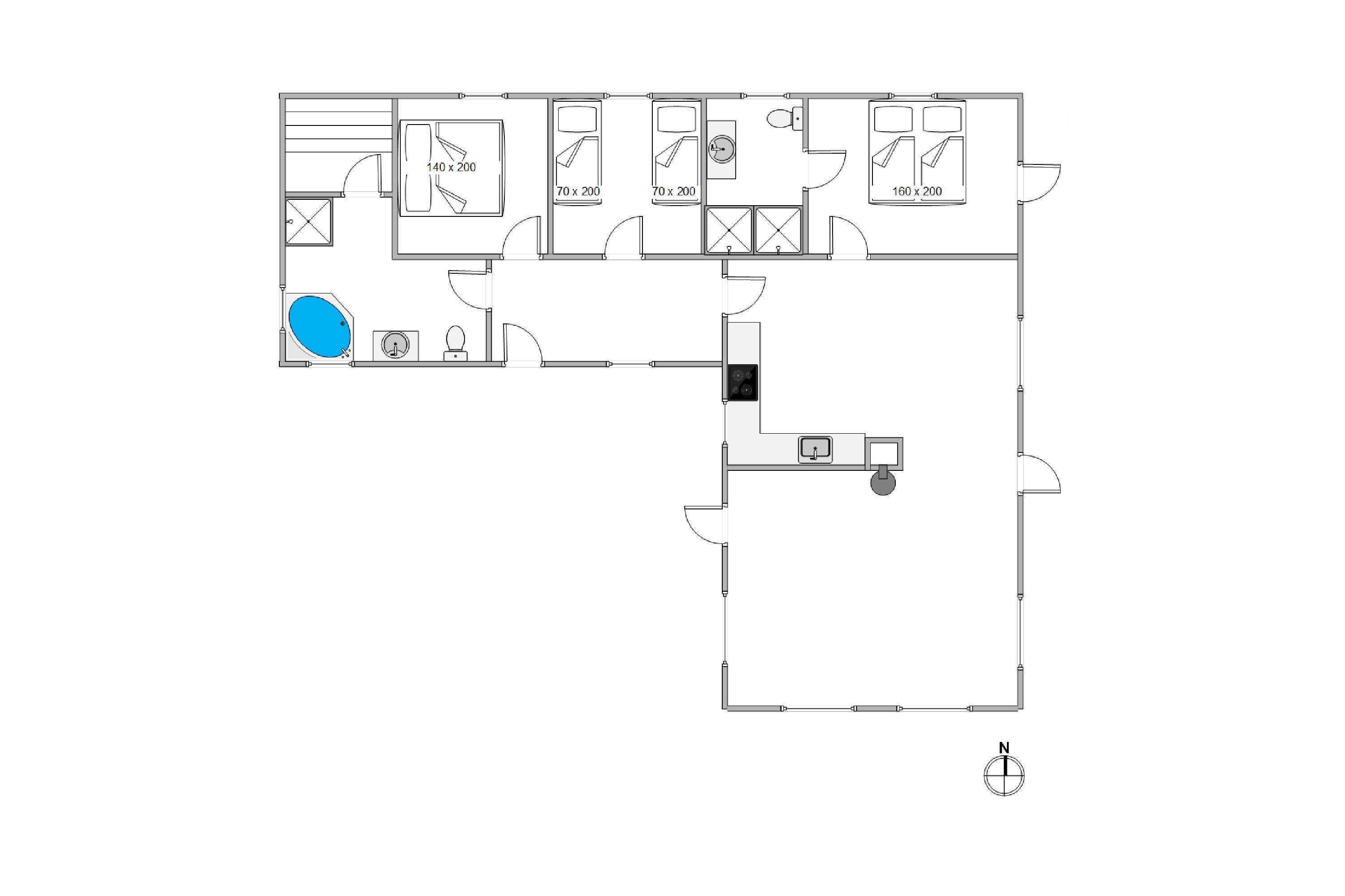 Feriehuset har 3 soveværelser, hvor 2 er med dobbeltseng. Det sidste værelse er med enkeltmandssenge, hvilket er oplagt til familiens børn. Desuden er huset oplagt til 2 familier, da der er 2 badeværelser, så hver familie kan få sit eget - begge med gulvvarme. Derudover er feriehuset indbygget med en hems, som helt sikkert vil blive et hit for ungerne.