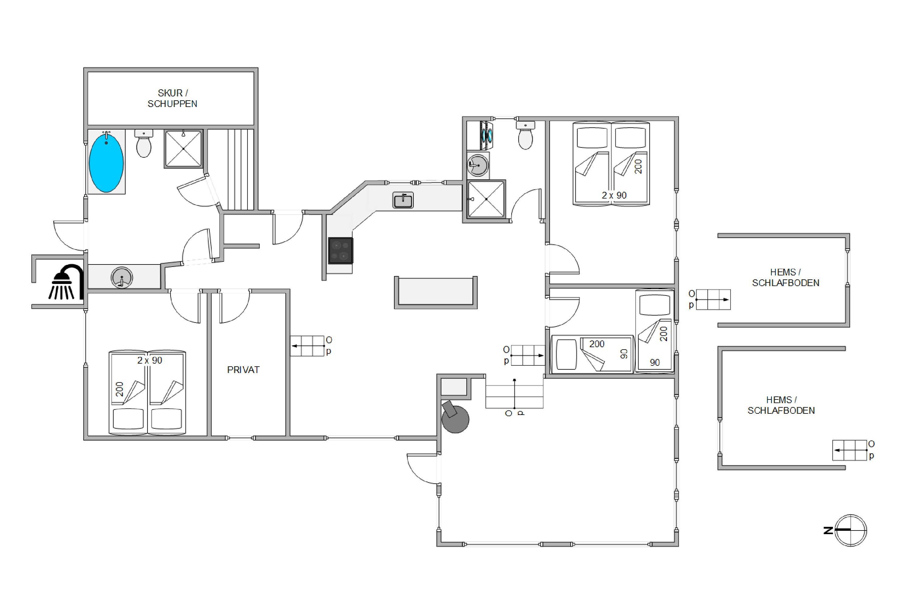Soveafdelingen i det 110m2 store feriehus fordeler sig på 3 soveværelser, hvor 2 af værelserne er udstyret med dobbeltseng, og det 3.værelse står klar med 2 enkeltsenge. Et specielt highlight i sommerhuset kunne for de yngre være de 2 tilhørende hemse, som er en oplagt soveplads for børnene. Disse ligger i forbindelse med feriehusets køkken og er et perfekt sted for de unge at kunne trække sig tilbage.
