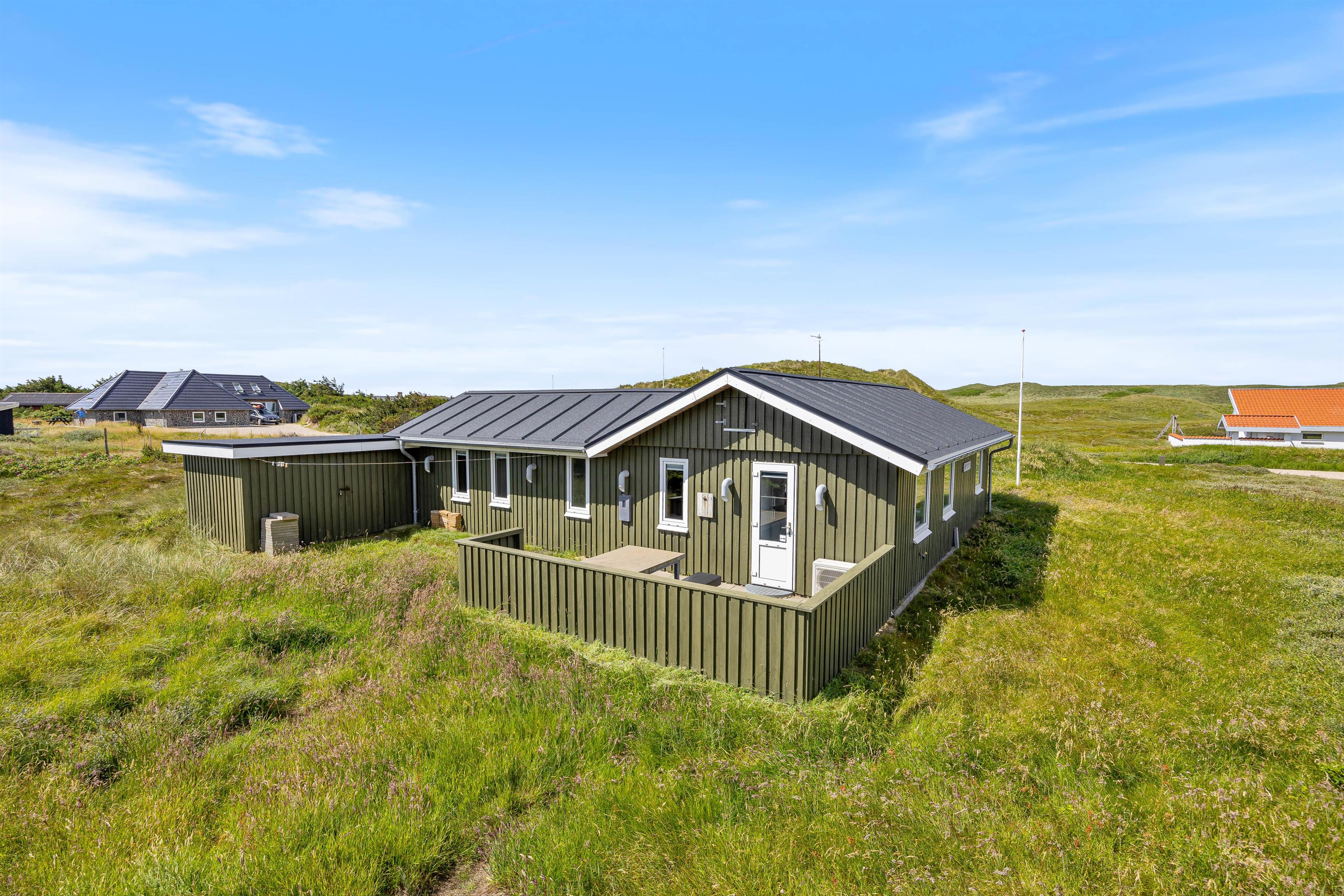 Med direkte udgang fra sommerhusets køkkenalrum, kommer I ud på en dejlig stor, afskærmet og lukket terrasse. Her har I mulighed for at nyde solen, og læne jer tilbage i feriehusets tilhørende havemøbler eller solsenge. Om aftenen, er det oplagt at tænde op for grillen, og tilberede et lækkert måltid til hele familien.