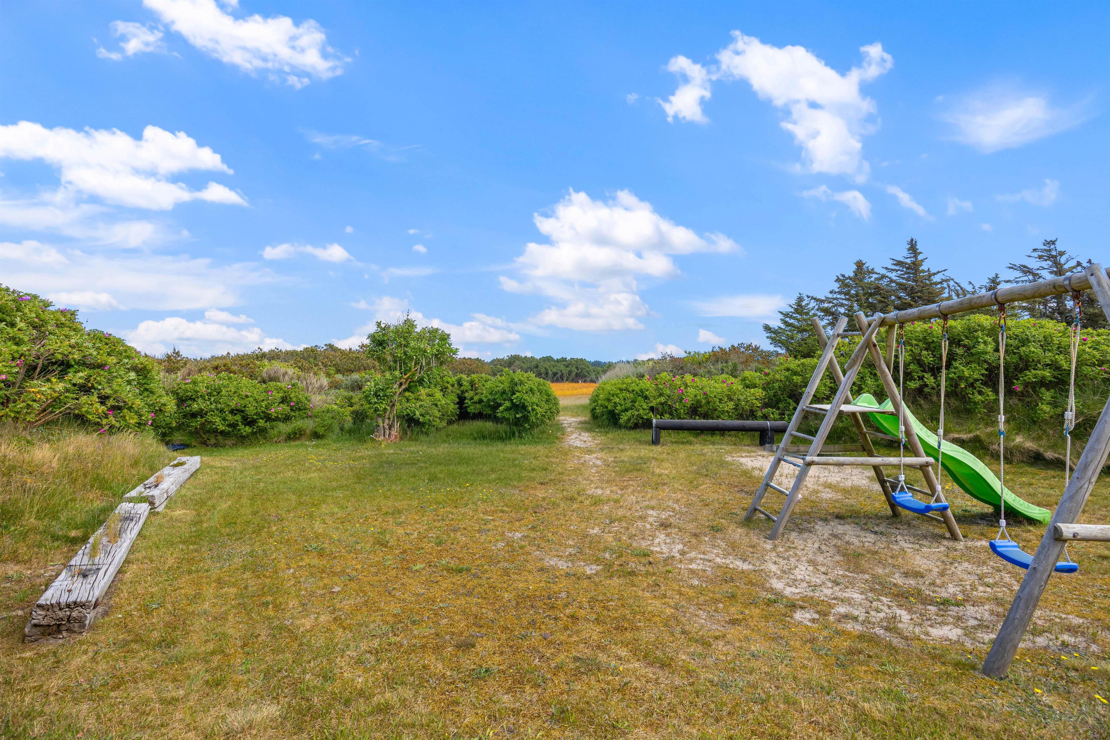 På grunden er der egen legeplads med legehus, gynger og sandkasse, og her kan ungerne boltre sig mens I kan sidde på terrassen og følge med i legen.