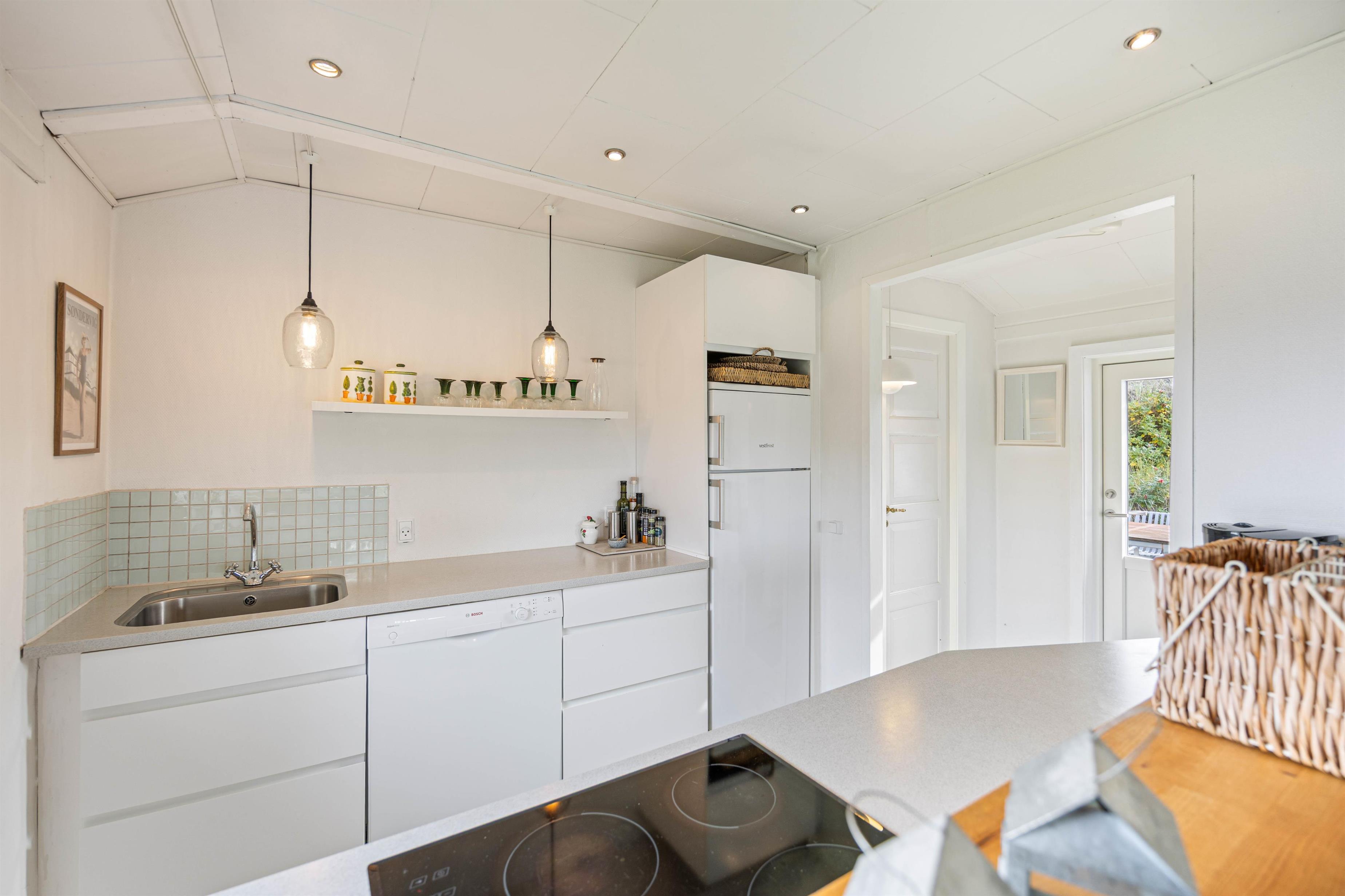 Sommerhusets køkken ligger i åben forbindelse med stuen, hvor store vinduer lukker solens lys og den flotte natur ind. På kolde dage kan I nyde godt af varmen fra brændeovnen, mens I slapper af på sofaen. I opholdsrummet går loftet hele vejen til kip, og oven i det er der også synlige egetræsbjælker, der alt I alt bidrager til en god og hyggelig indretning