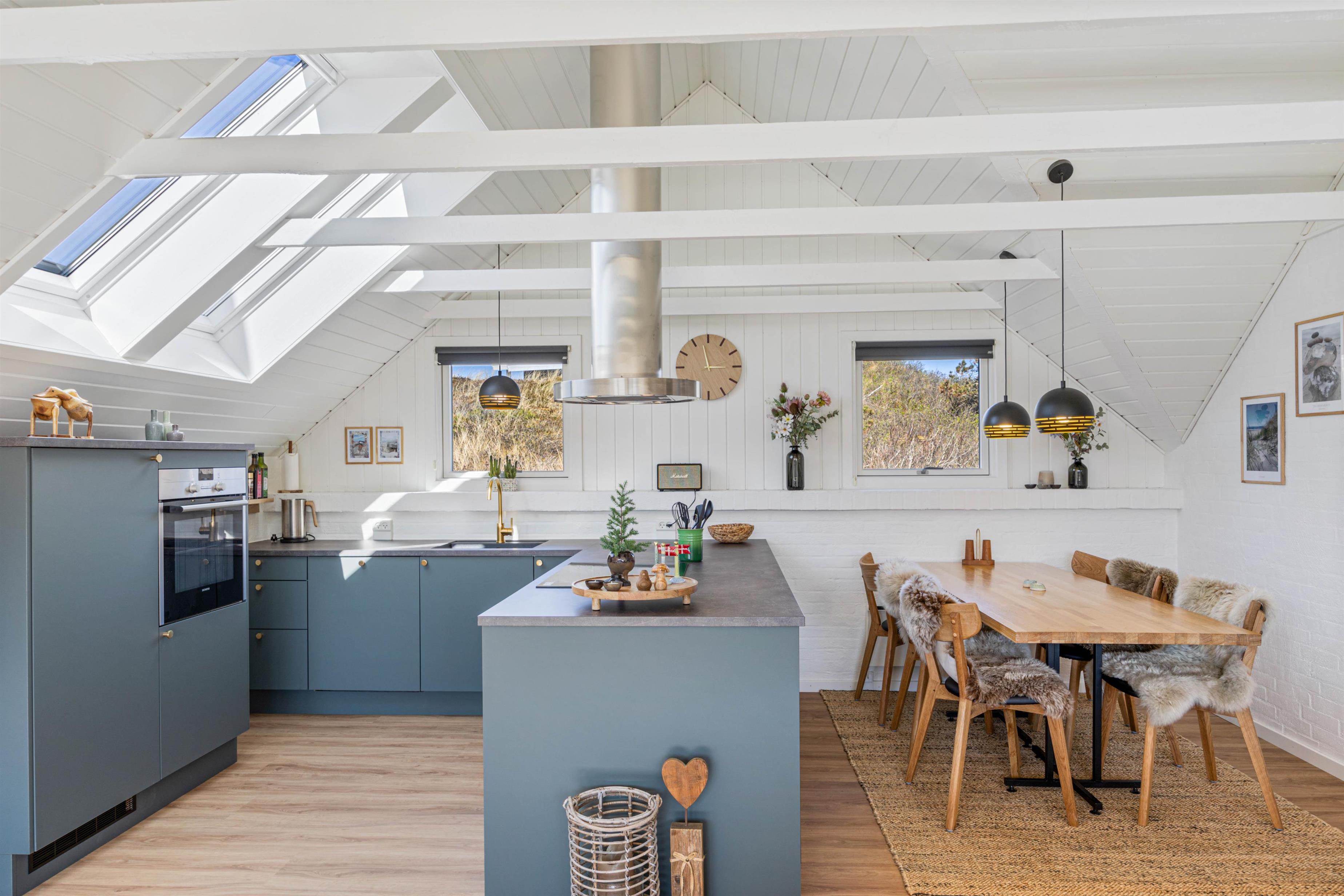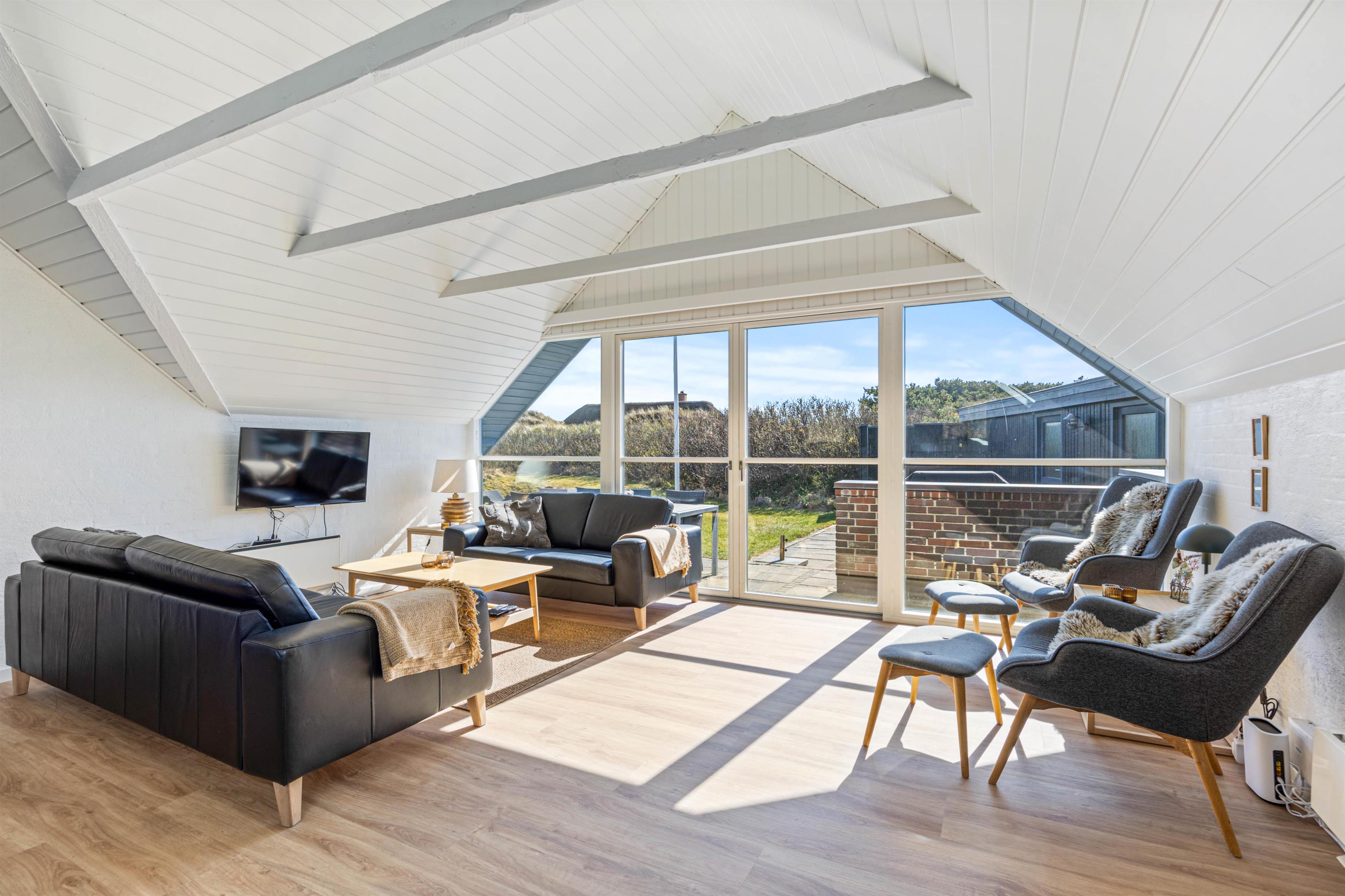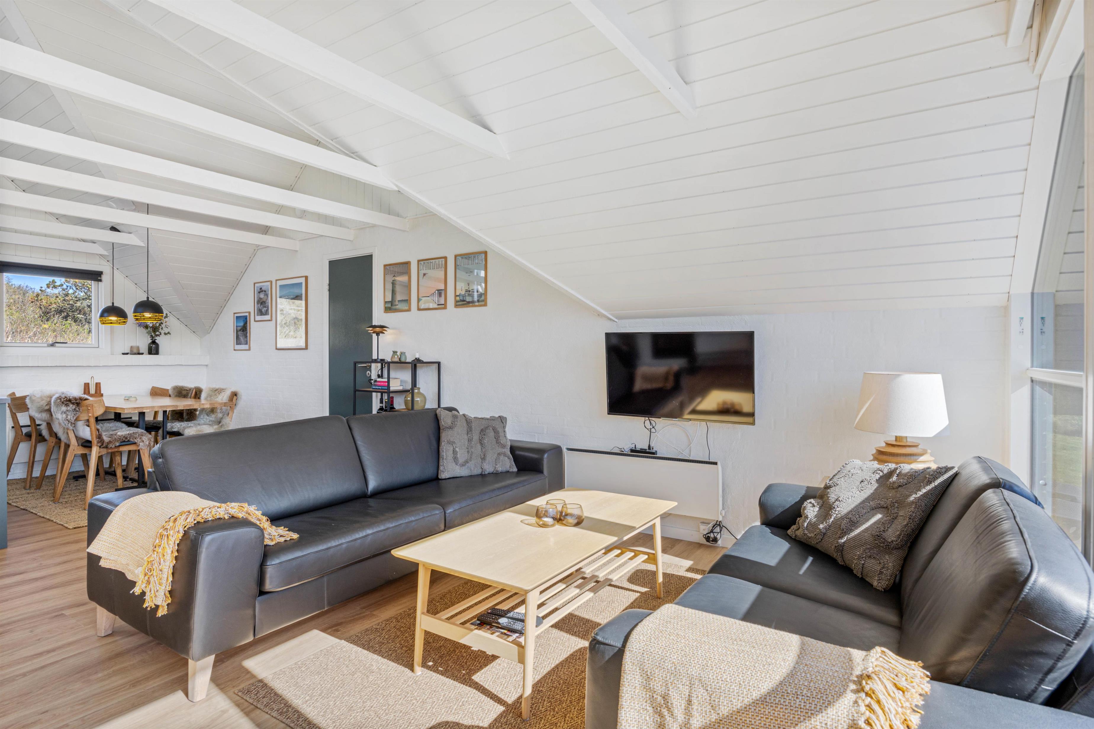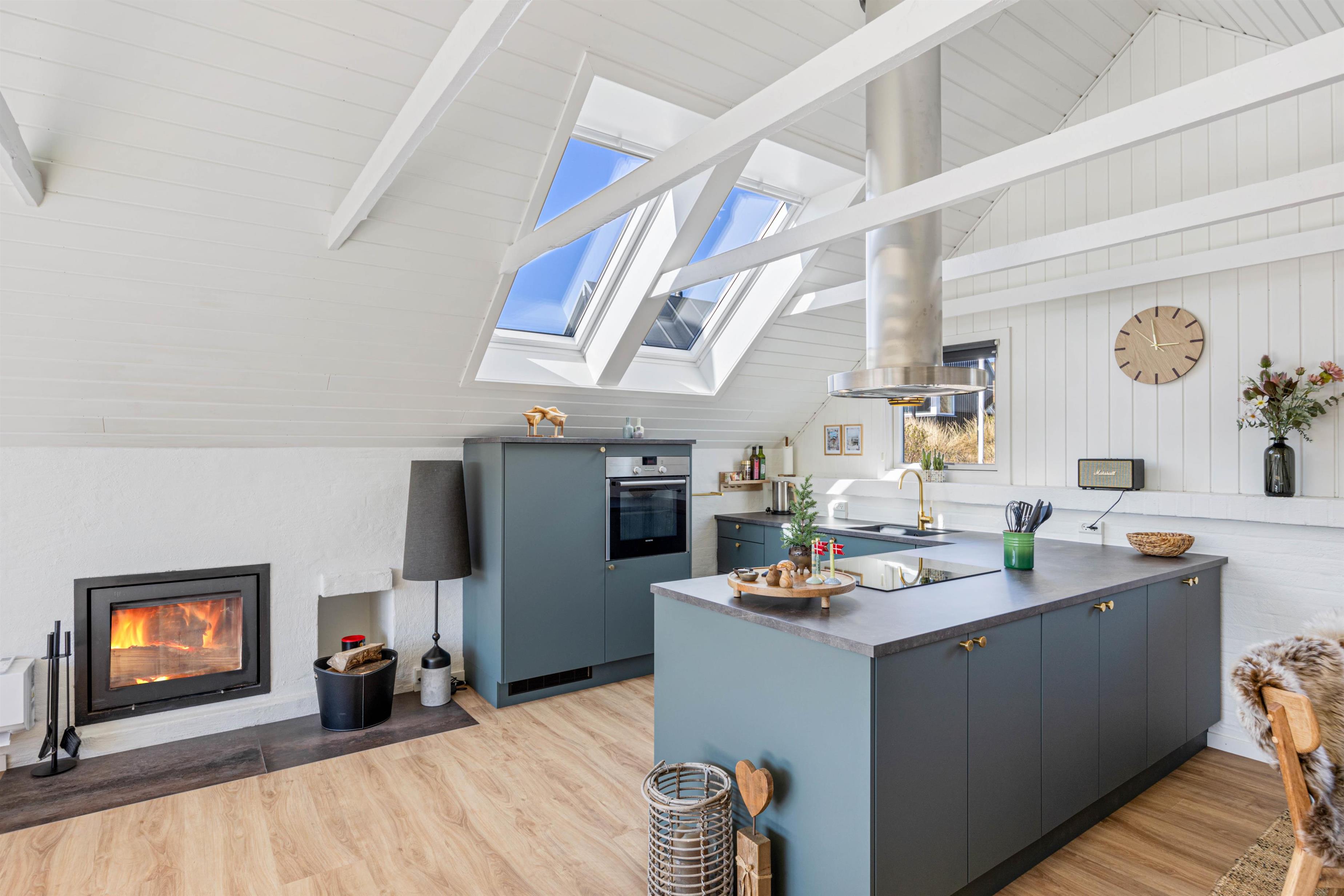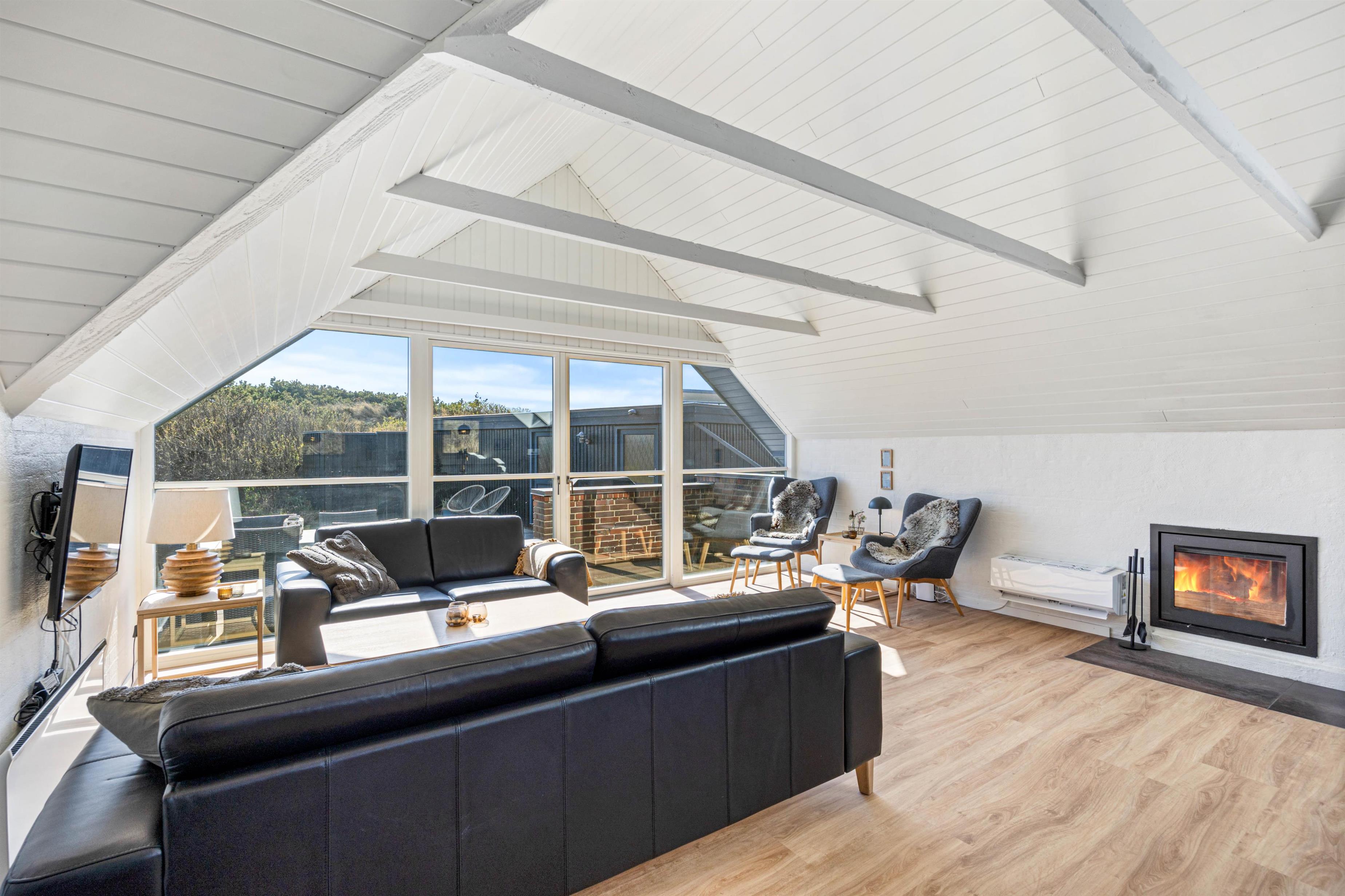 I stuen, som ved renoveringen i 2020 er blevet udvidet, er der trægulv og loft til kip med synlige bjælker, en flot indbygget brændeovn og TV. Der er desuden gratis trådløst internet, som er både hurtigt og stabilt, så alle har mulighed for at være online.