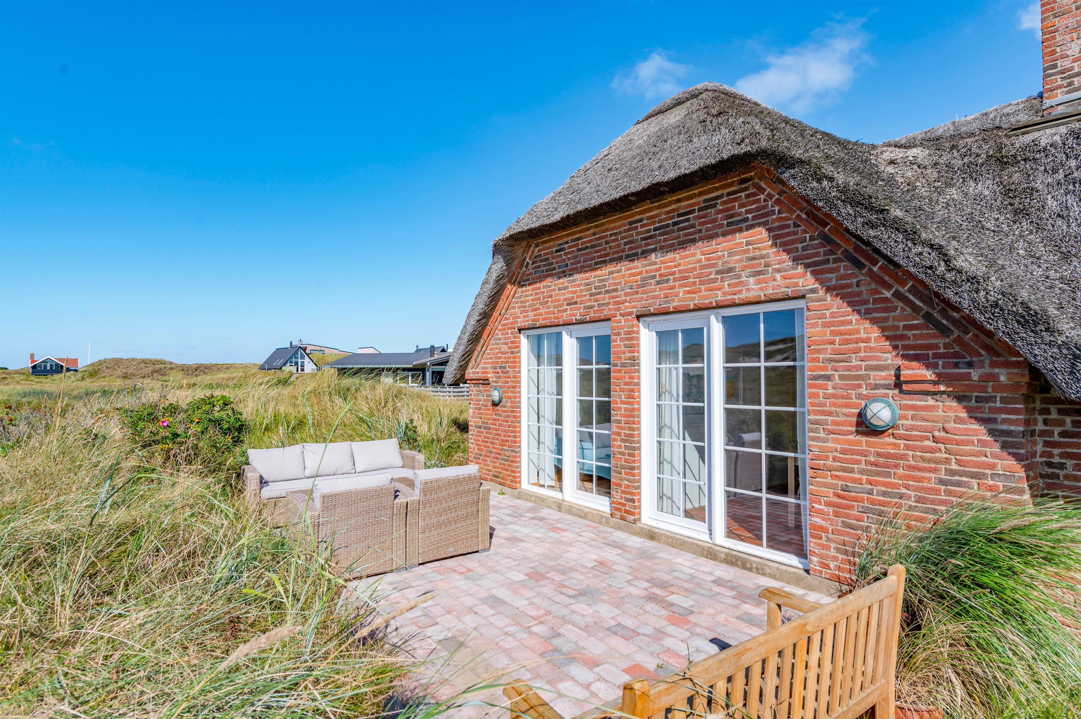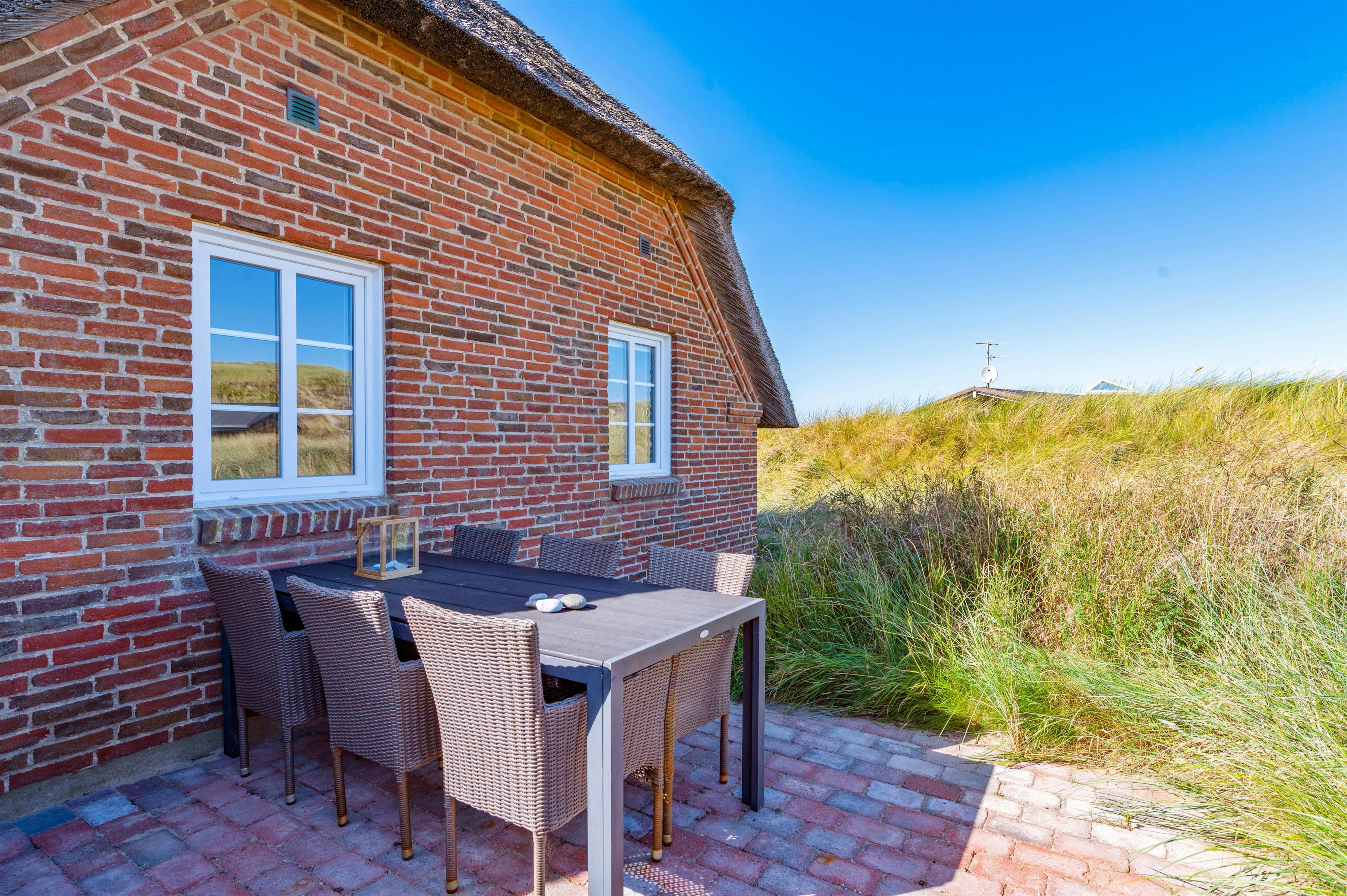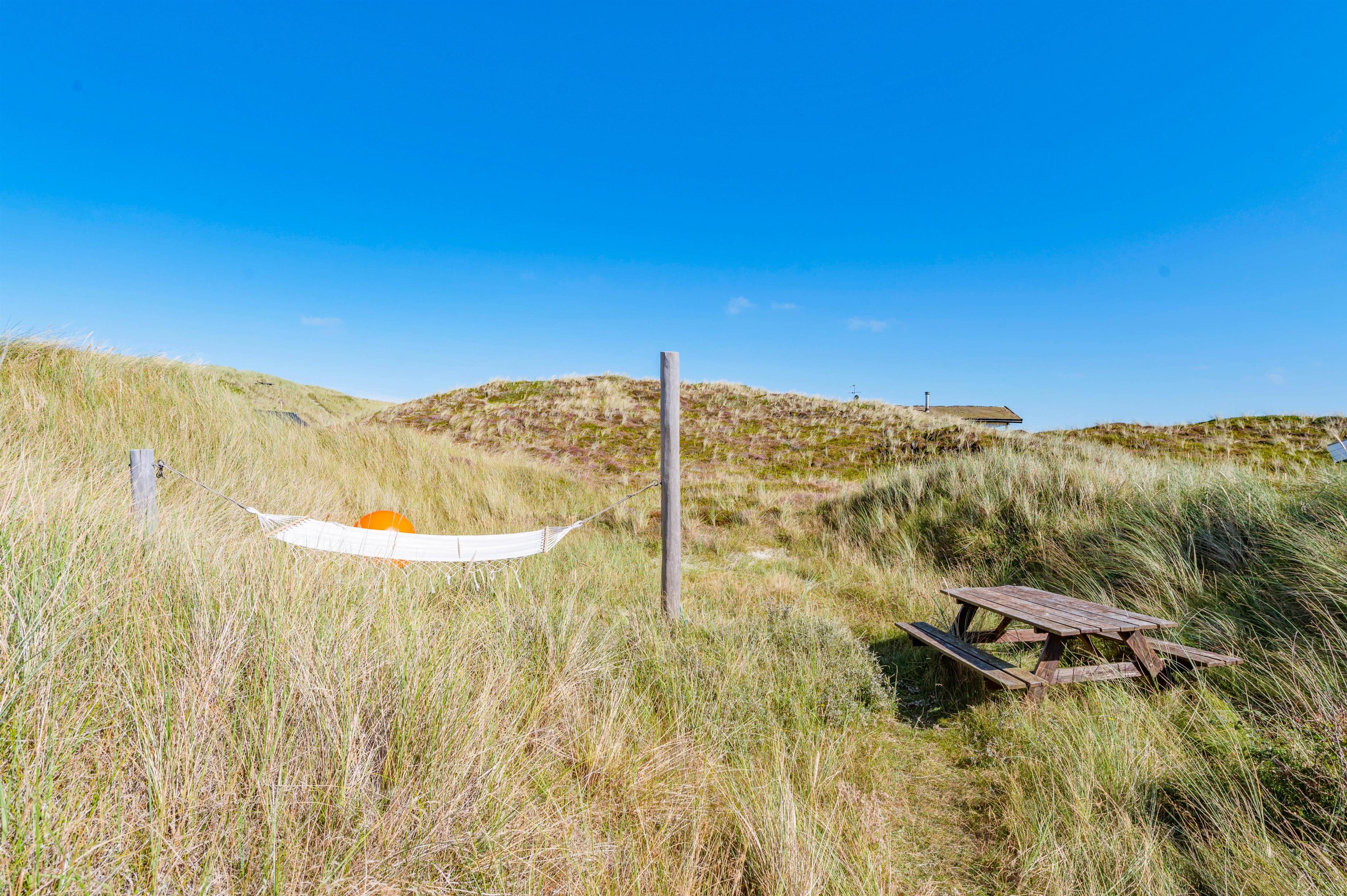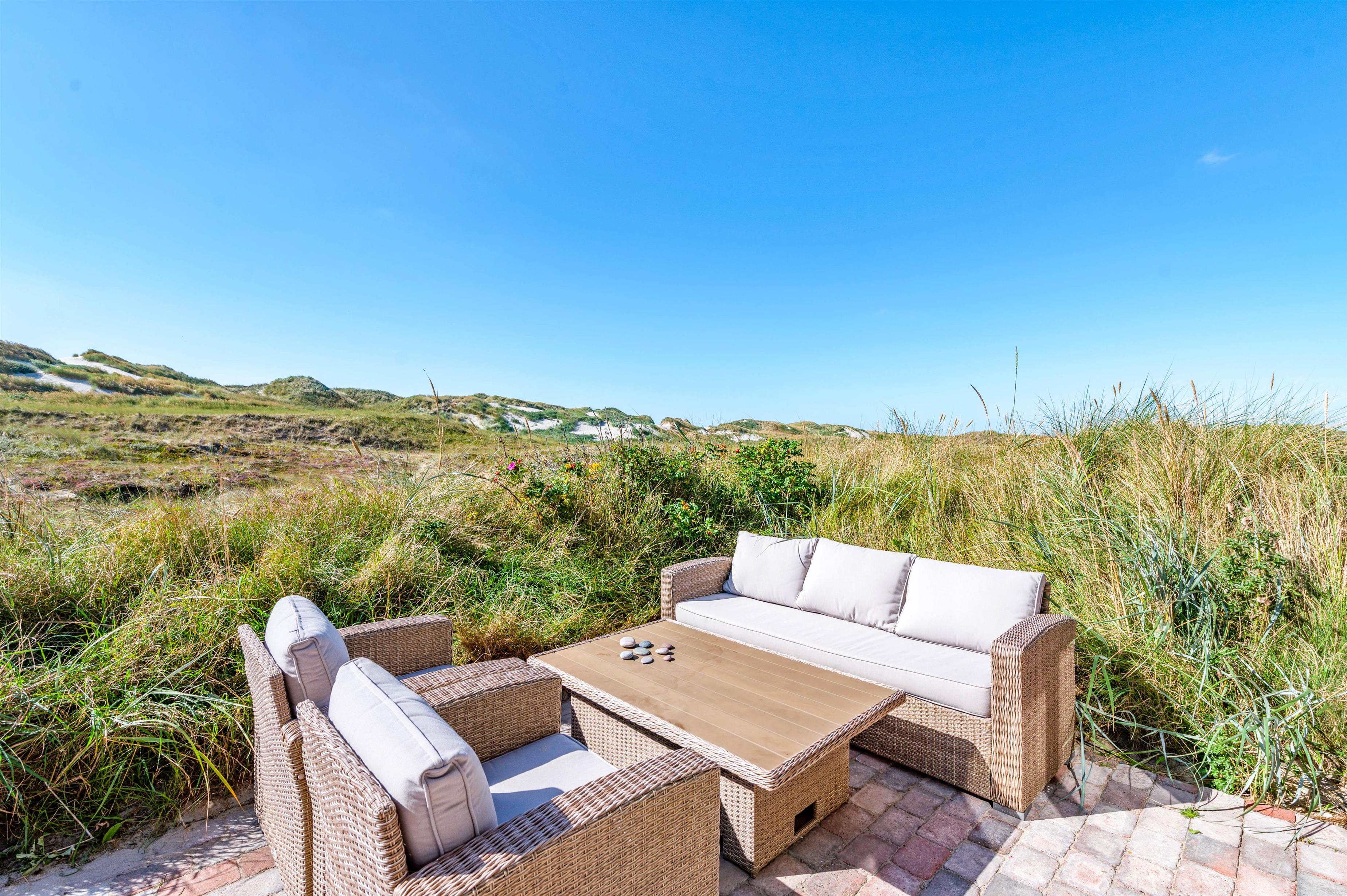 Udendørs har I en åben, afskærmet terrasse, som I kan rykke ud på, når ferievejret er varmt og solrigt. Her kan I finde jer godt til rette i havemøbler og liggestole, hvor I kan slappe af i solen med lyden af brændingen i baggrunden. Imens kan børnene lege, og til dem er der også et gyngestativ.