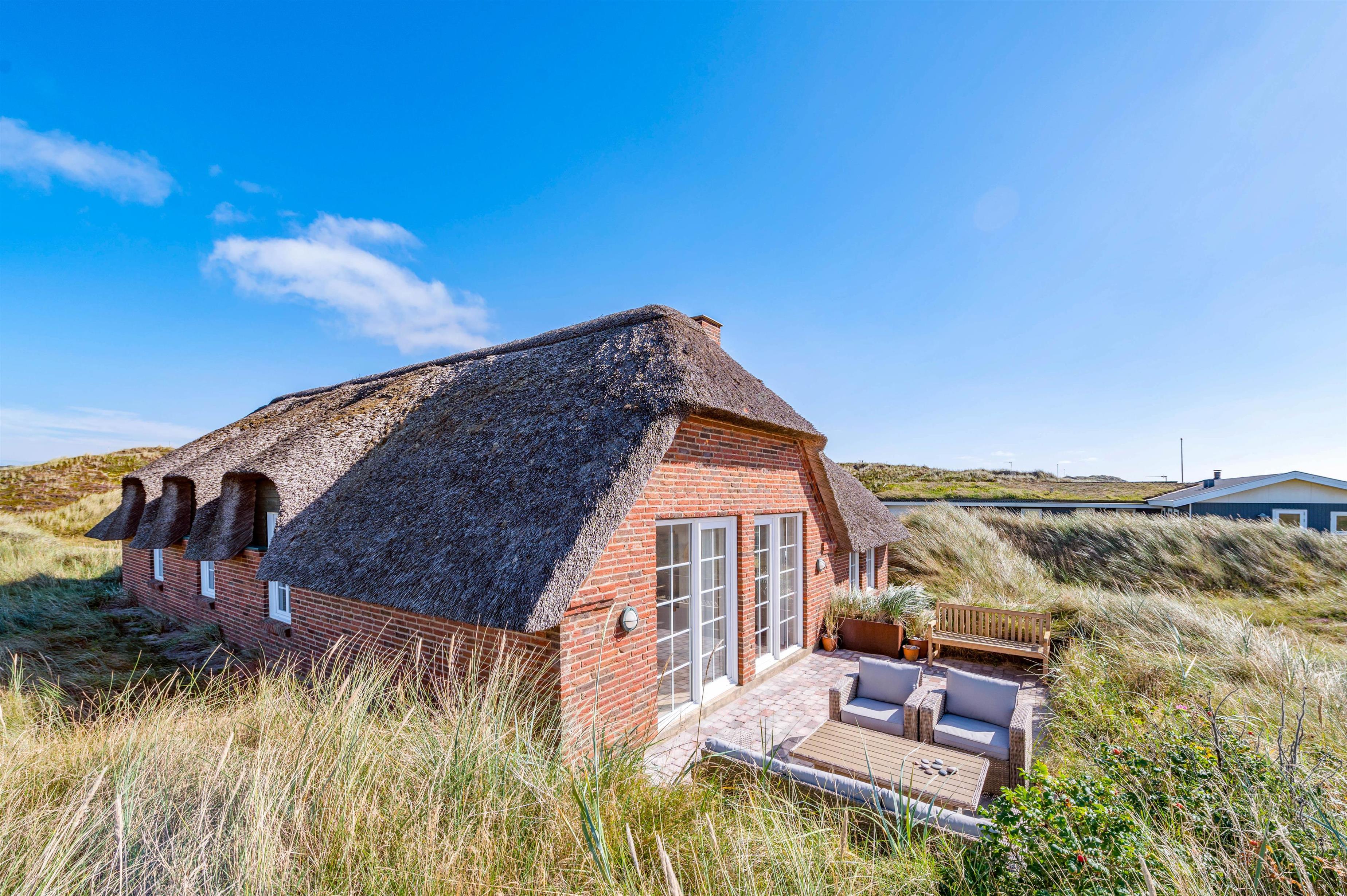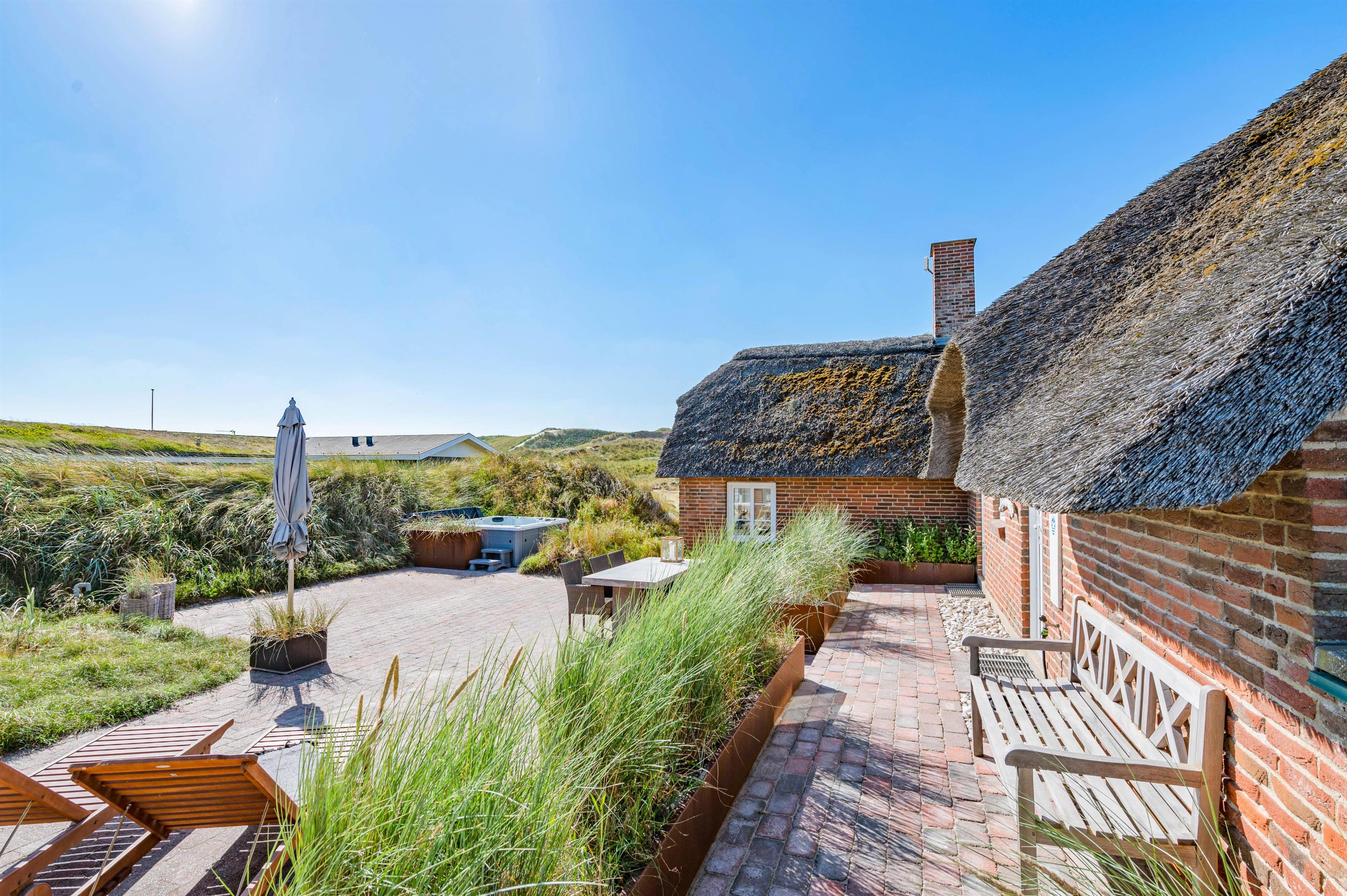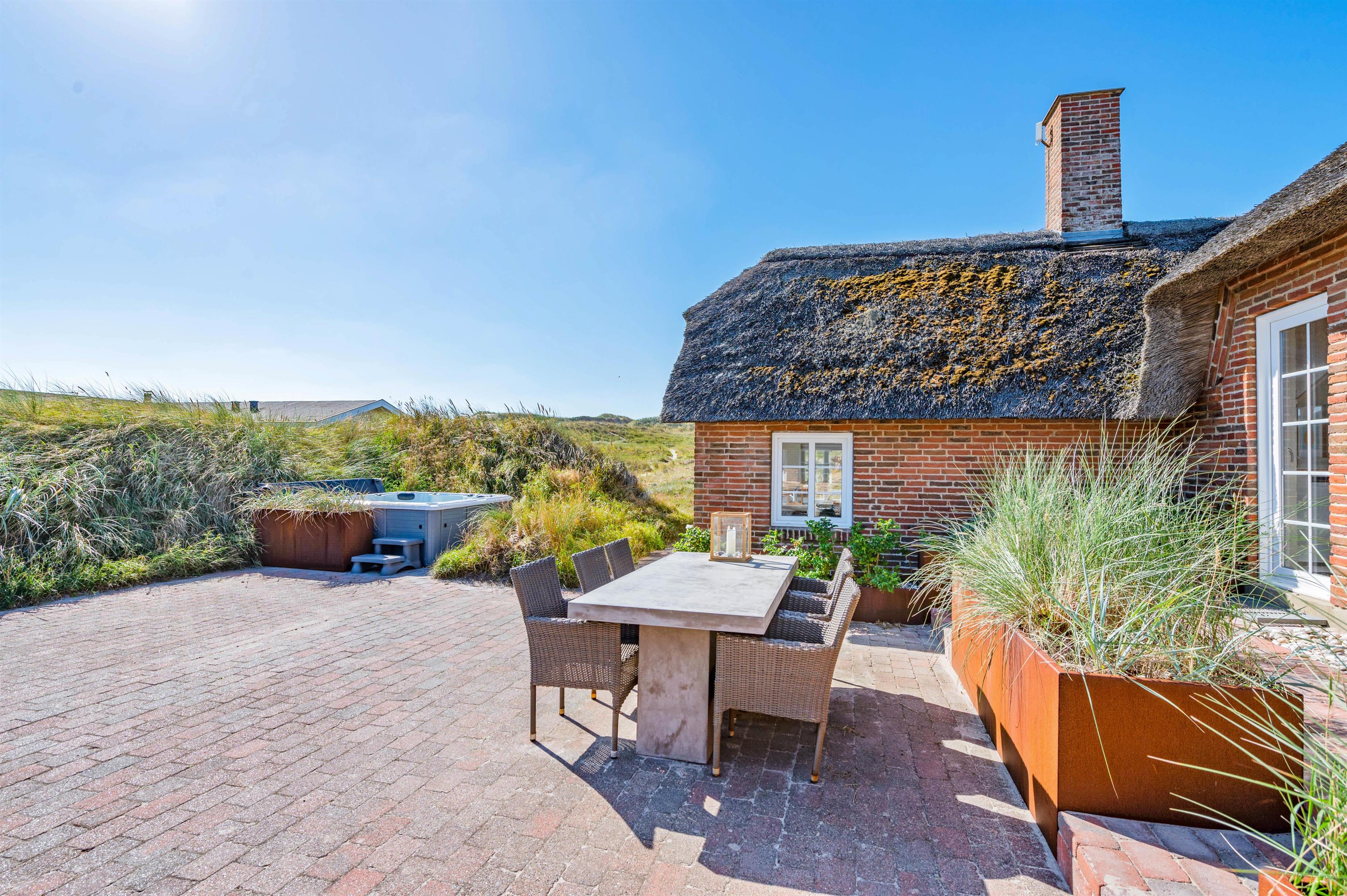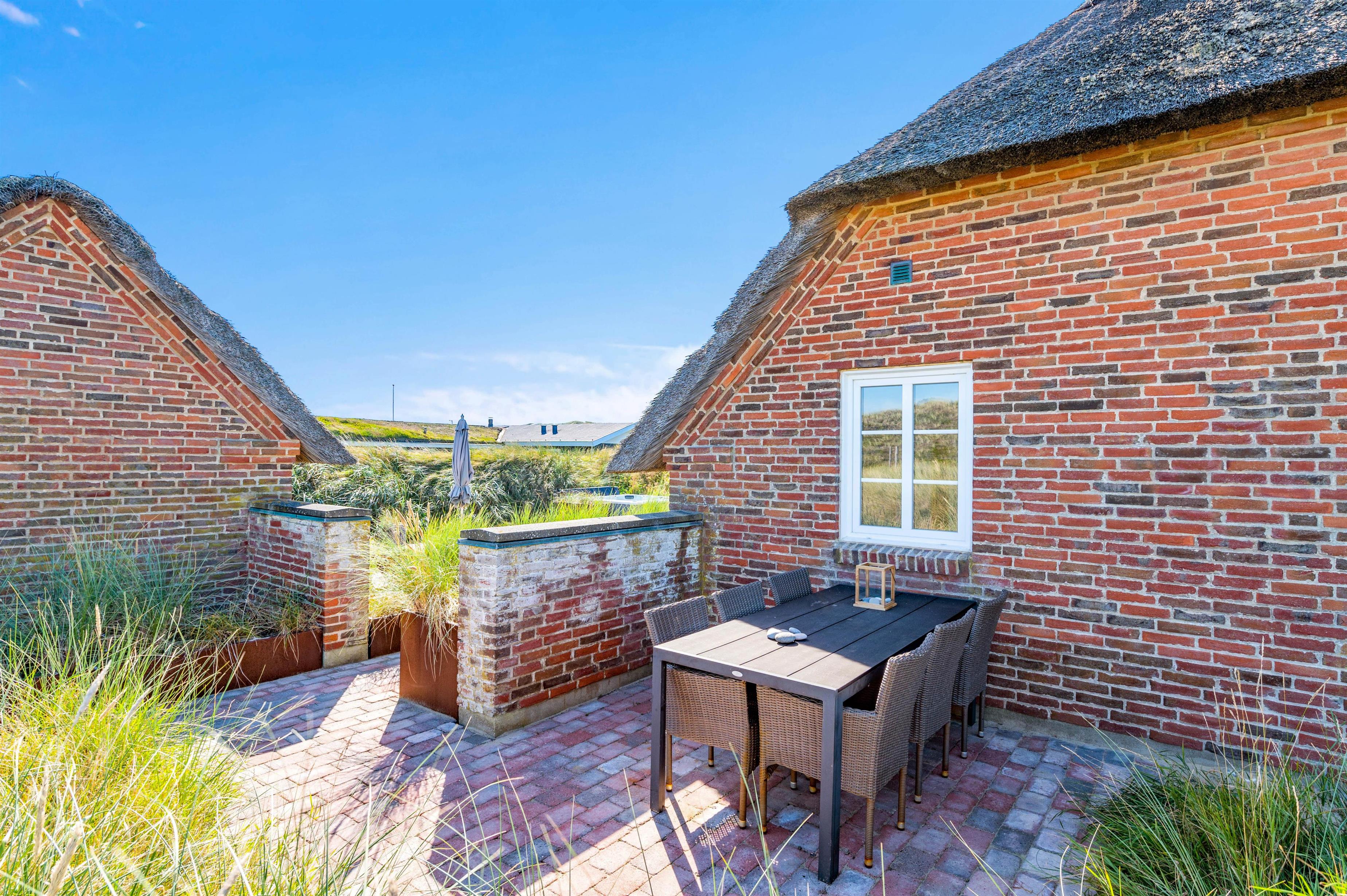 Udendørs har I en åben, afskærmet terrasse, som I kan rykke ud på, når ferievejret er varmt og solrigt. Her kan I finde jer godt til rette i havemøbler og liggestole, hvor I kan slappe af i solen med lyden af brændingen i baggrunden. Imens kan børnene lege, og til dem er der også et gyngestativ.