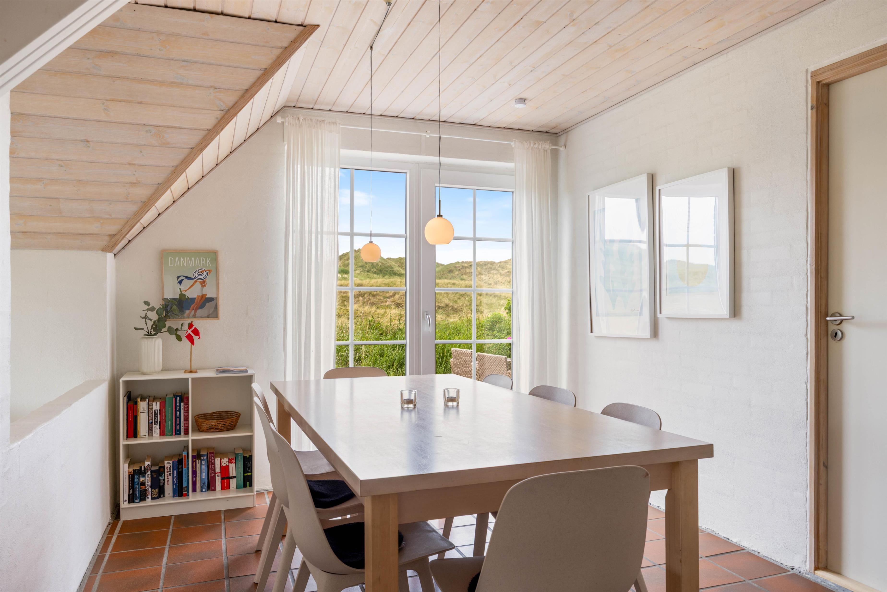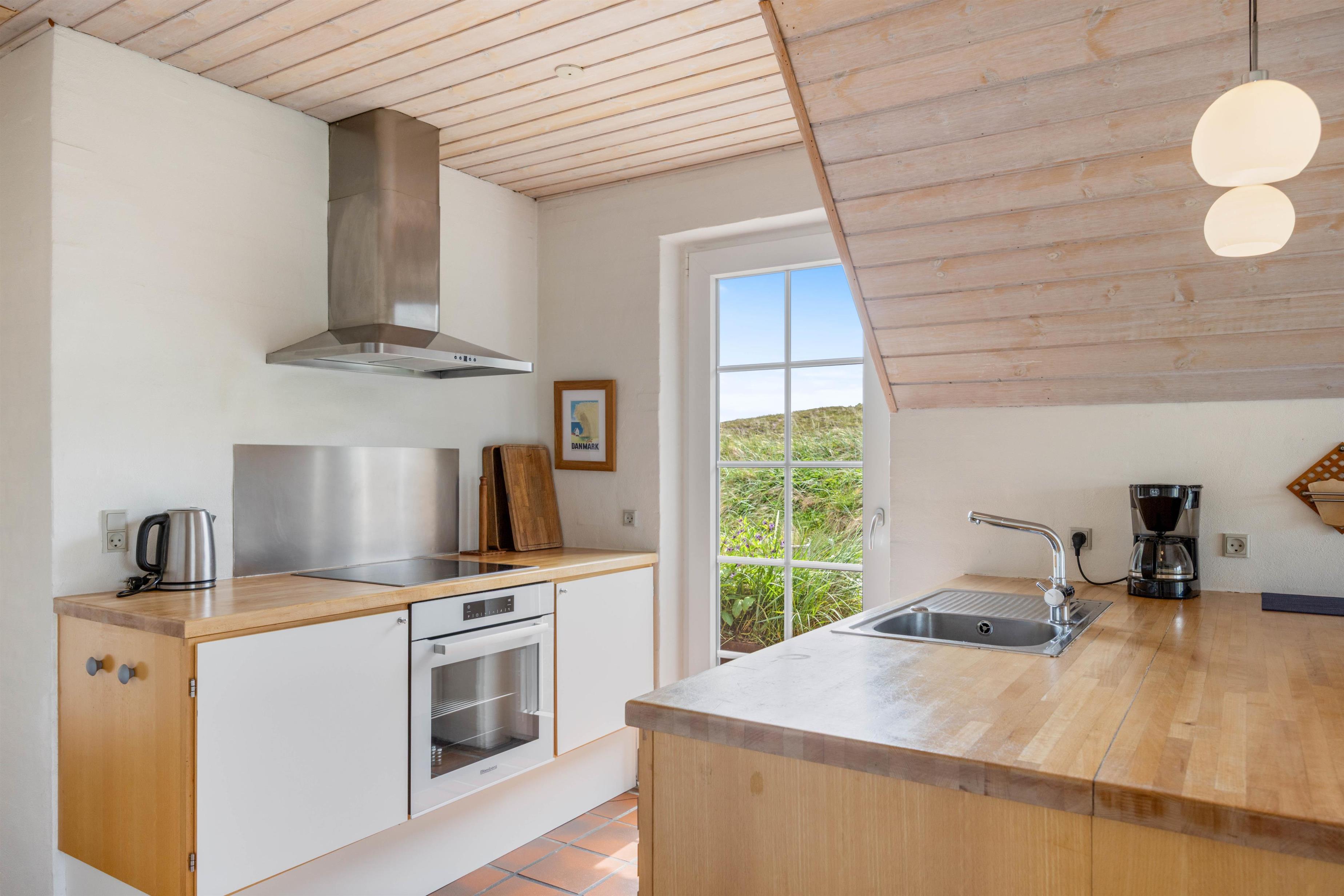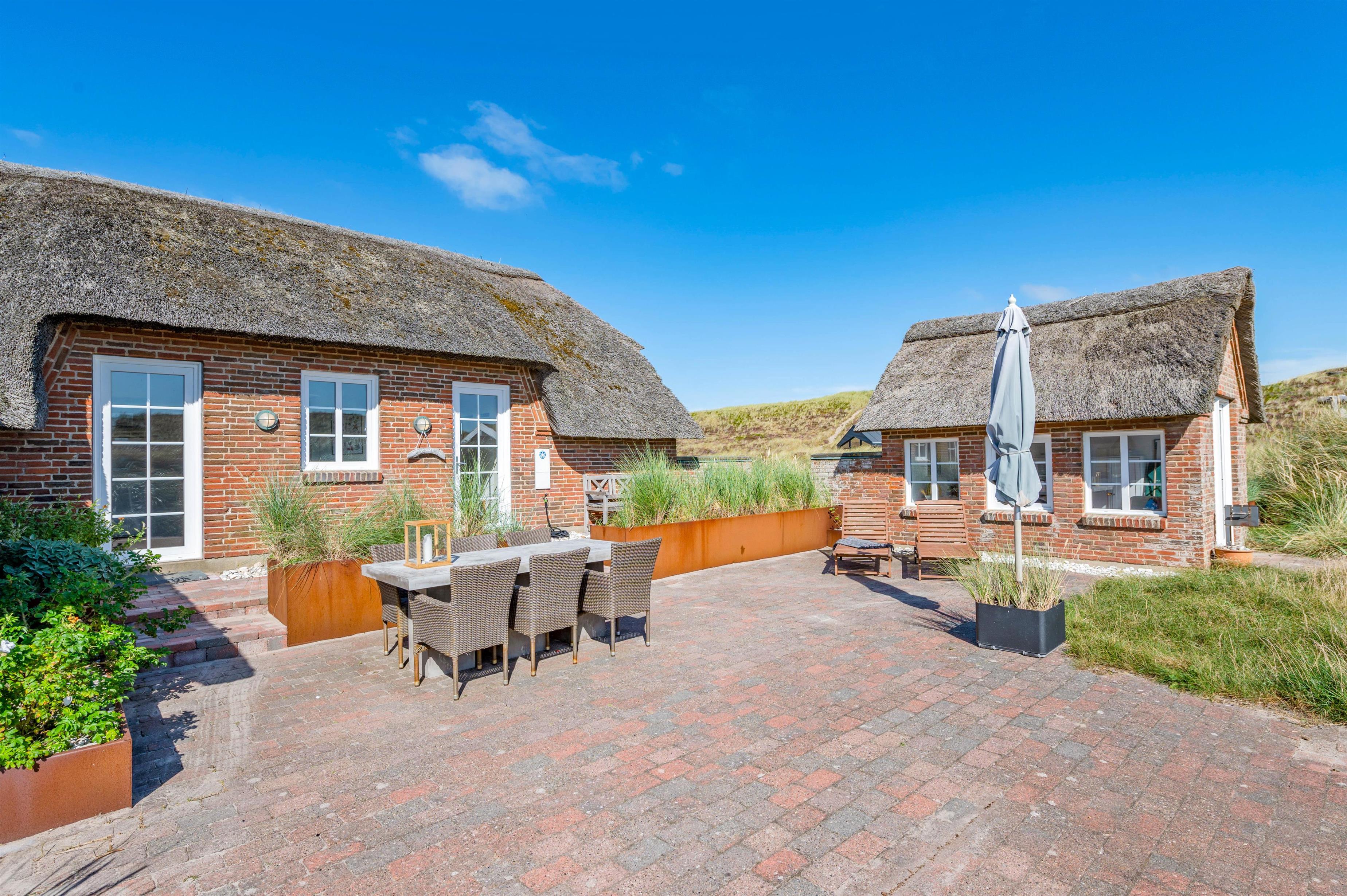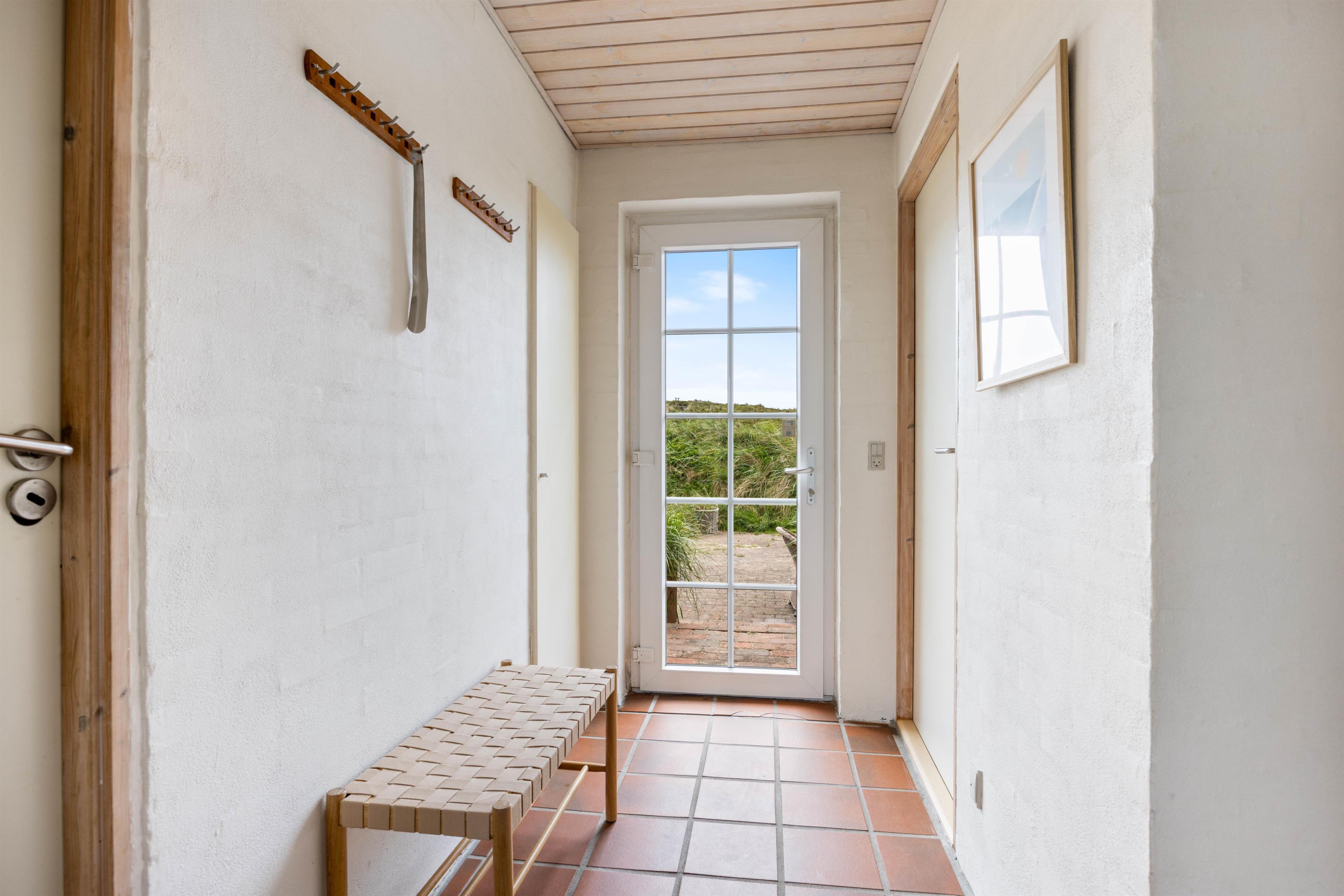Udendørs har I en åben, afskærmet terrasse, som I kan rykke ud på, når ferievejret er varmt og solrigt. Her kan I finde jer godt til rette i havemøbler og liggestole, hvor I kan slappe af i solen med lyden af brændingen i baggrunden. Imens kan børnene lege, og til dem er der også et gyngestativ.