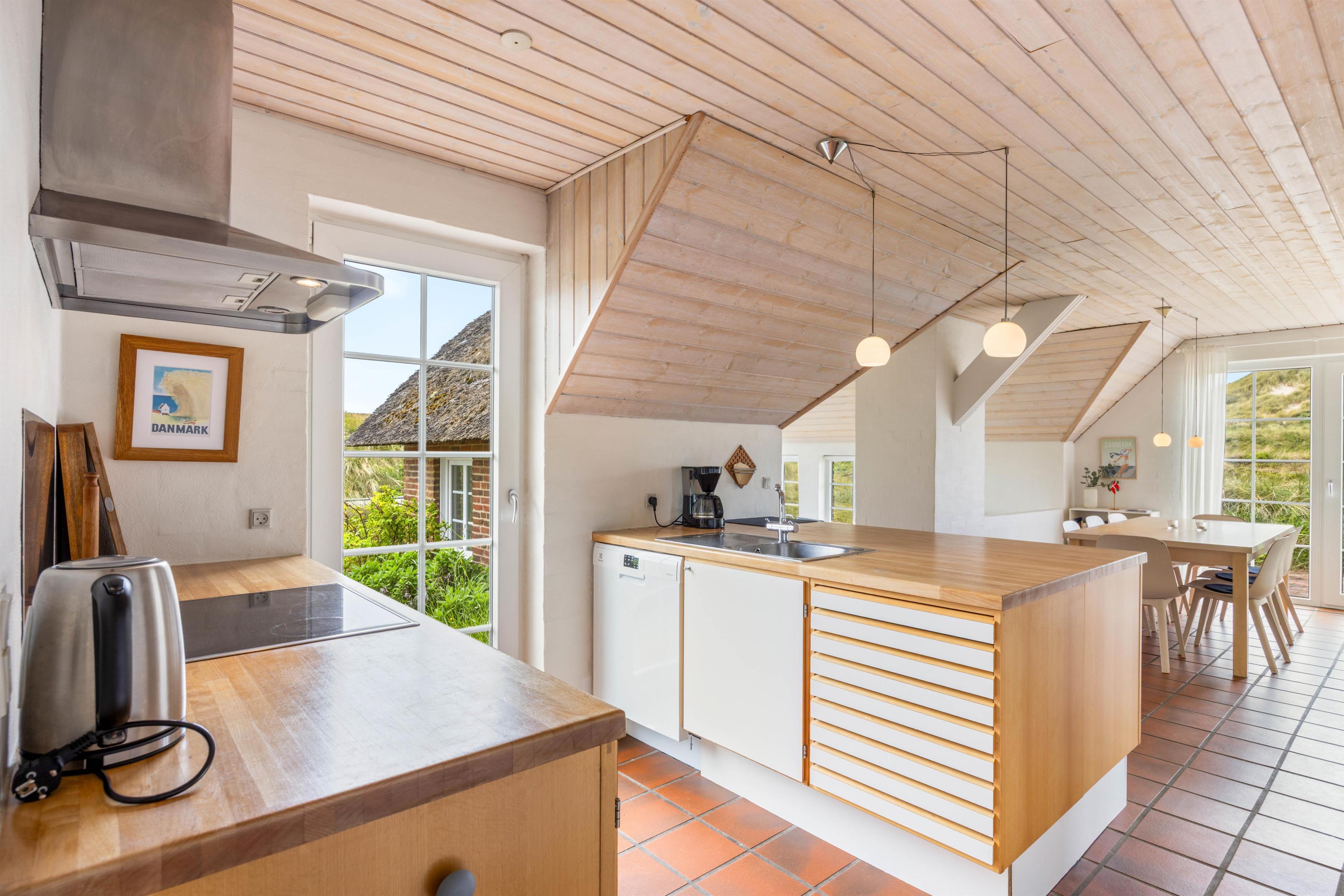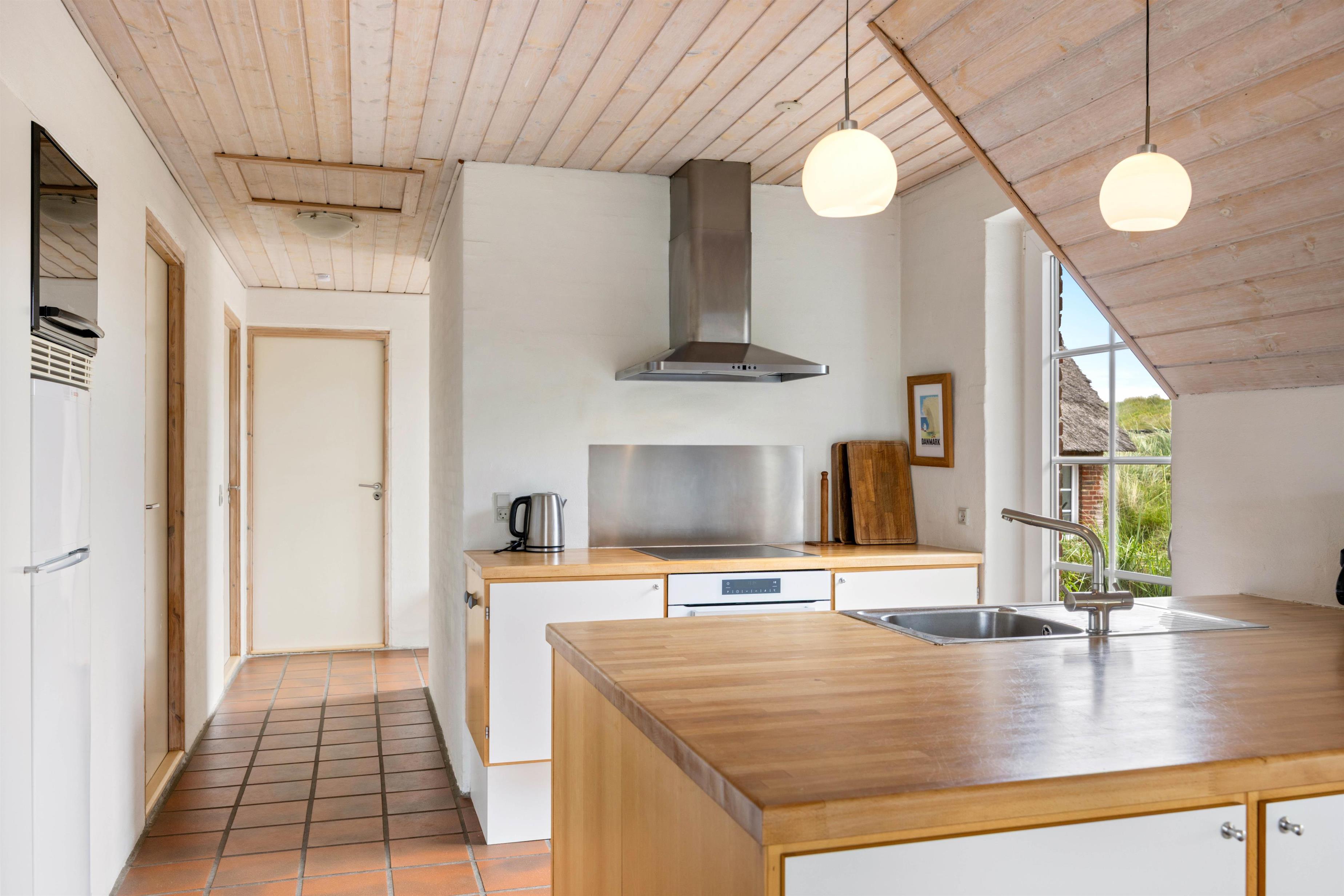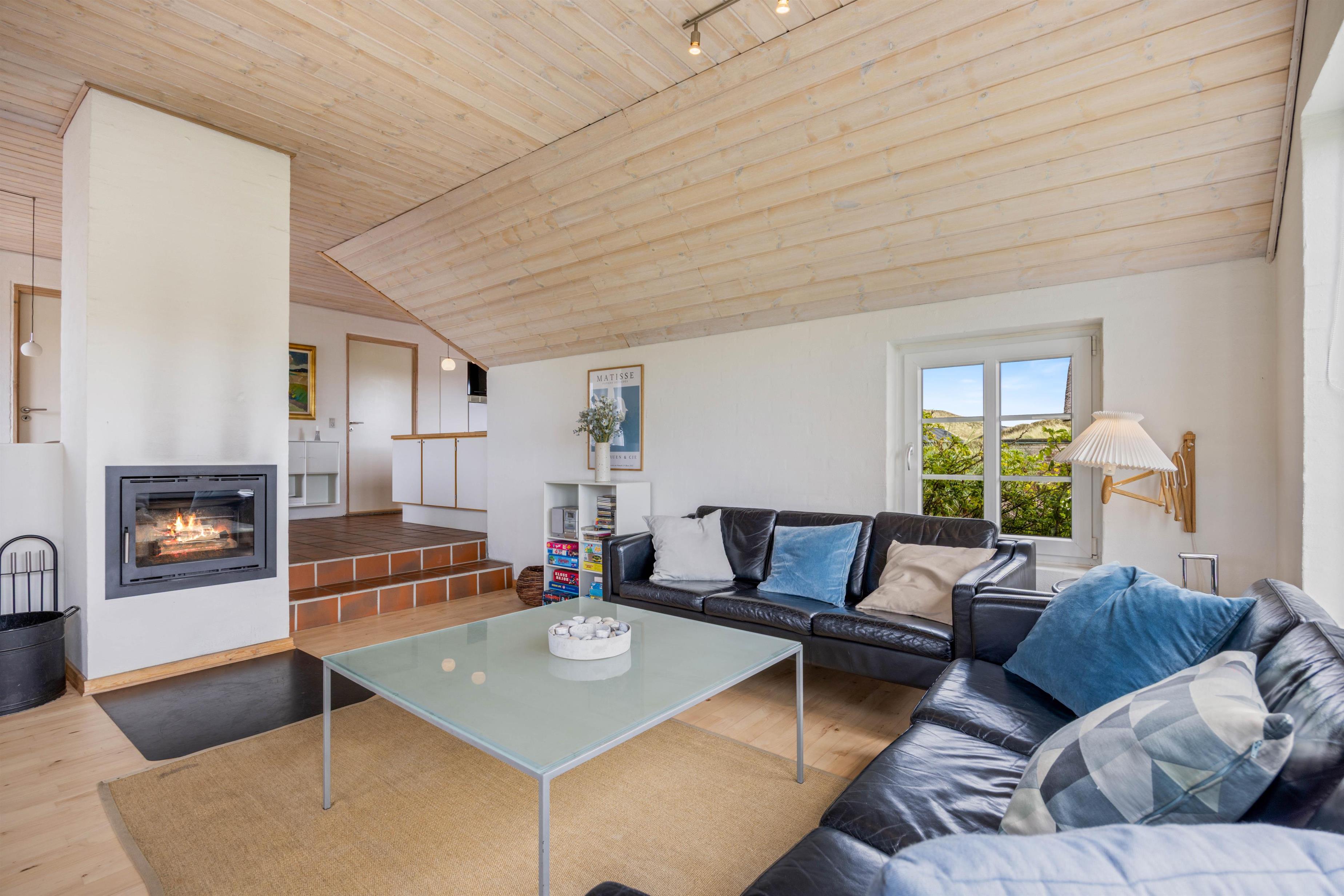 I sommerhuset vil I blive mødt af en lys og praktisk indretning, og I vil utvivlsomt hurtigt føle jer godt tilpas her. Sommerhusets køkken, stue og spiseplads ligger i åben forbindelse og udgør alrummet, hvor I vil tilbringe mange hyggelige feriestunder med madlavning, spil og film. I alrummet vil pejseindsatsens knitren i baggrunden fuldende den hyggelige feriestemning. Der er også en energivenlig luft-til-vand varmepumpe som sørger for et behageligt indeklima.