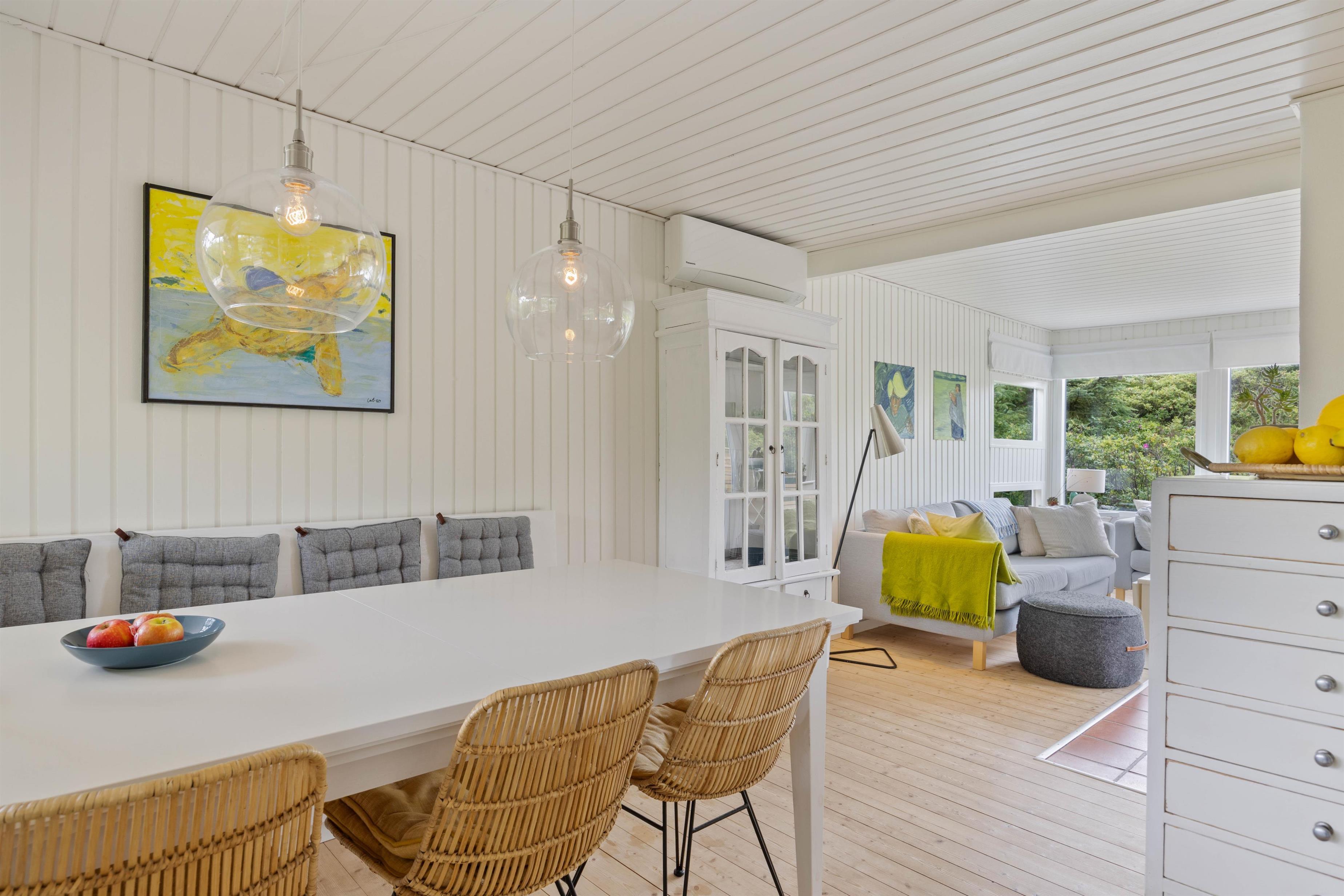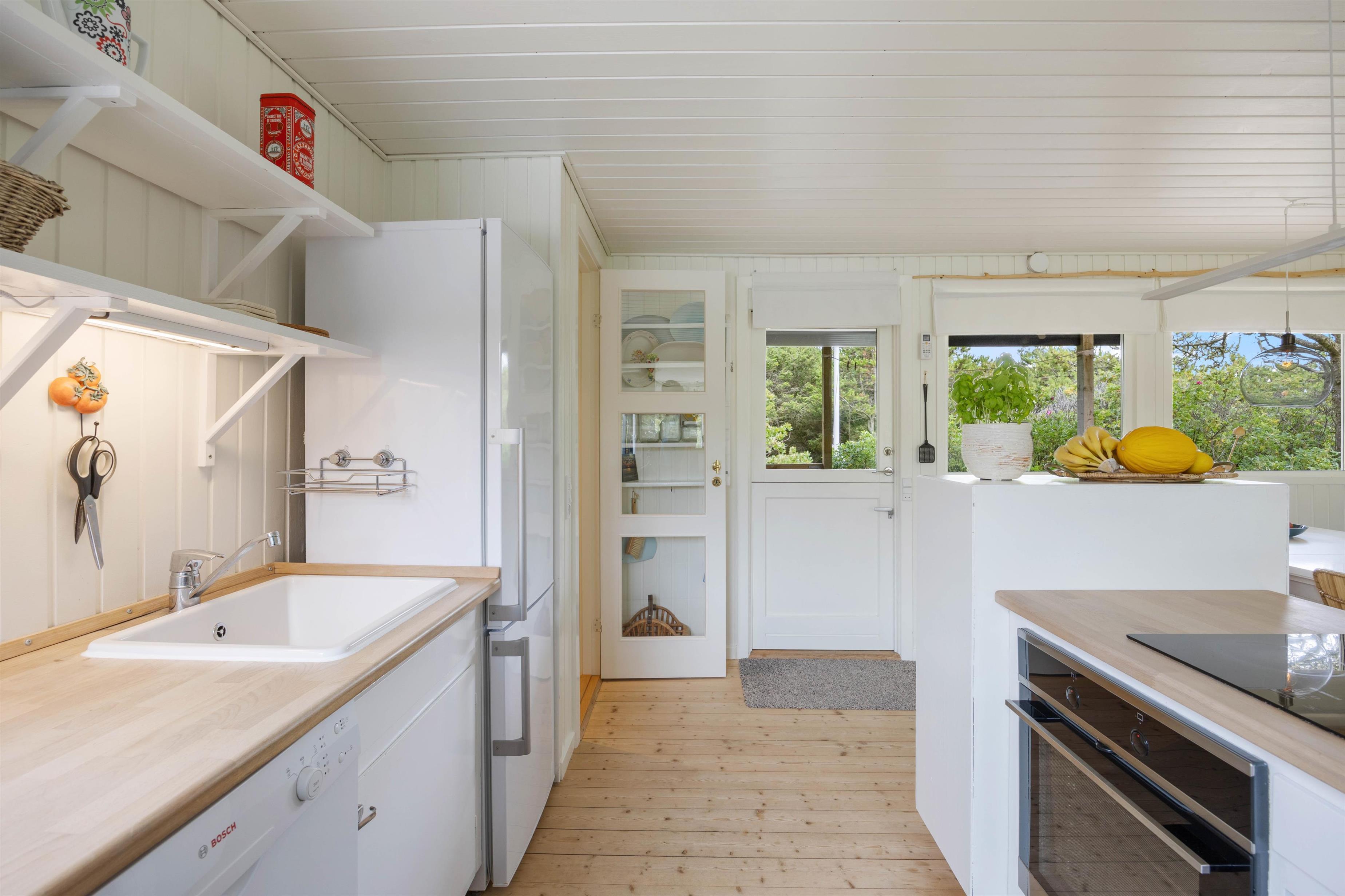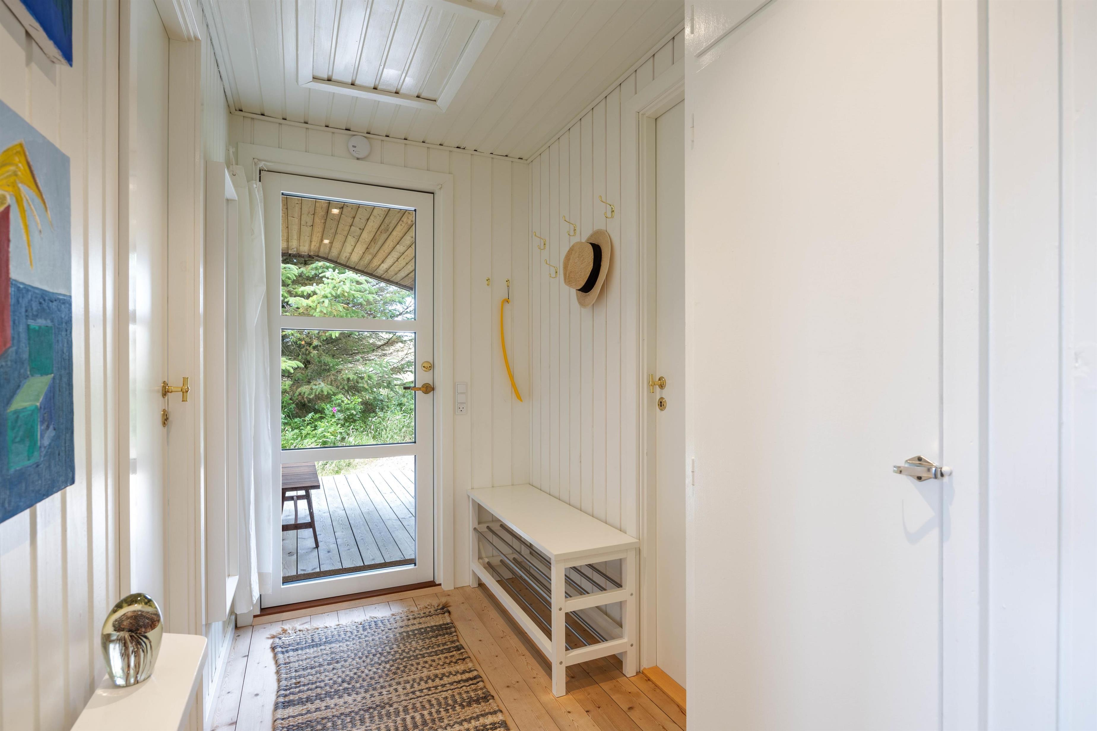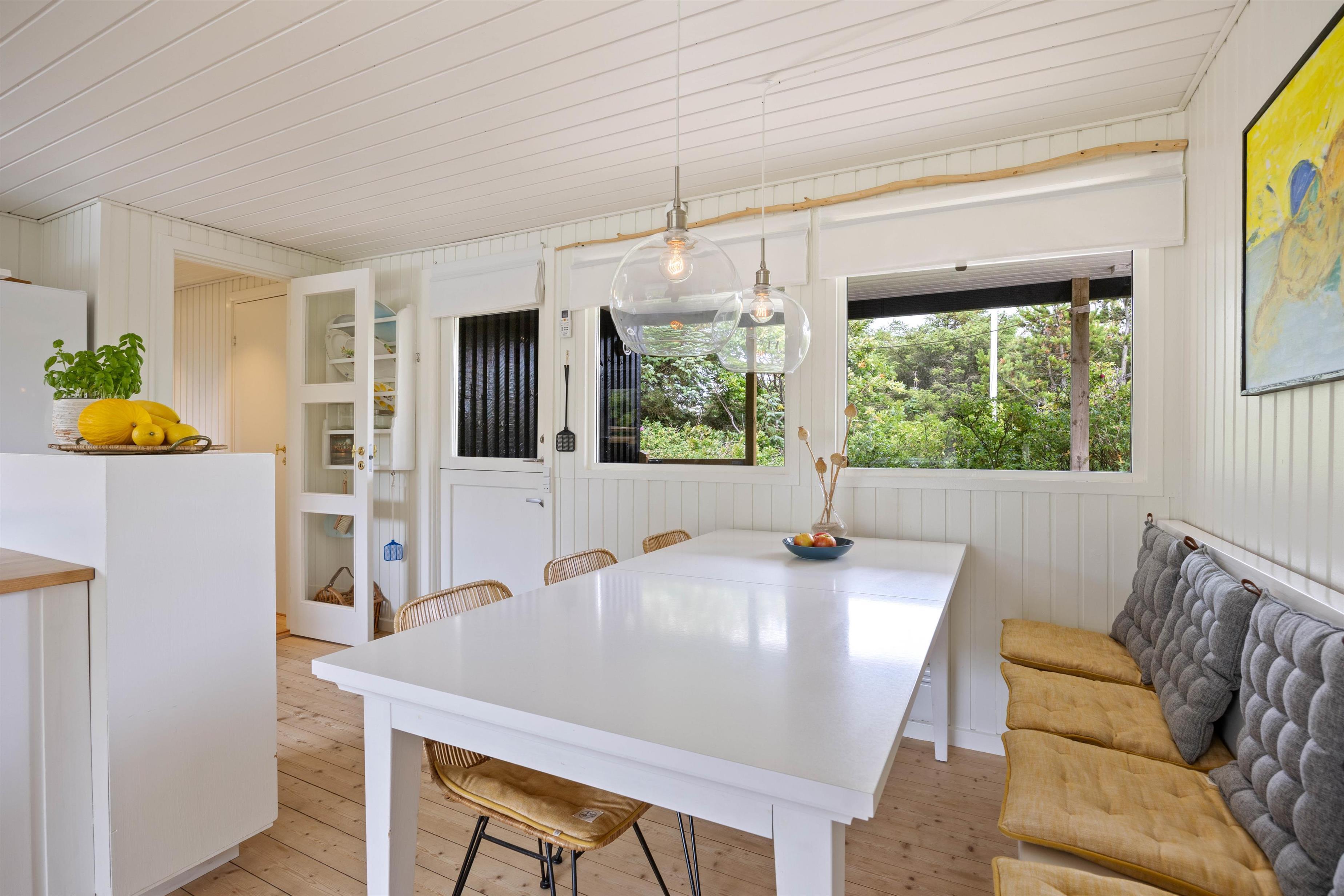 Indvendigt i sommerhuset er den klassiske sommerhusstil gennemført. Vægge, lofter og gulve er holdt i lyse og imødekommende nuancer, som skaber en rar og hyggelig atmosfære i indretningen. Samtidig sørger husets vinduer for at lukke både lyset og naturen indenfor. Fra stuen er der en dejlig udsigt til landskabet udenfor. På kolde dage kan I tænde op i pejsen og nyde lyden af knitrende brænde og lyset fra flammerne. Huset er godt indrettet med tre soverum med plads til fem personer og to hunde. Huset har både opvaskemaskine, vaskemaskine og tørretumbler, så I kan fokusere på at slappe af og nyde ferien, mens maskinerne klarer arbejdet for jer.