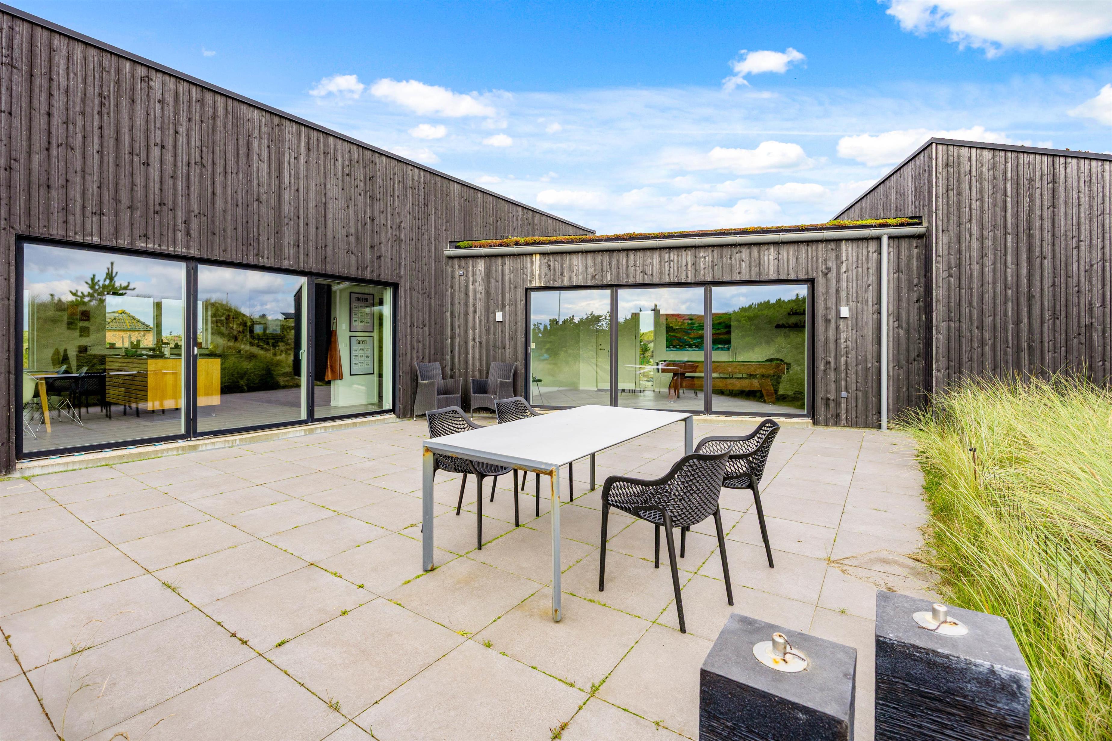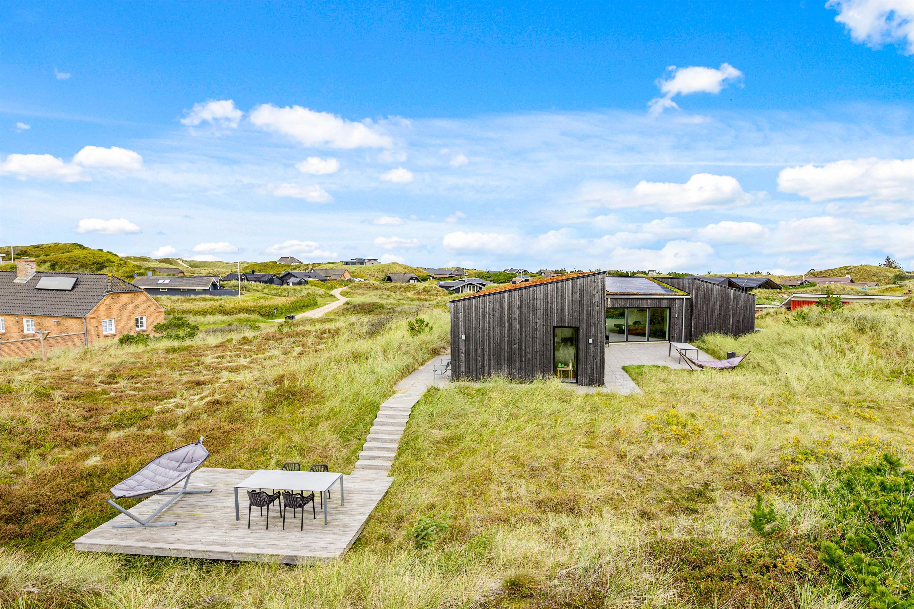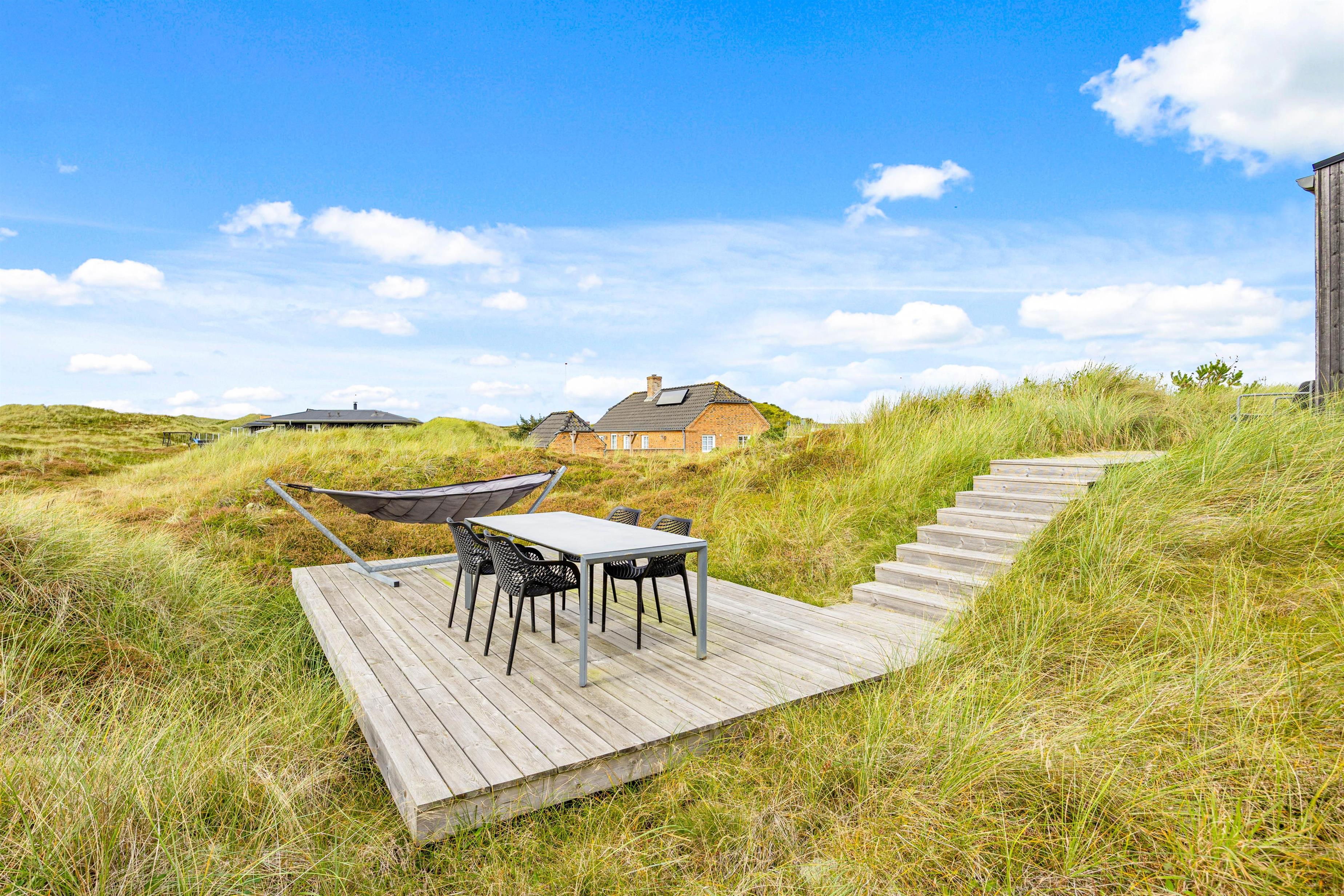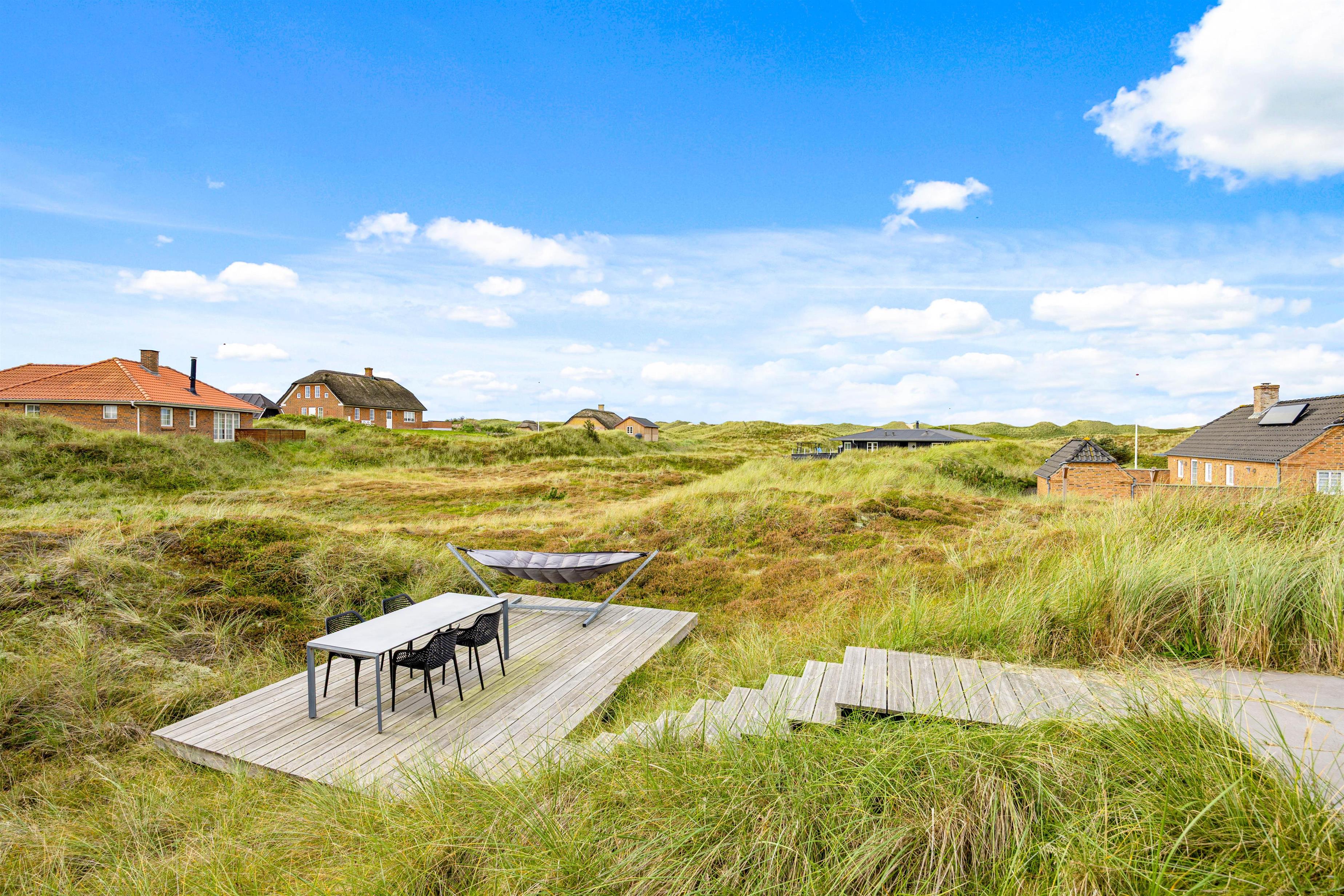 Sommerhuset er beliggende på en 2331 kvadratmeter stor natur- og klitgrund og byder på 2 flotte terrasser. Den åbne terrasse er integreret i det smukke klitlandskab, hvor I kan nyde en fantastisk udsigt, mens I spiser en lækker middag tilberedt på husets grill.