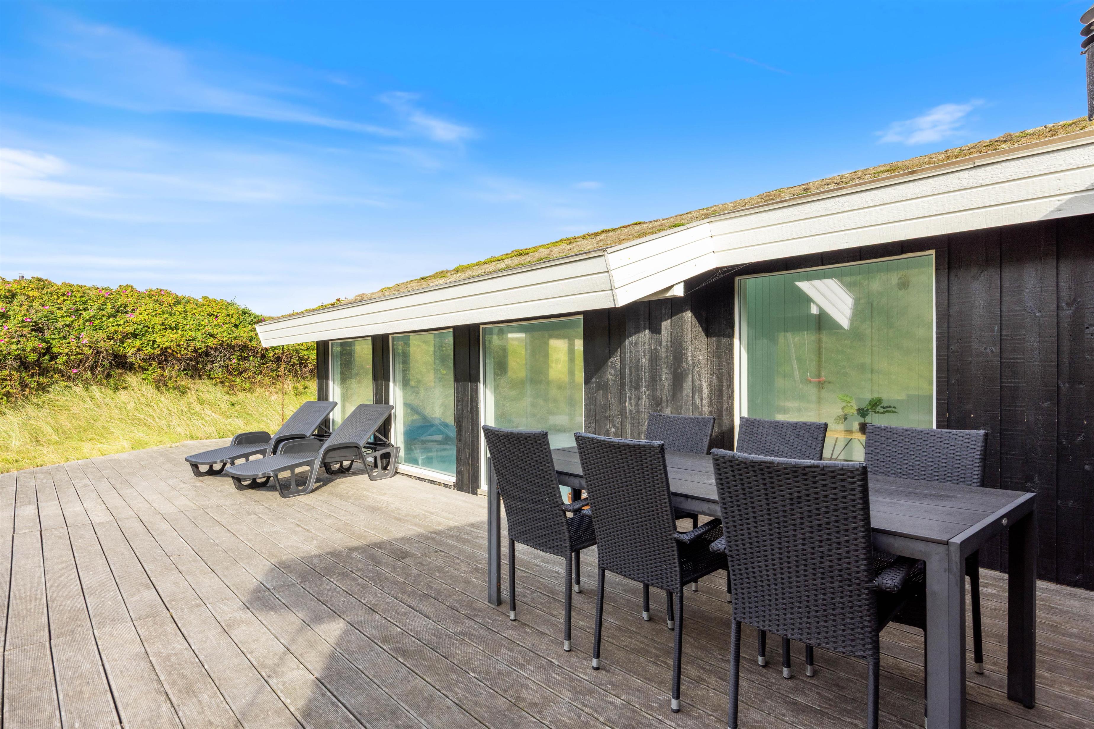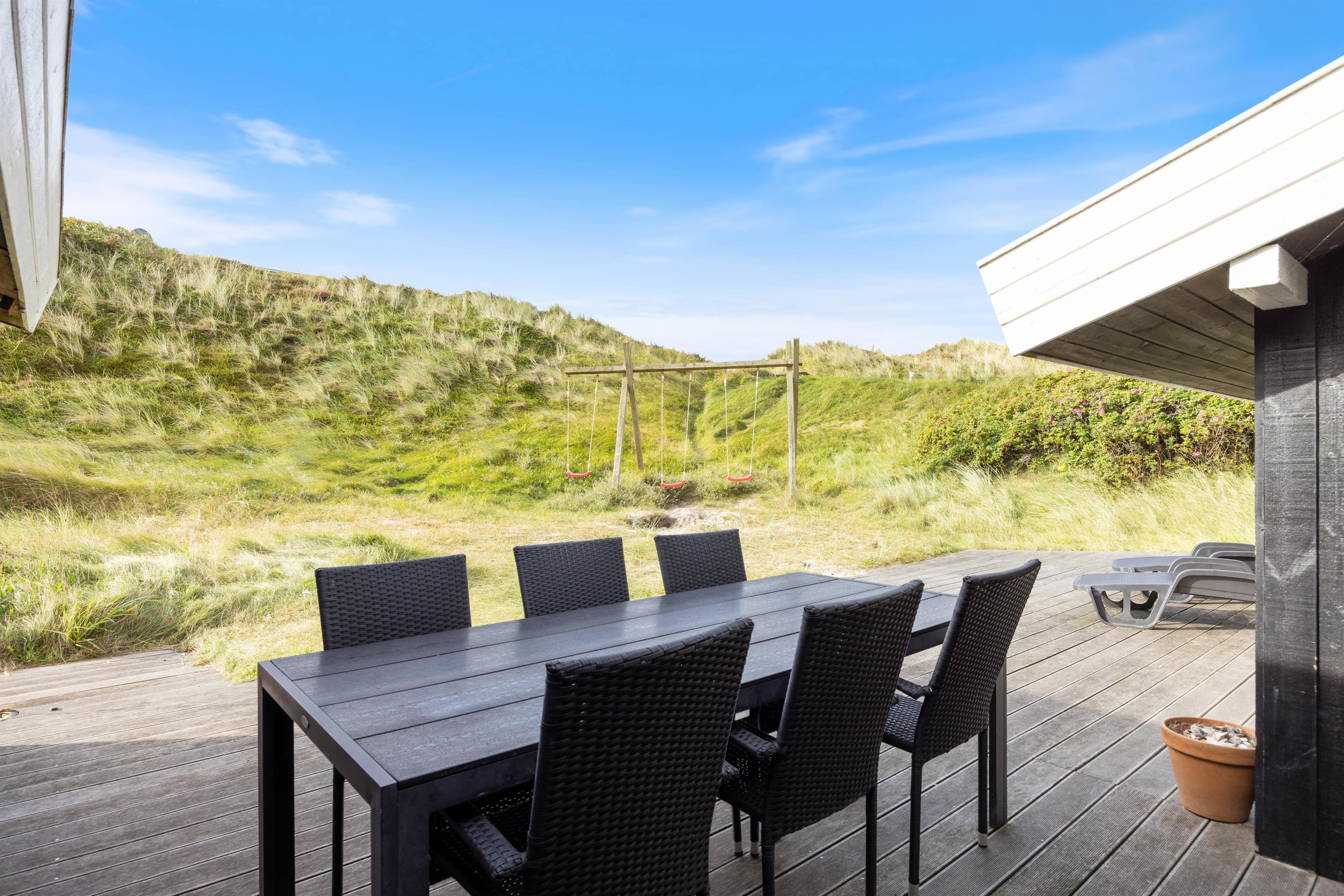 På terrasserne rundt om huset, kan man til enhver tid finde et læ-hjørne, og mod syd er terrassen omgivet af klitter, så man er helt privat og kan nyde solen og lugten af havet, mens børnene gynger eller leger i sandet.
