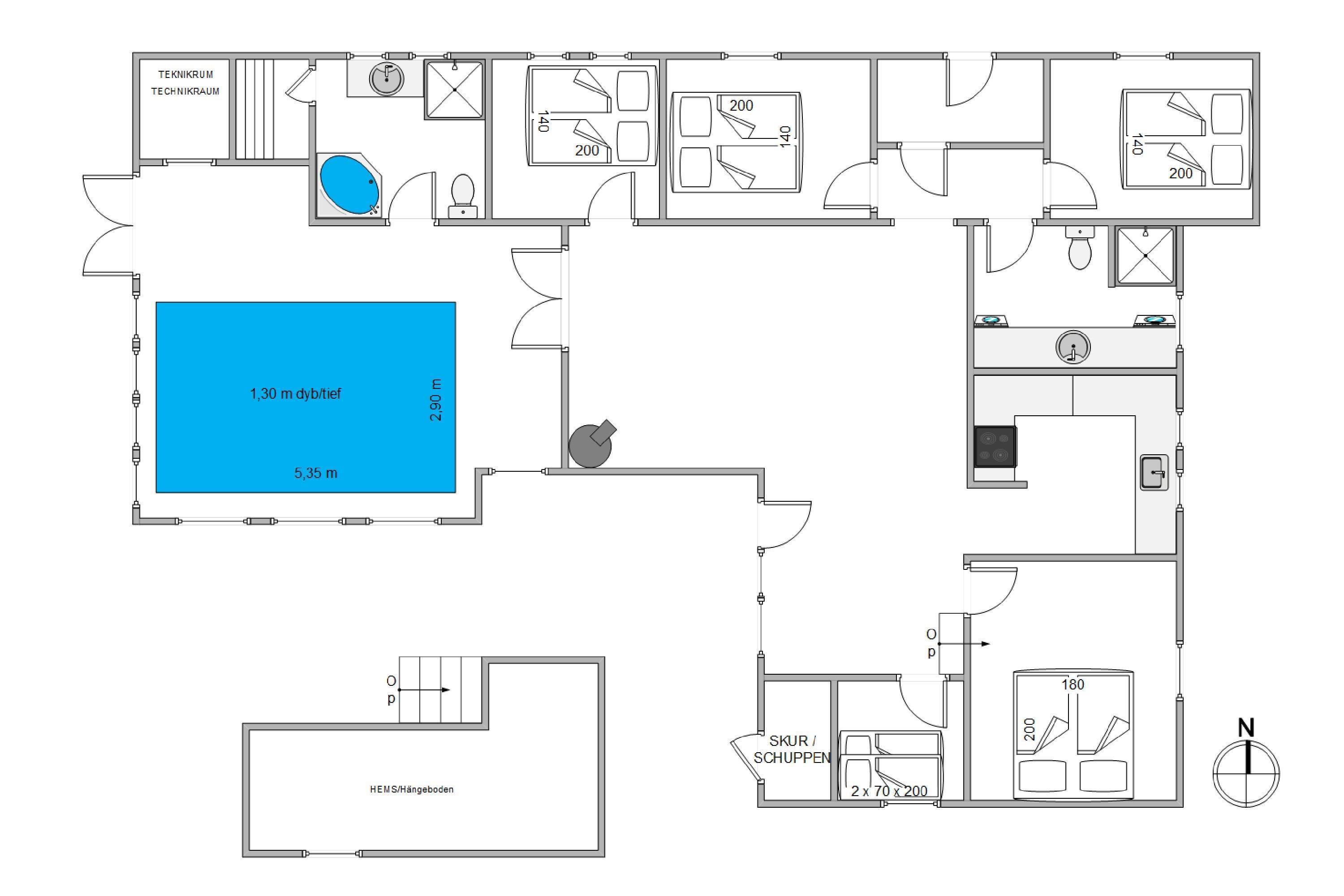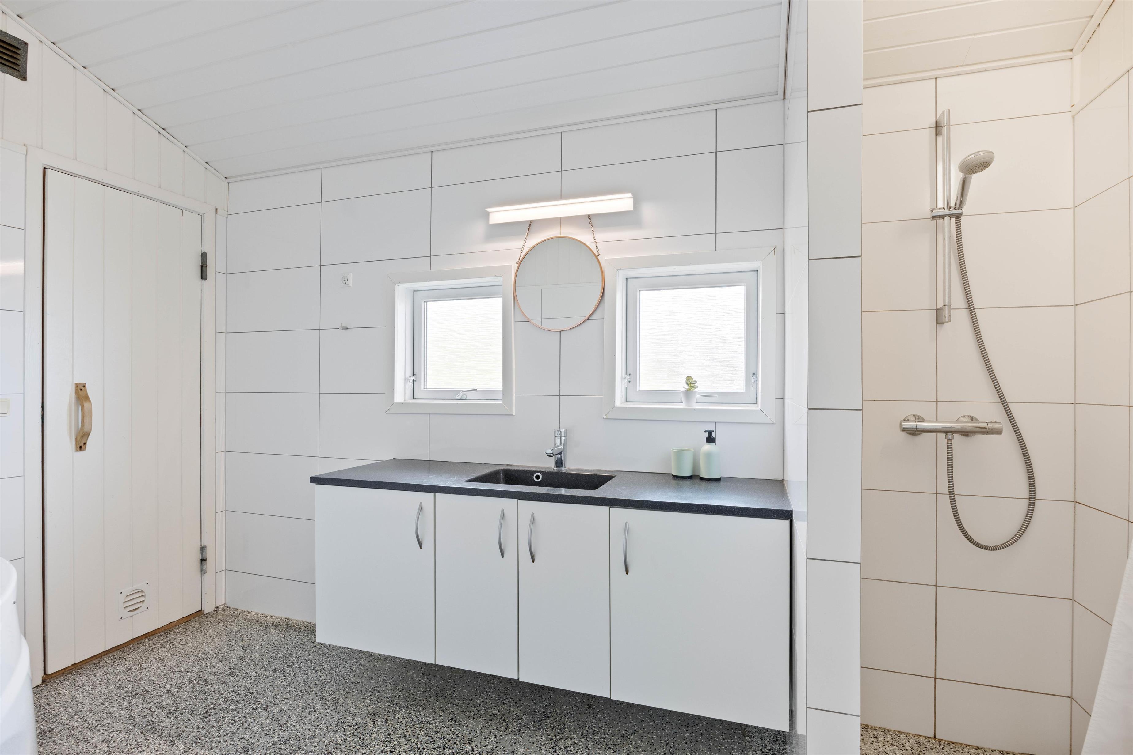 Huset råder over 2 badeværelser, hvoraf det ene er med spa og sauna – og ligger i pool afdelingen. Det andet badeværelse indeholder vaskemaskine og tørretumbler, hvilket gør det nemmere at pakke til alt slags vejr – og til enhver lejlighed. En varmepumpe i huset gør huset mere energivenligt - og hjælper med at holde omkostningerne på et passende niveau.