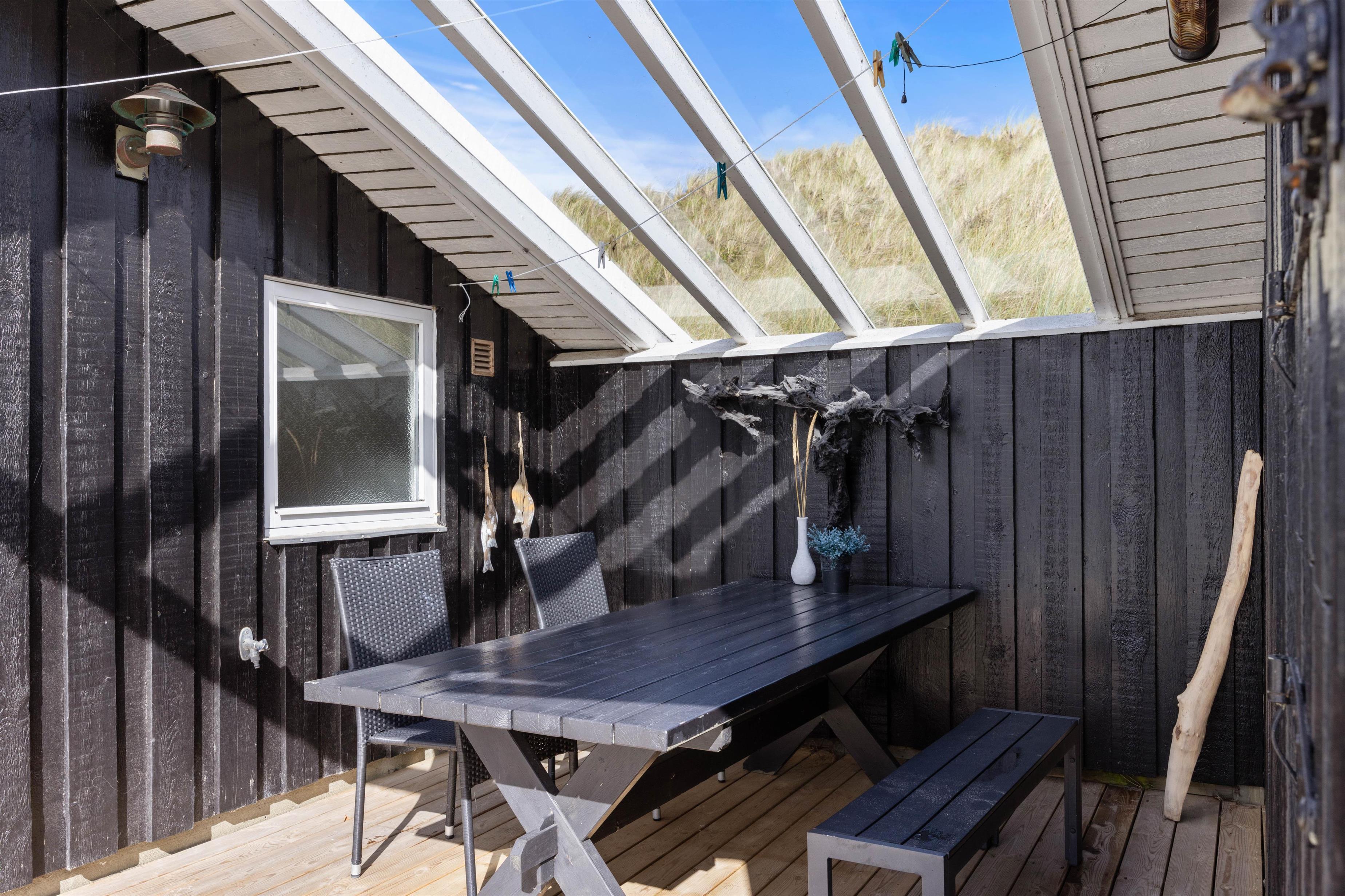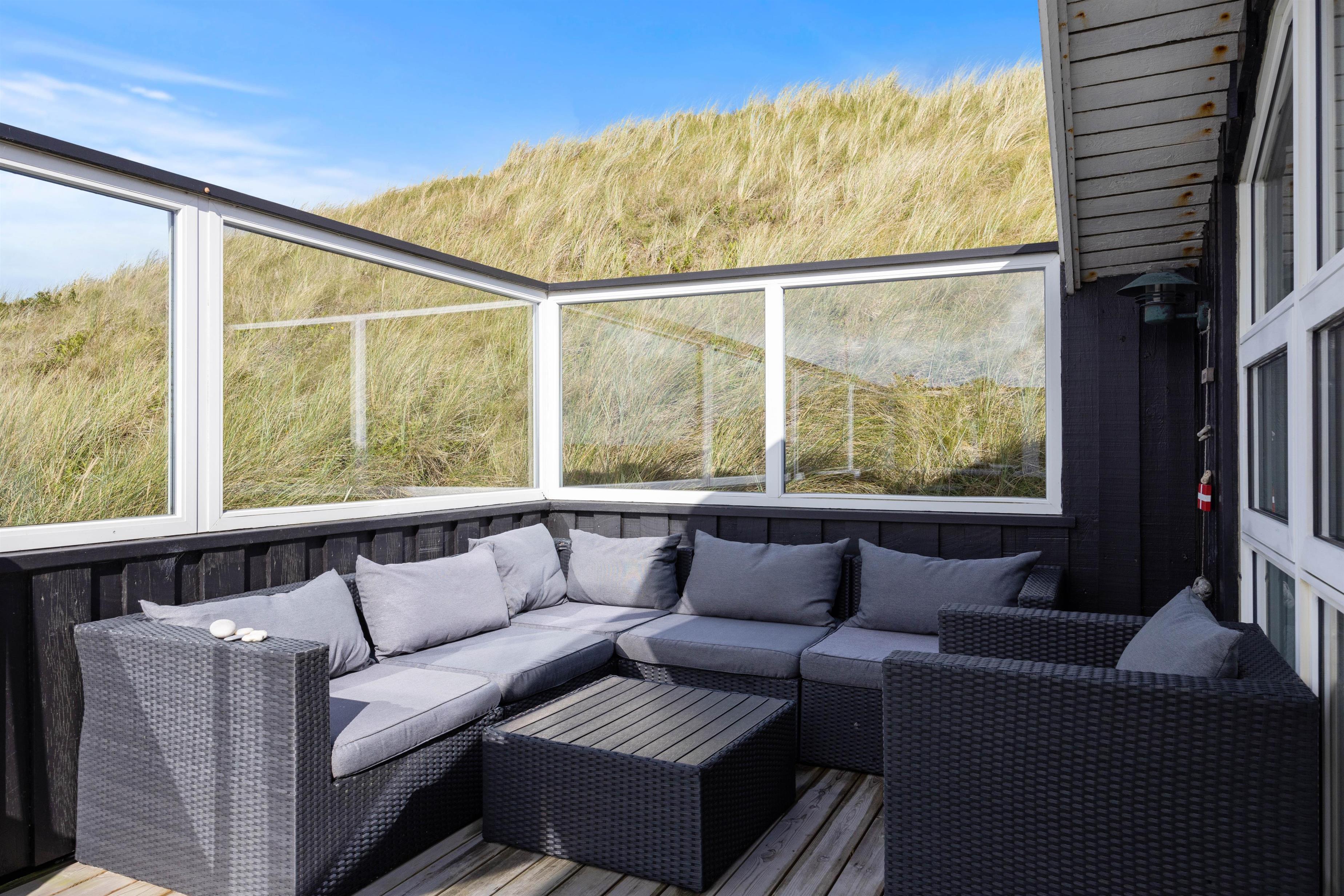 Fra sommerhusets opholdsstue har I direkte adgang til terrassen udenfor. Her kan I rigtig sidde og slappe af og nyde udsigten. I den ene ende af terrassen er etableret en dejlig lækrog, som giver læ for Vestenvinden. På terrassen er det også oplagt at grille et måltid mad over grillen eller blot dase i solvognene mens I nyder det gode vejr. Eller bare slapper af med en kop varm kaffe.