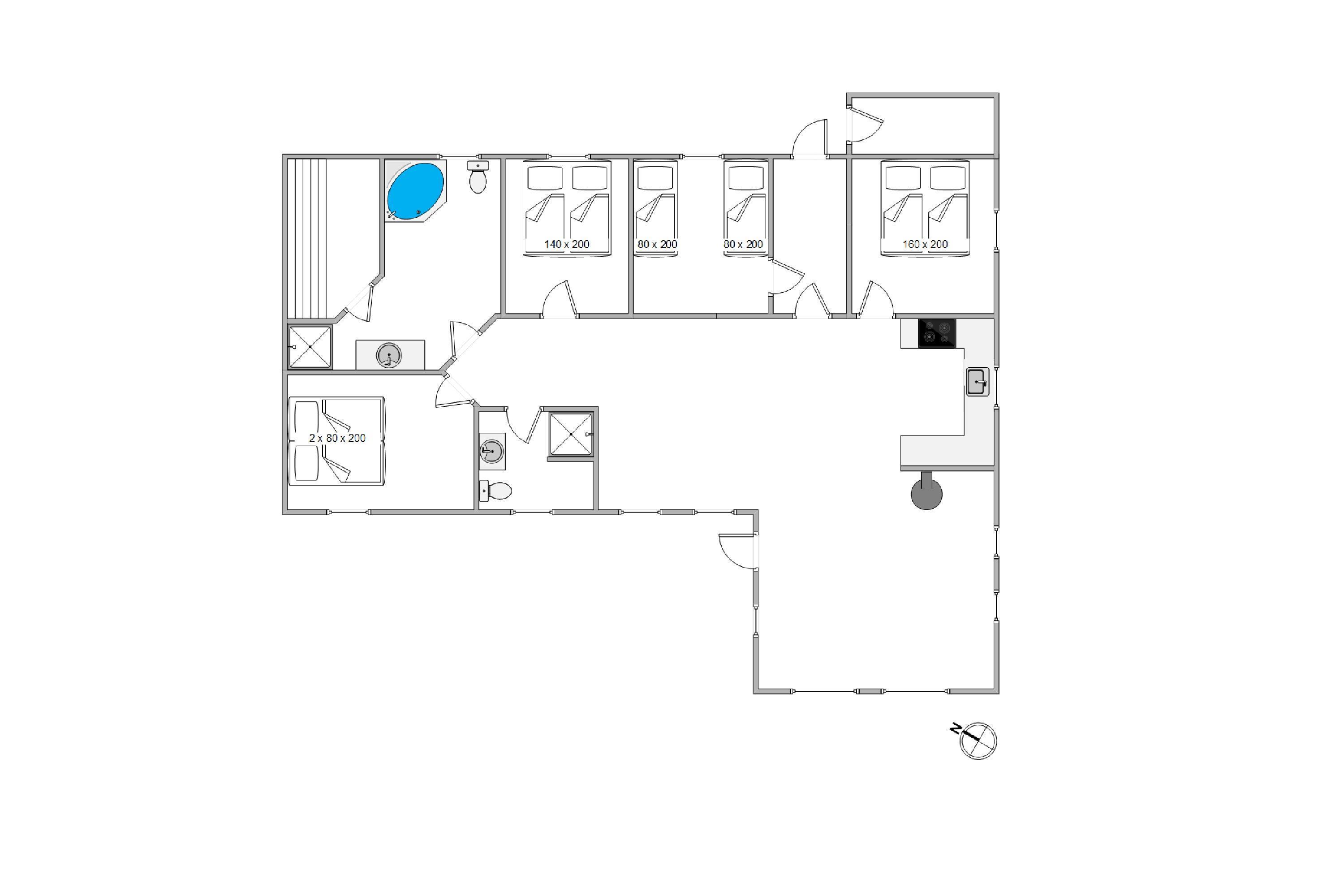 Feriehuset danner de bedste rammer om en skøn ferie, hvor du kan slappe af og nyde tiden med familien eller vennerne. Her er der lavet to rigtig dejlige badeværelser, hvilket altid er praktisk og sikrer at I undgår lange køer om morgenen. På det ene af badeværelser finder I både et spabad og en sauna, hvor I kan sætte jer godt tilrette og bare slappe helt af, mens ungerne hygger sig med et spil.