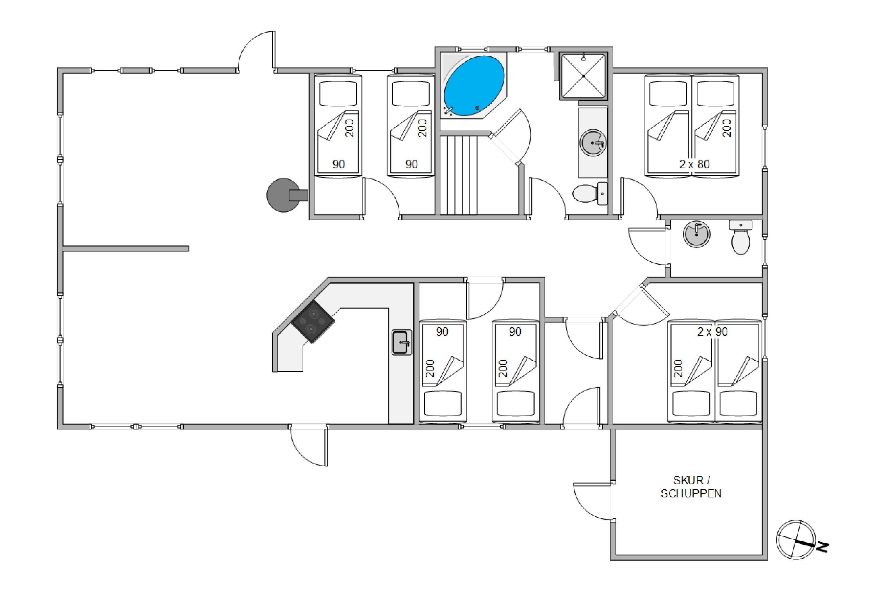 Sommerhuset kan huse op til 8 personer, der kan fordele sig på 4 værelser, hvor 2 af værelserne er med dobbeltseng og de sidste 2 værelser er med 2 enkeltsenge. For at passe til resten af husets størrelse, er sommerhuset udstyret med et stort badeværelse og et ekstra gæstetoilet - Så undgår I de alt for lange køer på morgenerne. Det ene badeværelse gemmer også på nogle dejlige overraskelser. Her finder I nemlig både et spabad og en sauna, så her kan I virkelig nyde ferien og tage et smut i "hjemmewellness".