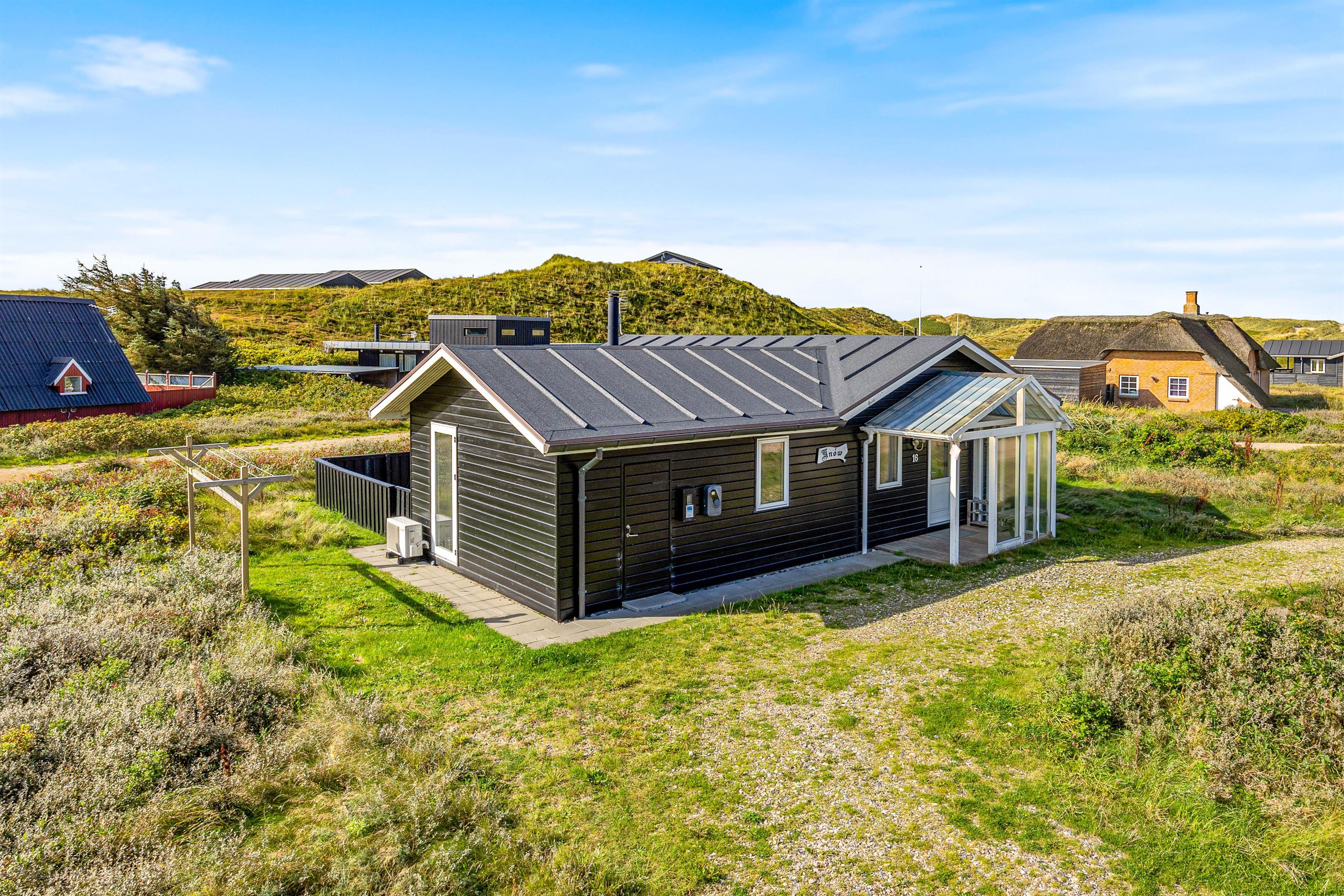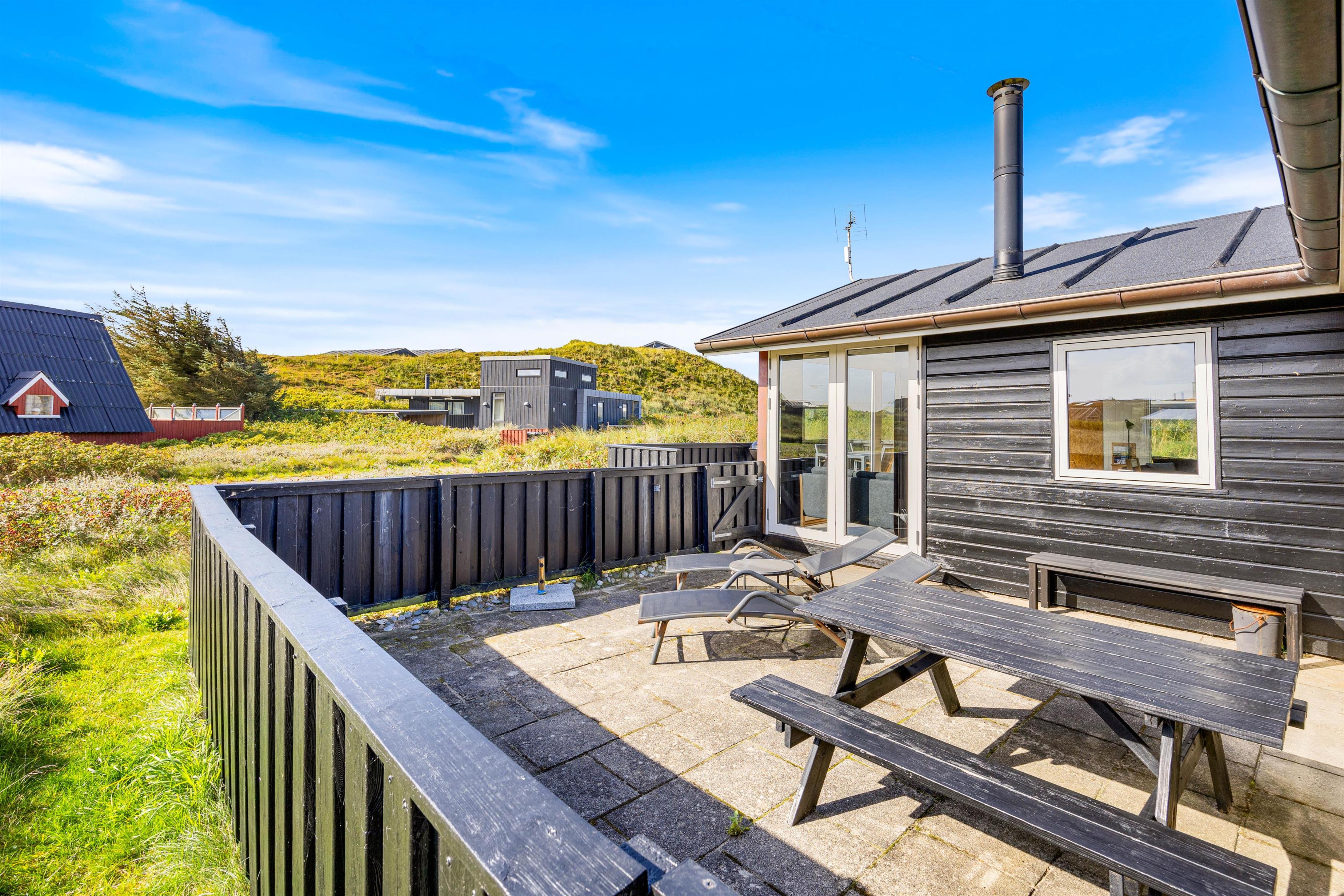 Fra stuen har I udsigt til det flotte udeområde, som omkranser huset. Herfra har I også direkte udgang til husets terrasse, som er dejligt afskærmet. Her kan I sidde ugeneret og læse en god bog eller bare nyde stilheden omkring jer. På terrassen finder I havemøbler, parasol, liggestole og grill til fri afbenyttelse. Sommerhuset ligger i et fantastisk ferieområde med storslået natur omkring. Området indbyder til lange gåture i hedelandskabet og langs vandet, som ligger bare 300 meter fra huset.