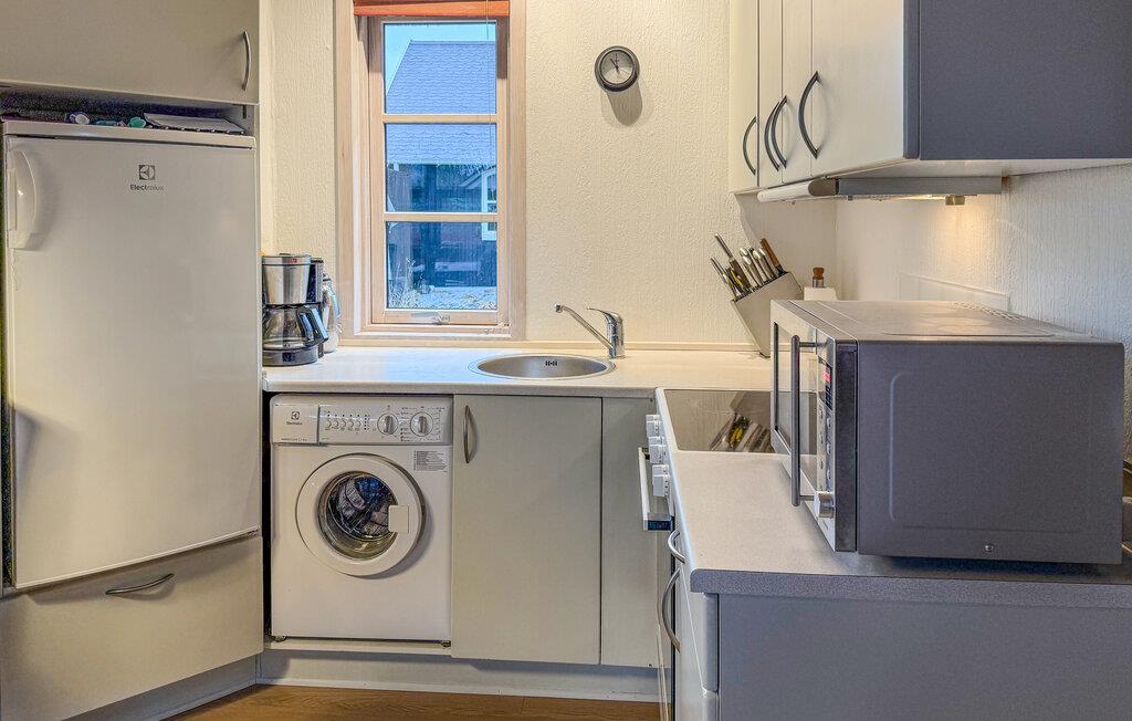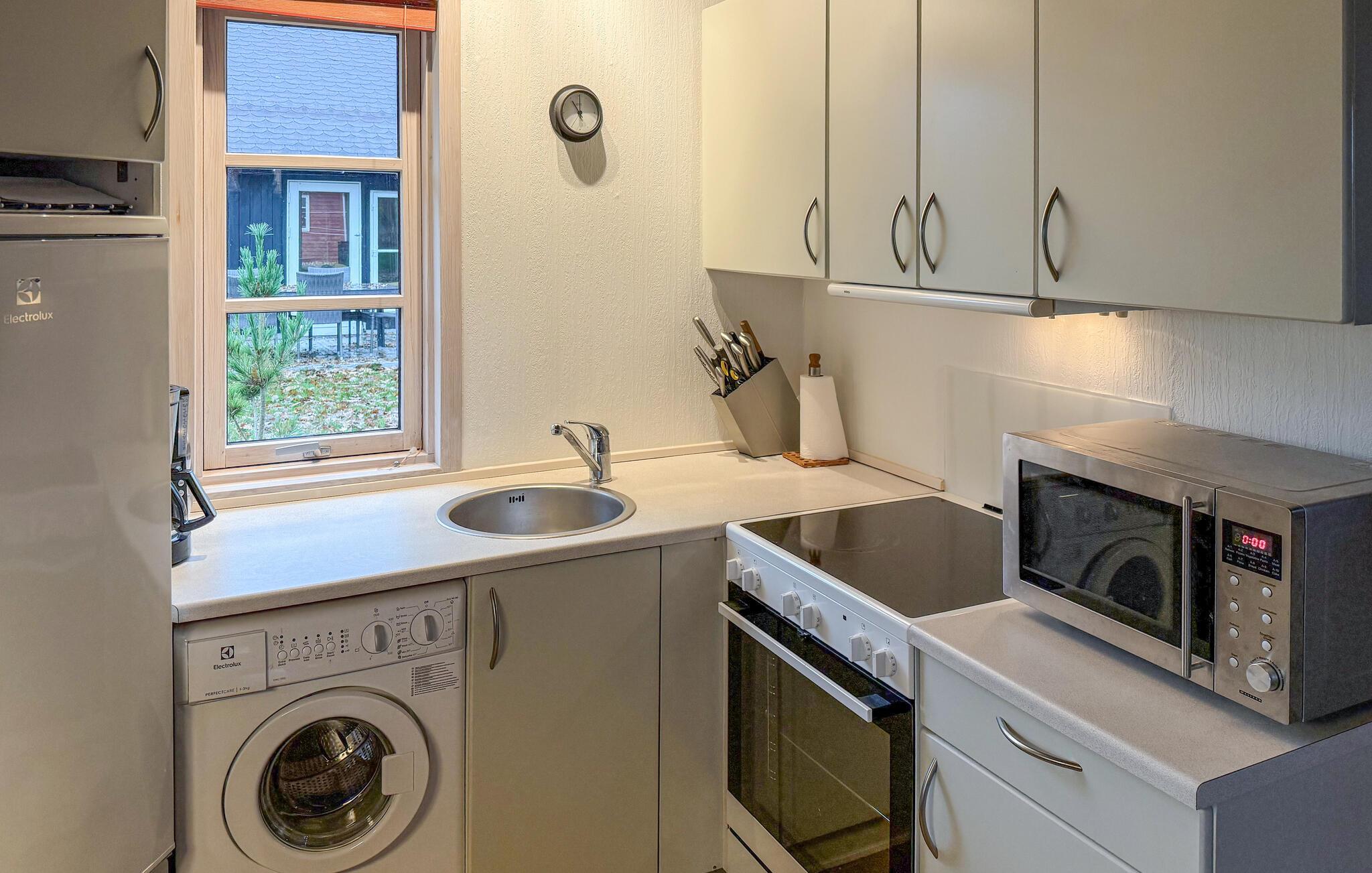 Glæd jer til et afslappende ophold i dette særlige feriehus, der med sin runde arkitektur og smukke indretning giver en helt unik ferieoplevelse. Nyd den lyse og velgennemtænkte planløsning. Det åbne køkken er praktisk udstyret, mens opholds- og spisestuen byder på komfortable stole, et fjernsyn og store vinduer, der lukker masser af lys ind. Hyg jer sammen om aftenen med et glas vin, og begynd dagen med morgenmad ved det runde spisebord.