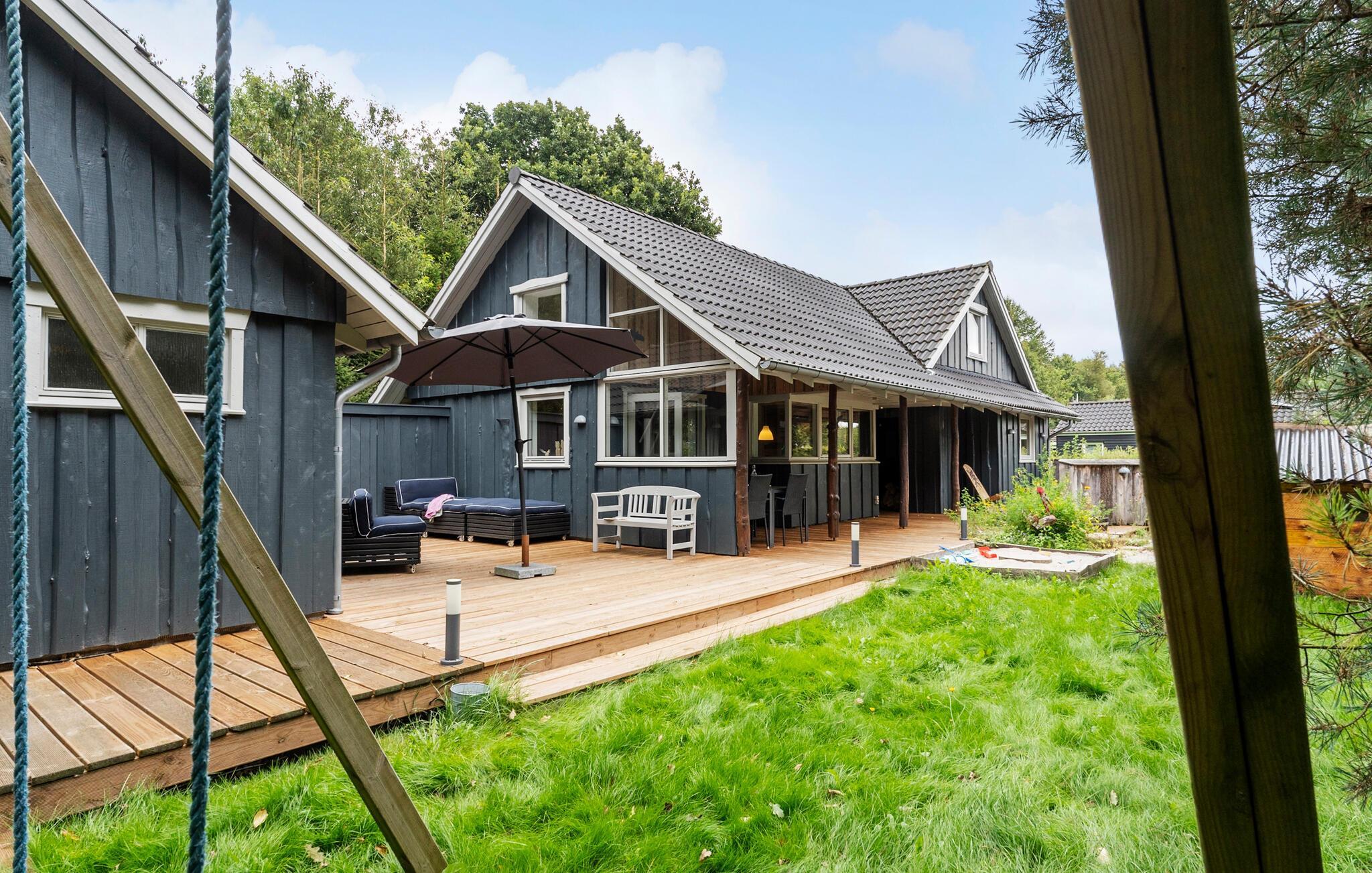 Rigtig flot sommerhus i to plan med et shelter samt bålplads på grunden. Her er der virkelig gjort noget for, at I kan nyde udelivet i fulde drag, og aktiviteter for de mindste er der naturligvis også tænkt på. Sommerhuset er praktisk indrettet med et godt køkken/alrum med brændeovn, gode soveværelser samt et pænt badeværelse. Ca. 500 m fra huset ligger en fiskesø, hvor I kan kaste snøren ud og forsøge at fange jeres egen aftensmad.