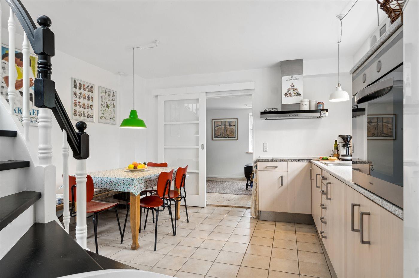 Køkkenet er udstyret med 1 køleskab. Der er 4 keramiske kogeplader, varmluftovn samt opvaskemaskine.