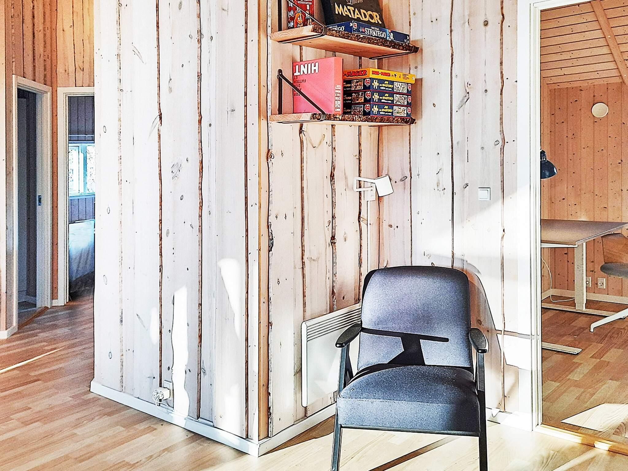 Sommerhuset indeholder stort åbent køkken forsynet med et almindeligt bredt udvalg af køkkenredskaber til brug for madlavning og bagning. En stor opholds- og spisestue med god brændeovn. I stuen er der smart-TV med airplay, som er tilsluttet chromecast med mulighed for at streame tv, film eller musik. Der er danske og tyske luftkanaler. Musik kan afspilles til en transportabel bluetooth højttaler. Badeværelset har gulvvarme, og der er adgang til spabad og sauna. 2 værelser identisk indrettet med brede dobbeltsenge og skabsplads. Et værelse med køjeseng, og mulighed for hjemmearbejdsplads, hvor der kan bruges hævesænke bord samt indstillelig konferencestol. Der er et udvalg af forskellige spil, bl.a. bræt - og puslespil til både voksne og børn. Husets indretning er moderne.