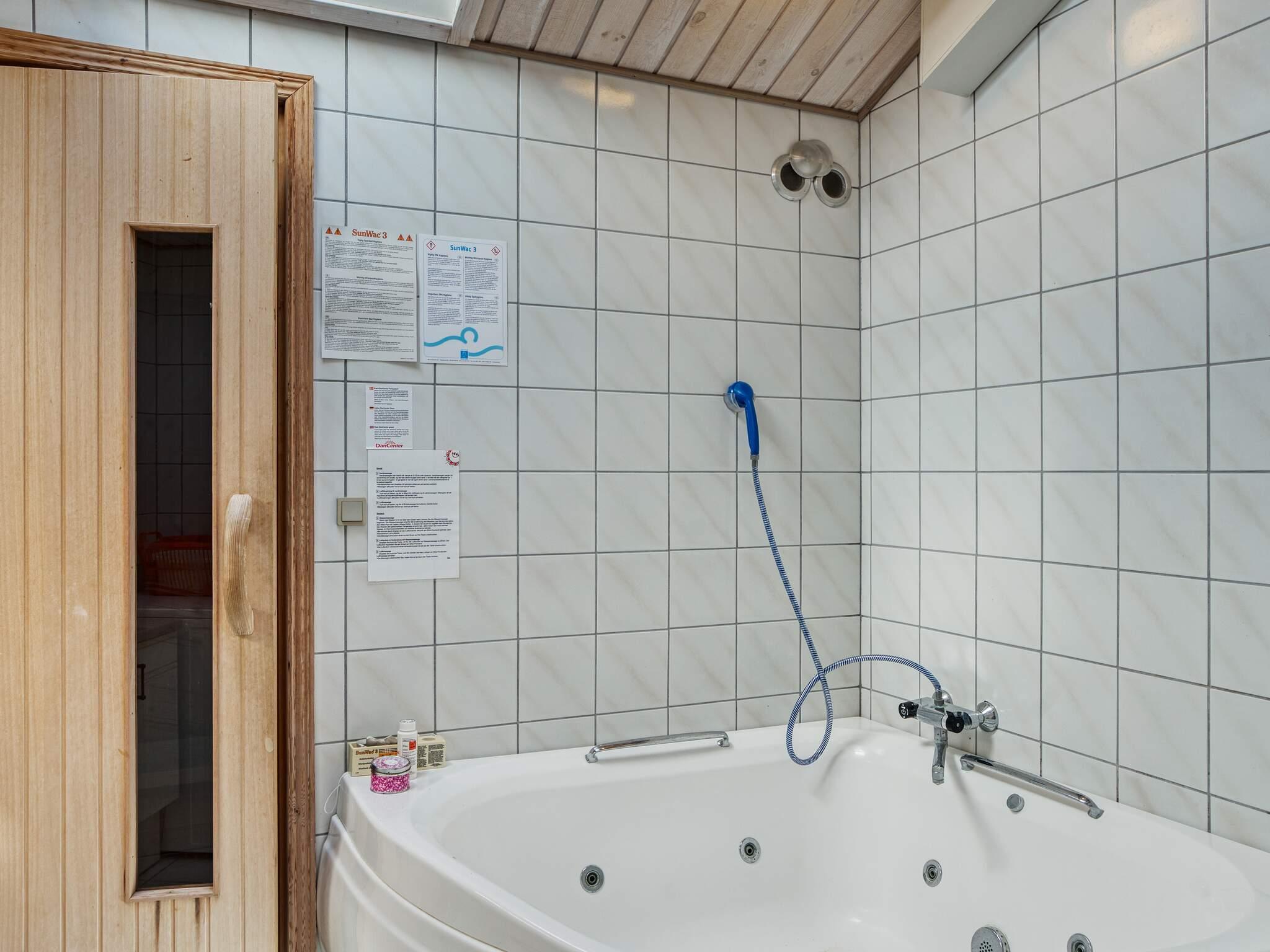 Huset er rummeligt og hyggeligt med en stue med brændeovn og et langt spisebord, perfekt til familiemåltider eller sociale aftener. Der er også en vinterhave med sovesofa, rundt bord og stole, der giver ekstra plads til at slappe af indendørs. Ejendommen indeholder to badeværelser: et med bruser og toilet, og et andet med bruser, spabad, vaskemaskine og adgang til sauna, hvilket sikrer komfort for alle gæster.
