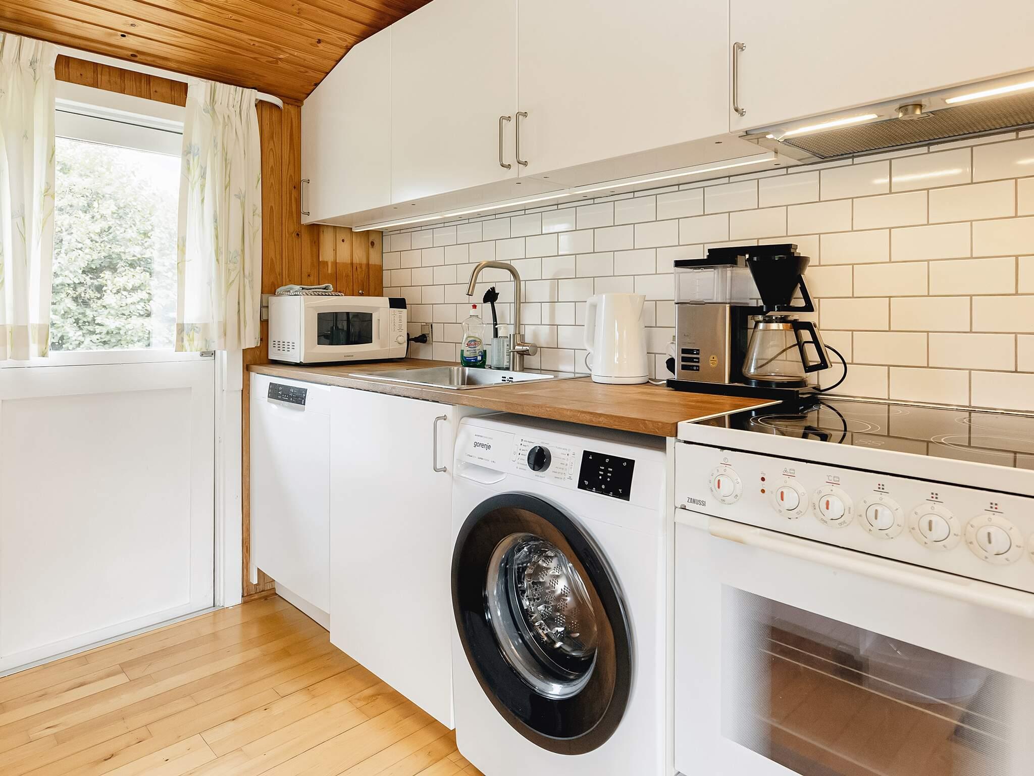 Køkkenafd.: El-komfur, køle-frys, mikroovn, emhætte, kaffemaskine, opvaskemask.