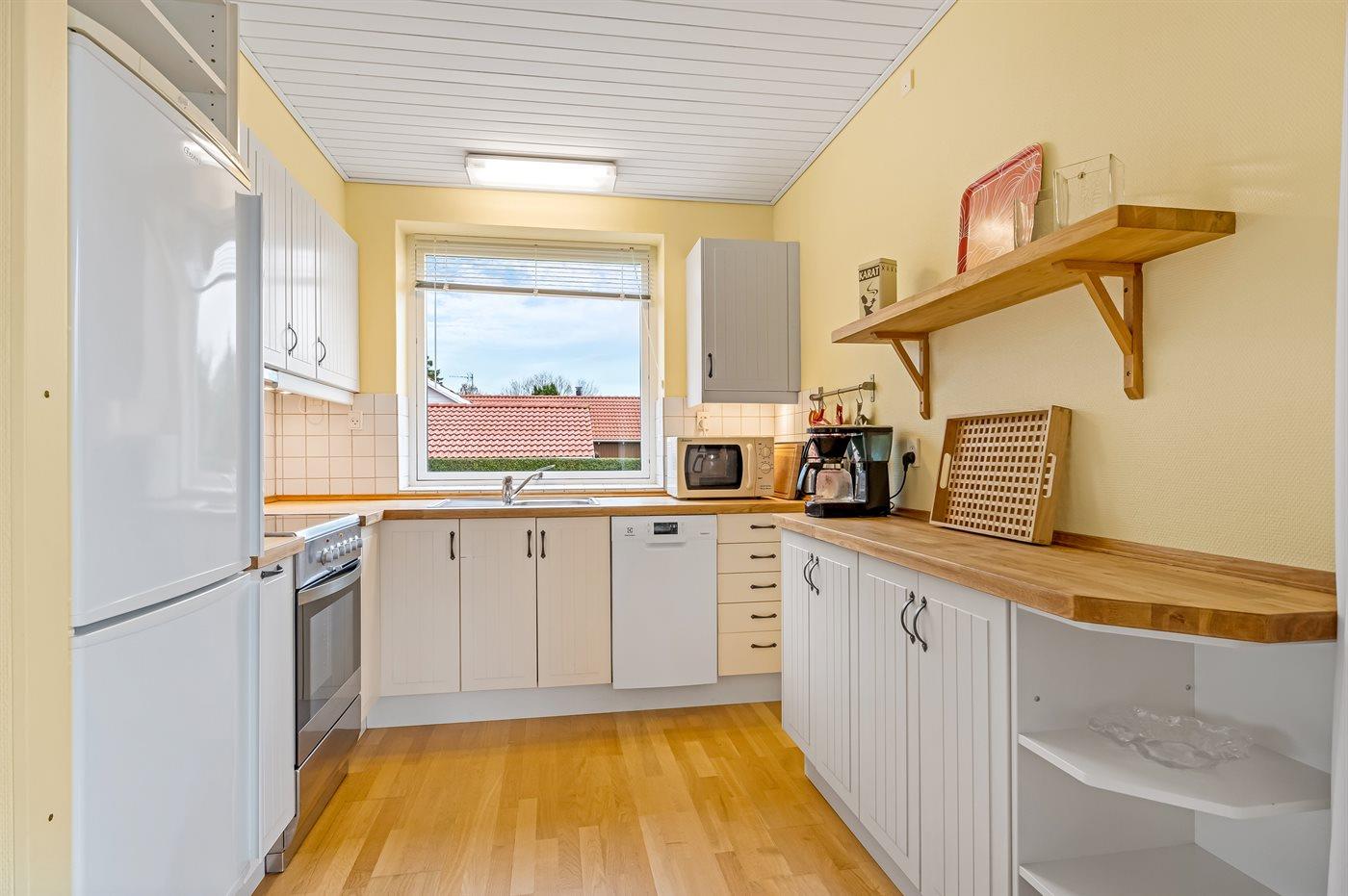Køkkenet er udstyret med 1 køleskab. Der er 4 keramiske kogeplader, varmluftovn, mikrobølgeovn samt opvaskemaskine.