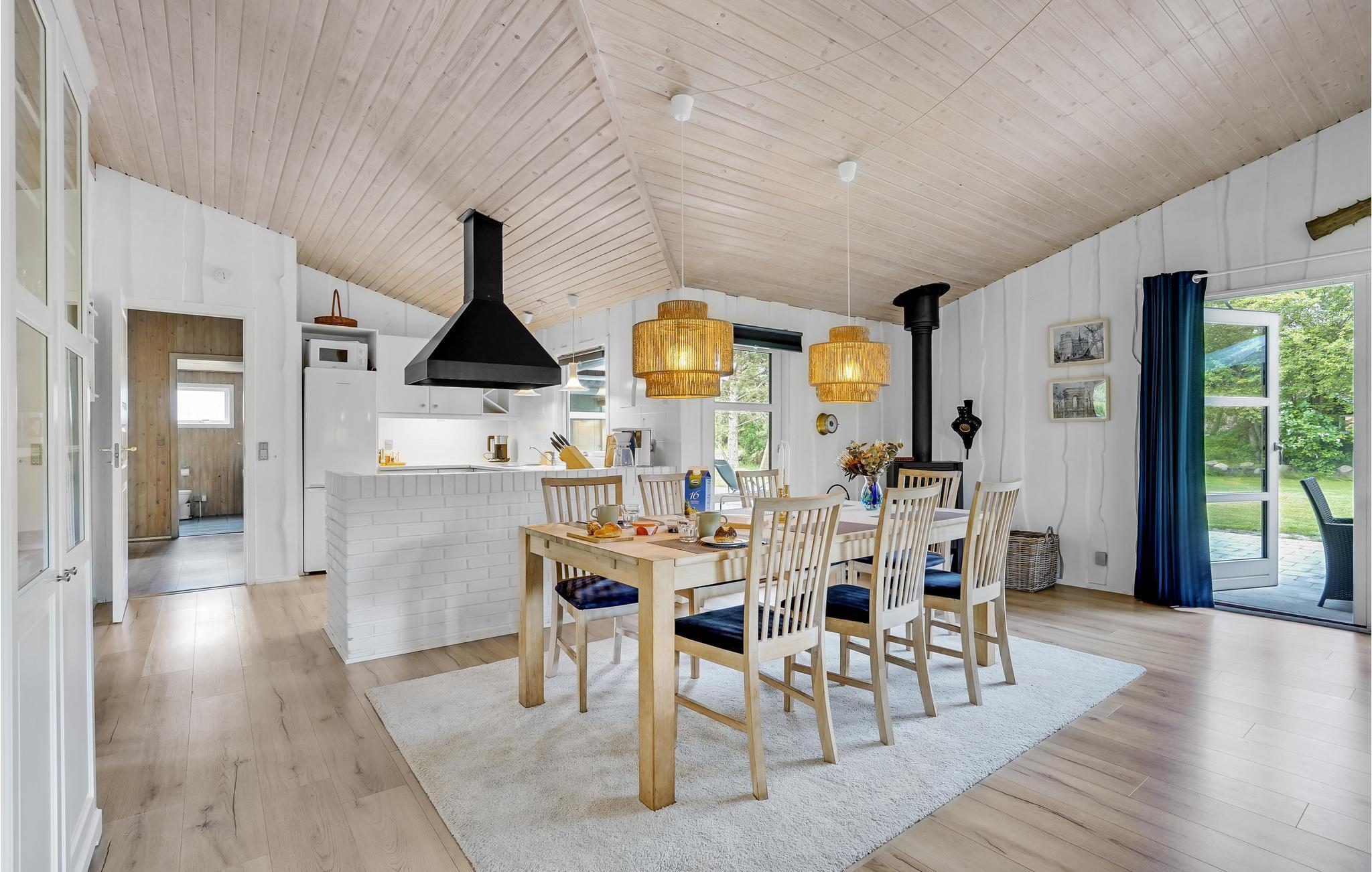 Kun fem minutters gang fra vandet, ligger dette lækre velindrettede og hyggelige luksushus af træ. Den meget store stue er indrettet med mange gode møbler, bordfodbold og brætspil, og køkkenet er veludstyret med alle tekniske hjælpemidler. I soveværelserne, der alle har dobbeltsenge, venter er god nattesøvn. I det ene af de to badeværelser står det seks pers. spabad, hvor I gennem de store glaspartier kan nyde årstiden udenfor. Her er der også mulighed for at gå i sauna.