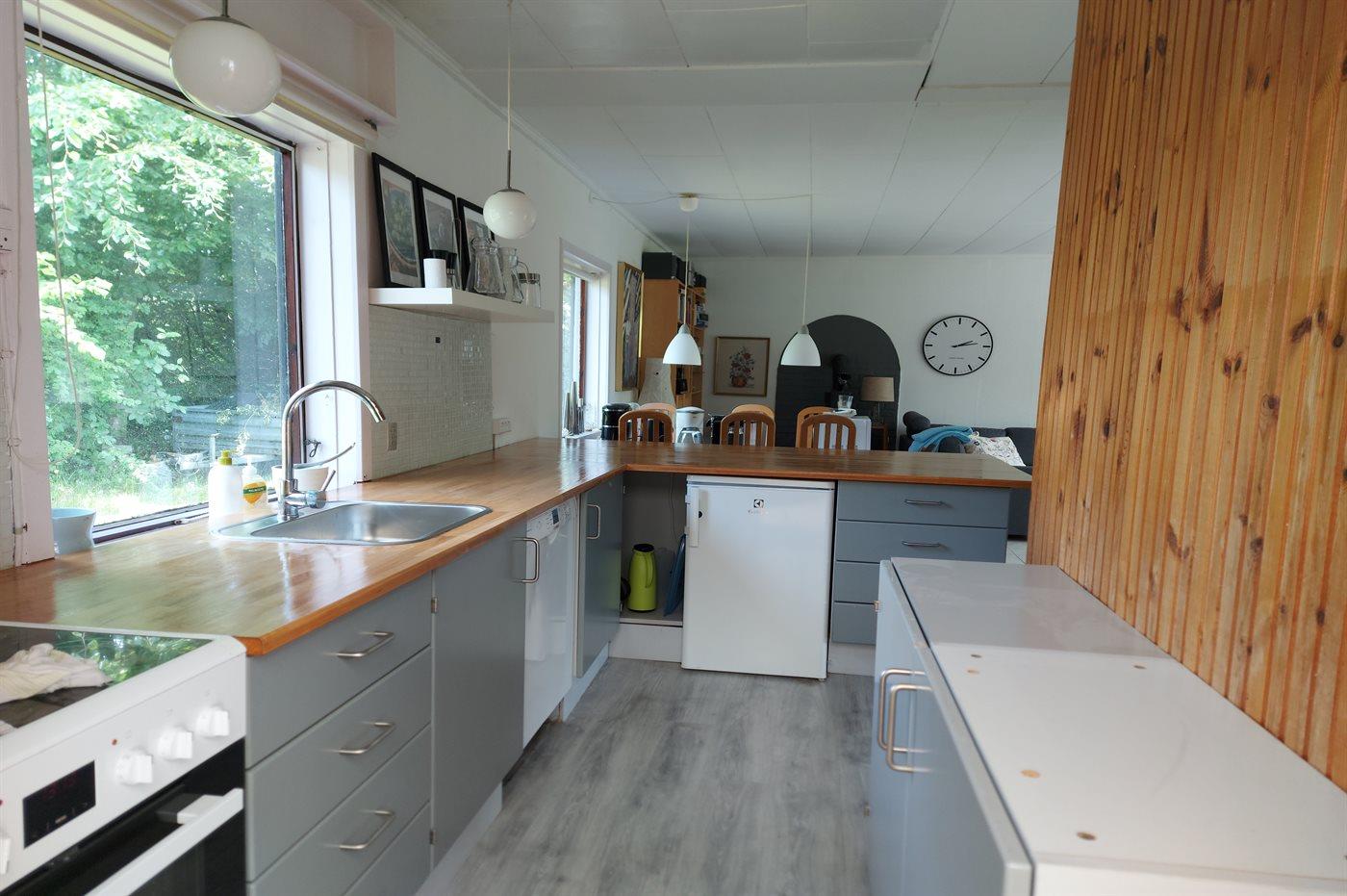 Køkkenet er udstyret med 1 køleskab. Der er 4 keramiske kogeplader, varmluftovn, mikrobølgeovn samt opvaskemaskine.