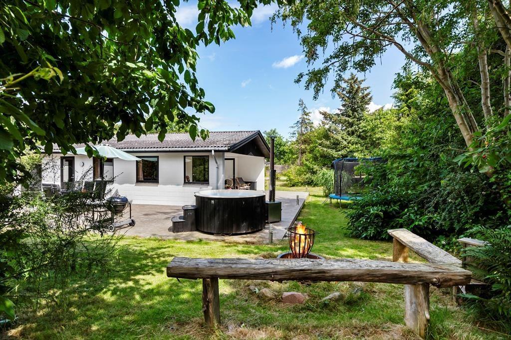 Sommerhuset er omgivet af en dejlig have, hvor både børn og voksne kan nyde naturen og slappe af. På den store terrasse, der delvist er overdækket, kan du nyde din morgenkaffe i solen eller samle familien til grillmiddag på lune sommeraftener. Haven byder også på en trampolin, hvor de yngste kan brænde energi af, og en bålplads, hvor I kan lave snobrød og riste skumfiduser over flammerne.