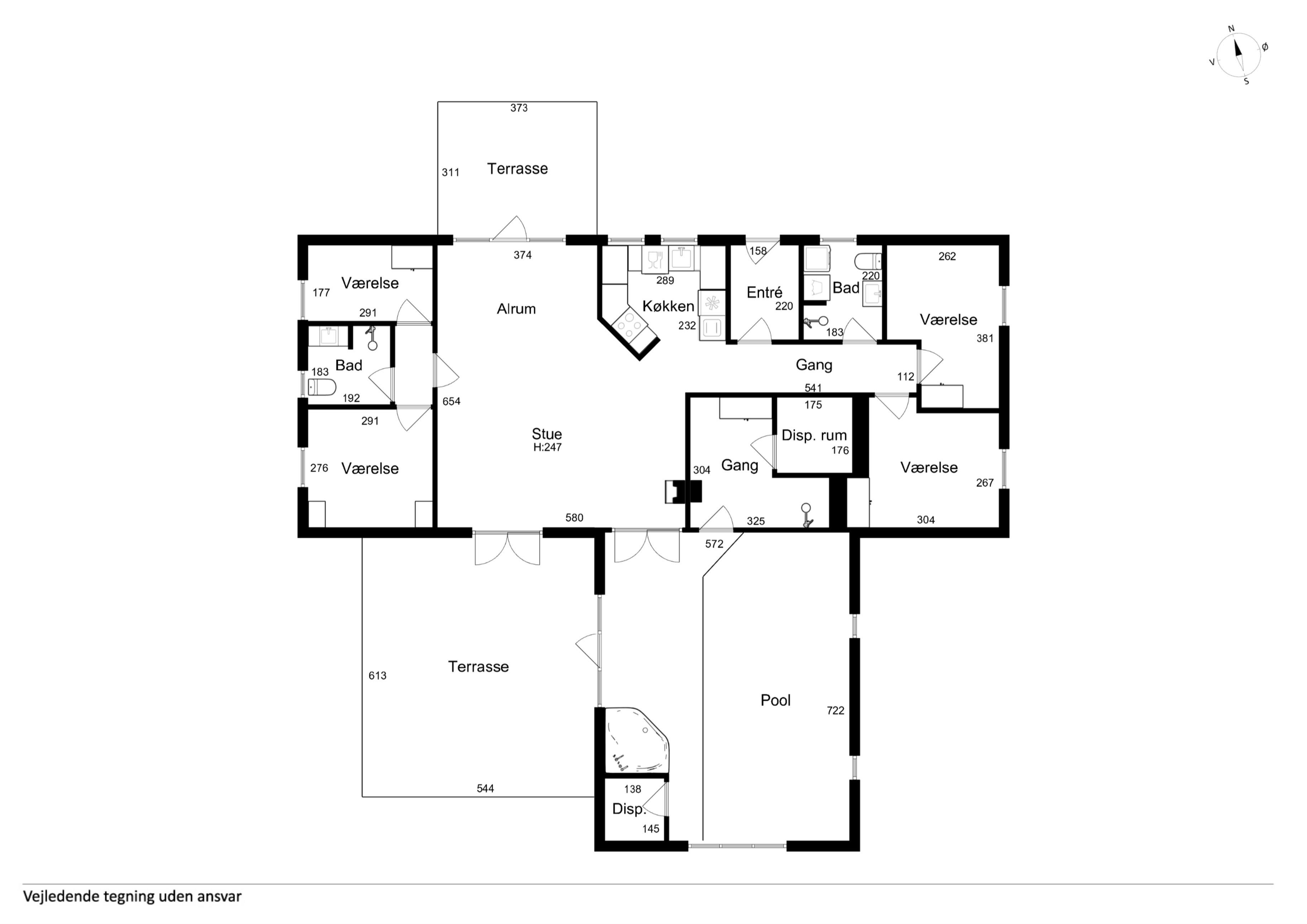 Swimmingpoolområdet er udstyret med gulvvarme og indbyder til både leg og afslapning. Der er fire soveværelser fordelt på forskellige sengetyper: to dobbeltsenge, to enkeltsenge og en køjeseng, samt en barneseng.