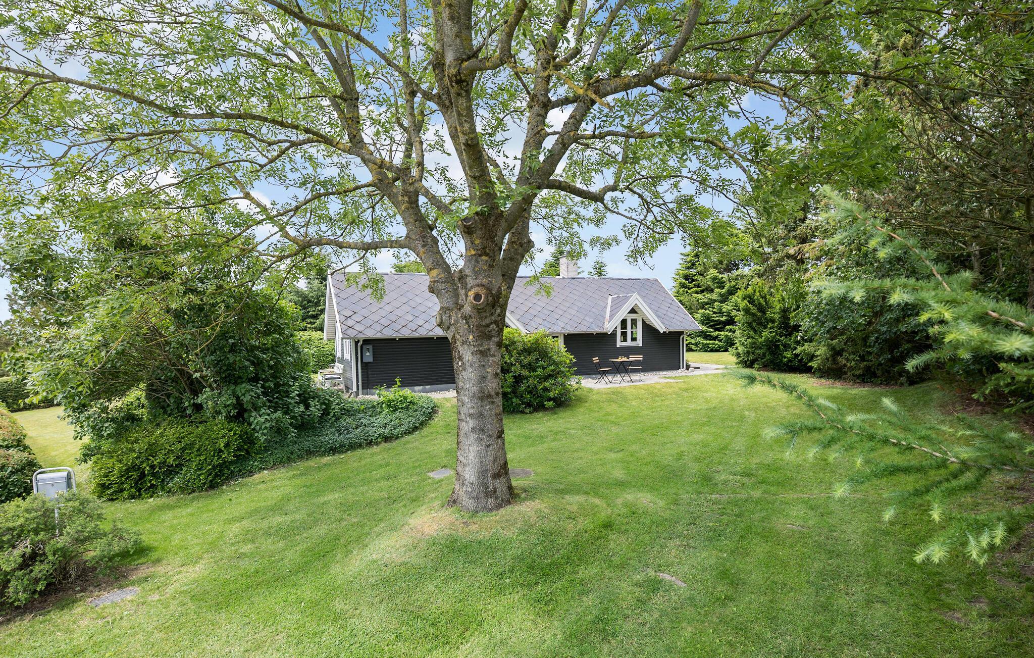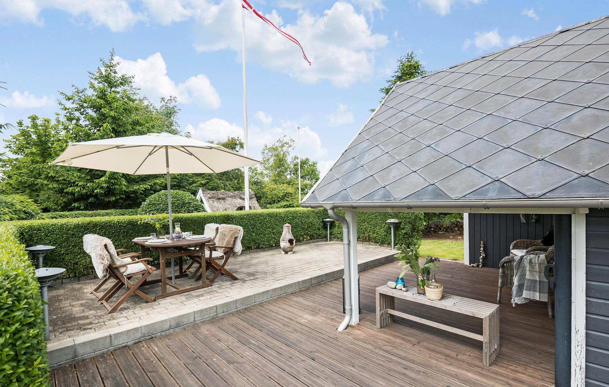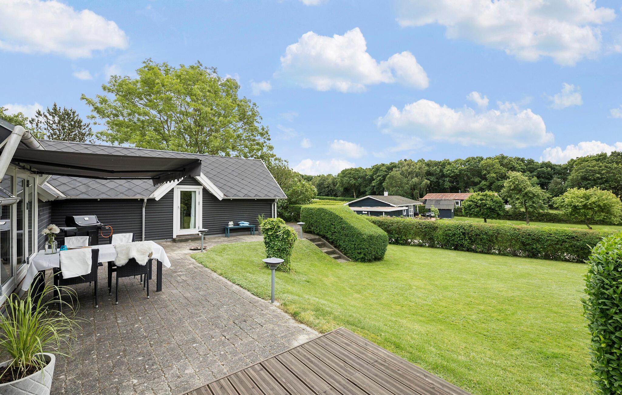 Hyggeligt sommerhus nær Limfjorden med stor terrasse og grøn have for afslappende feriedage.