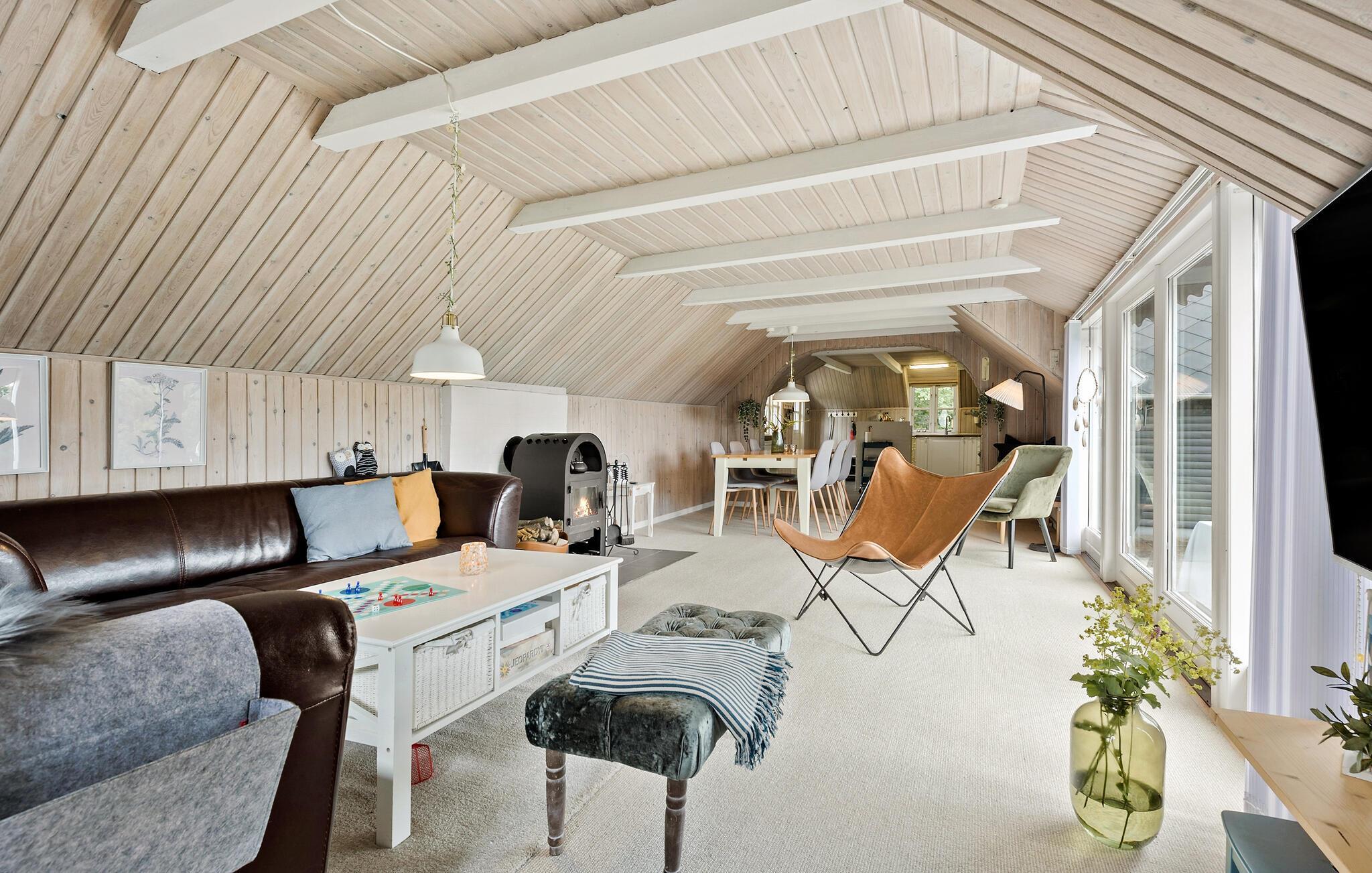 Velkommen til fred, ro og dejlige dage ved Limfjorden. Her ligger dette hyggelige sommerhus, som kan blive rammen om nogle afstressende feriedage. Begynd dagene med morgenmad under parasollen på den rummelige terrasse, hvor I sidder ud til en grøn, velplejet have. I kan også dække op til dagens måltider ved spisebordet indendørs og nyde husets indbydende detaljer. Husets træloft tilfører noget særligt til rummet. Læn jer tilbage i de komfortable sofaer, tænd op i brændeovnen og fyld aftenerne med brætspil, film og gode bøger.
