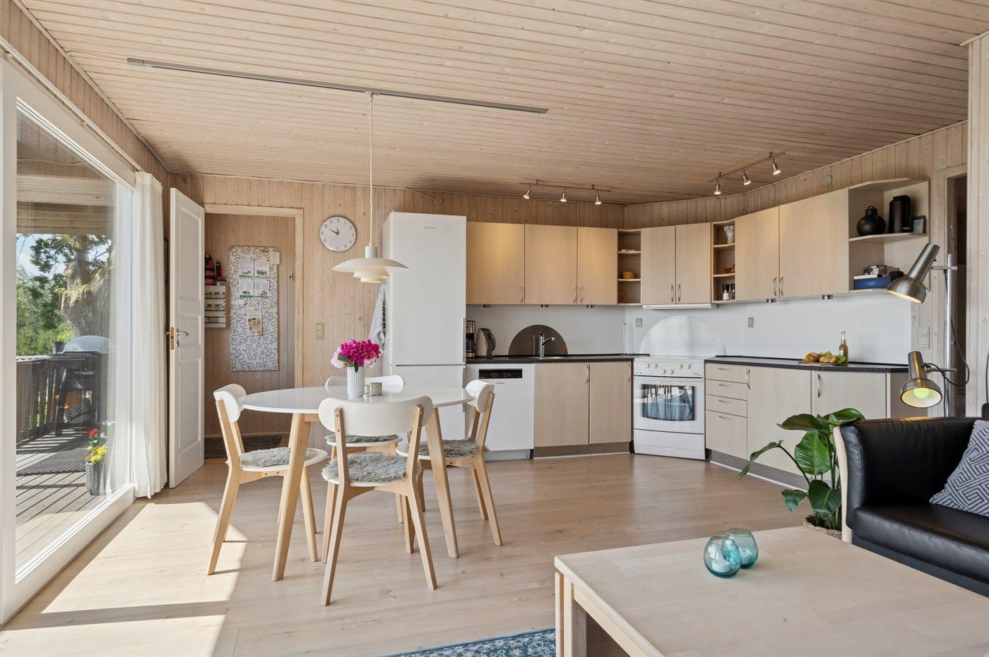 Køkkenet er udstyret med 1 køleskab. Der er 4 keramiske kogeplader, varmluftovn, mikrobølgeovn samt opvaskemaskine Der er gulvvarme i køkkenet.