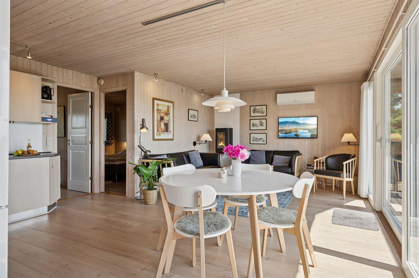 Indvendigt fremstår huset i god stand med en rigtig god planløsning, og er dermed oplagt til f.eks. en familie med 2-3 børn eller ét par, som ønsker at holde ferie i disse fantastiske omgivelser. Husets hjerte er det dejlige åbne køkken/alrum, som er integreret i stuen. Herfra kan du nyde den flotte udsigt og der er direkte adgang til den skønne terrasse.