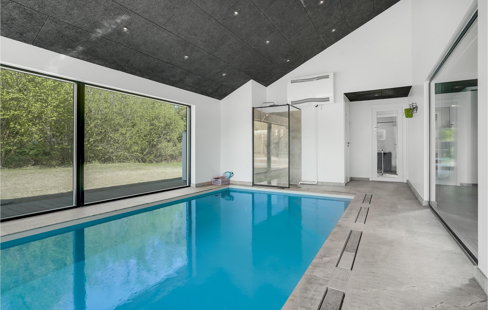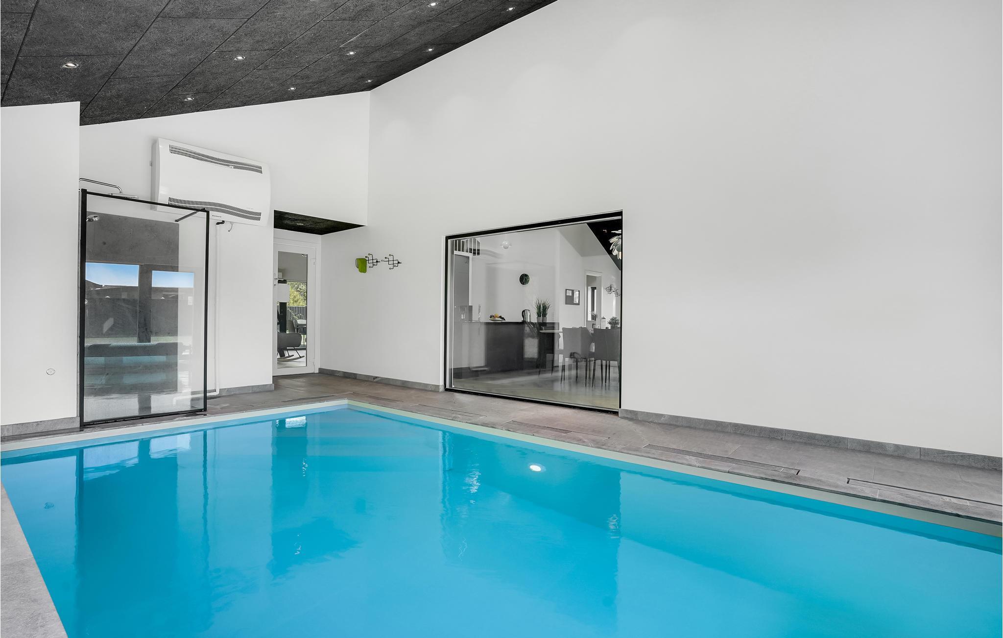 Luksuriøst feriehus nær Hvidbjerg Strand med indendørs pool, udendørs spabad og moderne faciliteter.