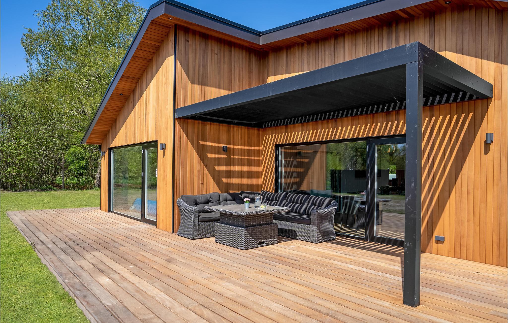 Overdådigt feriehus med pool og udendørsspa i et lækkert, moderne design, beliggende nær stranden.