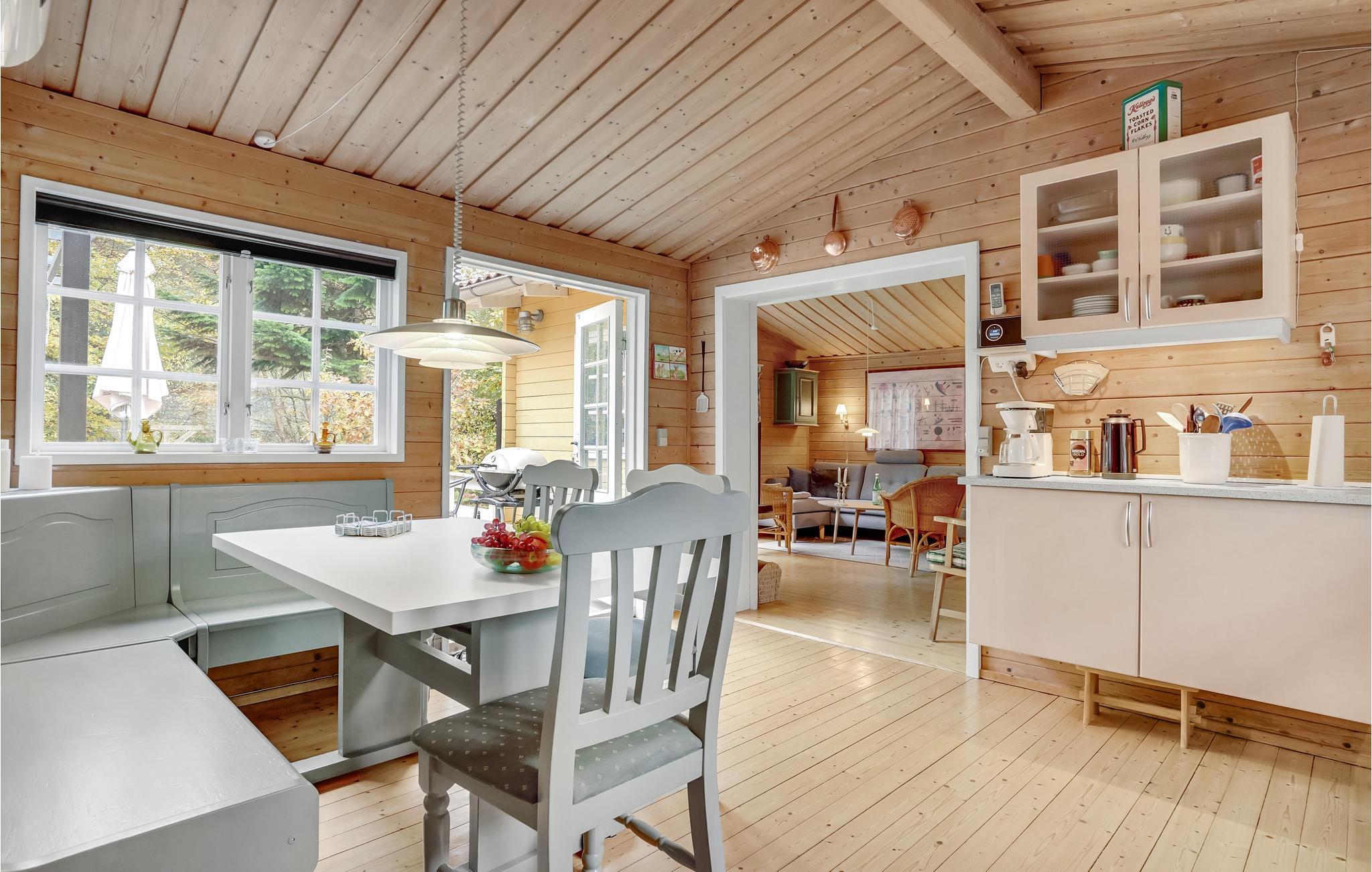 Kun få hundrede meter fra fjorden finder I dette indbydende træhus på en dejlig naturgrund. Indenfor venter lyse, praktisk indrettede værelser og en fredelig atmosfære på jer. Tilbring hyggelige timer med jeres kære i stuen og varm jer foran brændeovnen på kølige aftener. Når vejret er godt, inviterer terrassen til afslappende dage og stemningsfulde aftener.