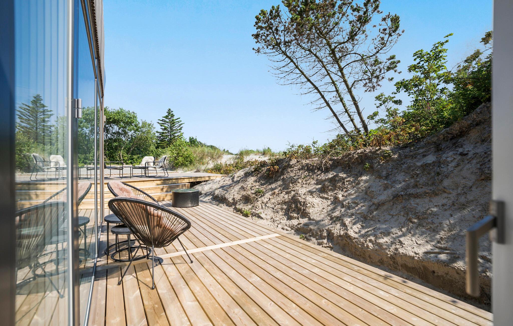 Udeområdet er tilsvarende dejligt. Den store træterrasse ligger smukt omgivet af klitterne og bliver jeres anden stue, når vejret er godt. Begynd dagen her med en god kop kaffe, indsnus den friske luft og nyd udsigten til fjorden, inden I trasker ned for en frisk dukkert.