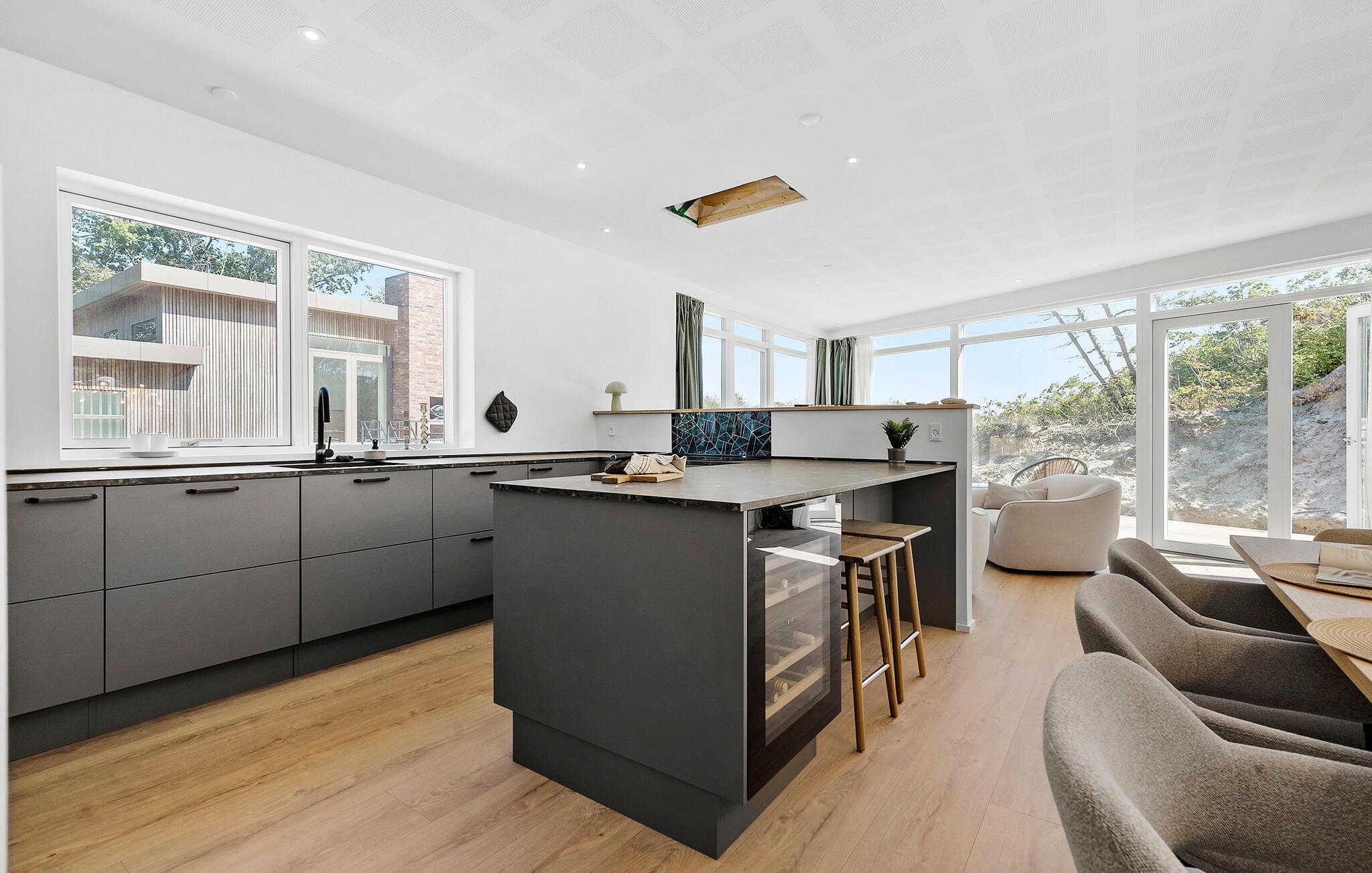 Hvis I skal forkæle familien med et ekstraordinært lækkert ophold i virkelig dejlige omgivelser, er dette flotte hus ved Hvidbjerg det helt rette valg for jer. Indretningen fremtræder virkelig flot med materialer af høj kvalitet, gennemtænkte rumløsninger og store vinduespartier, der giver lækre lysindfald og en skøn udsigt til det grønne. Køkkenet er moderne og fuldt udstyret, så lad blot familiens kokke kræse om livretterne, inden der dækkes op til aftensmad med udsigt til klitterne. Rund aftenen af i stuen med et glas vin, snacks og en god film på tv'et, mens I lægger planer for de kommende dage.